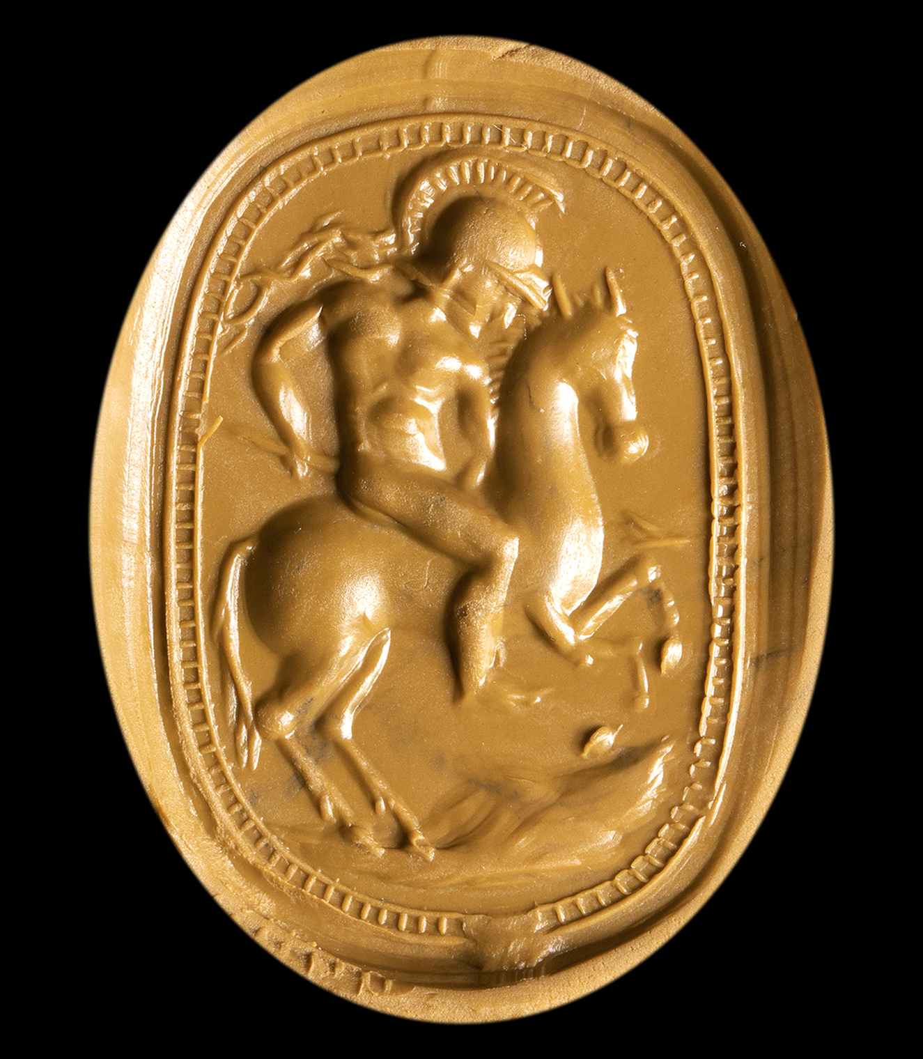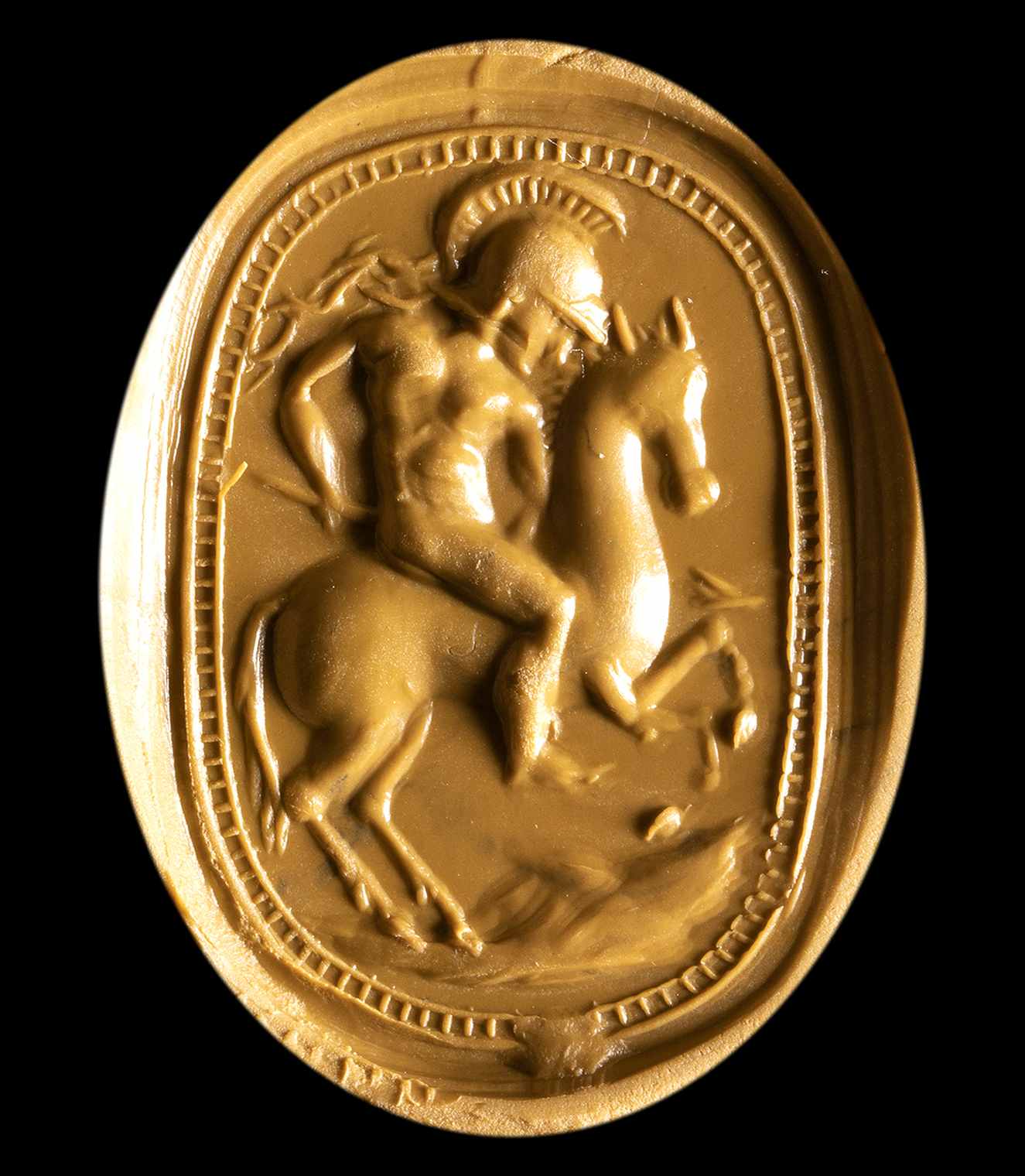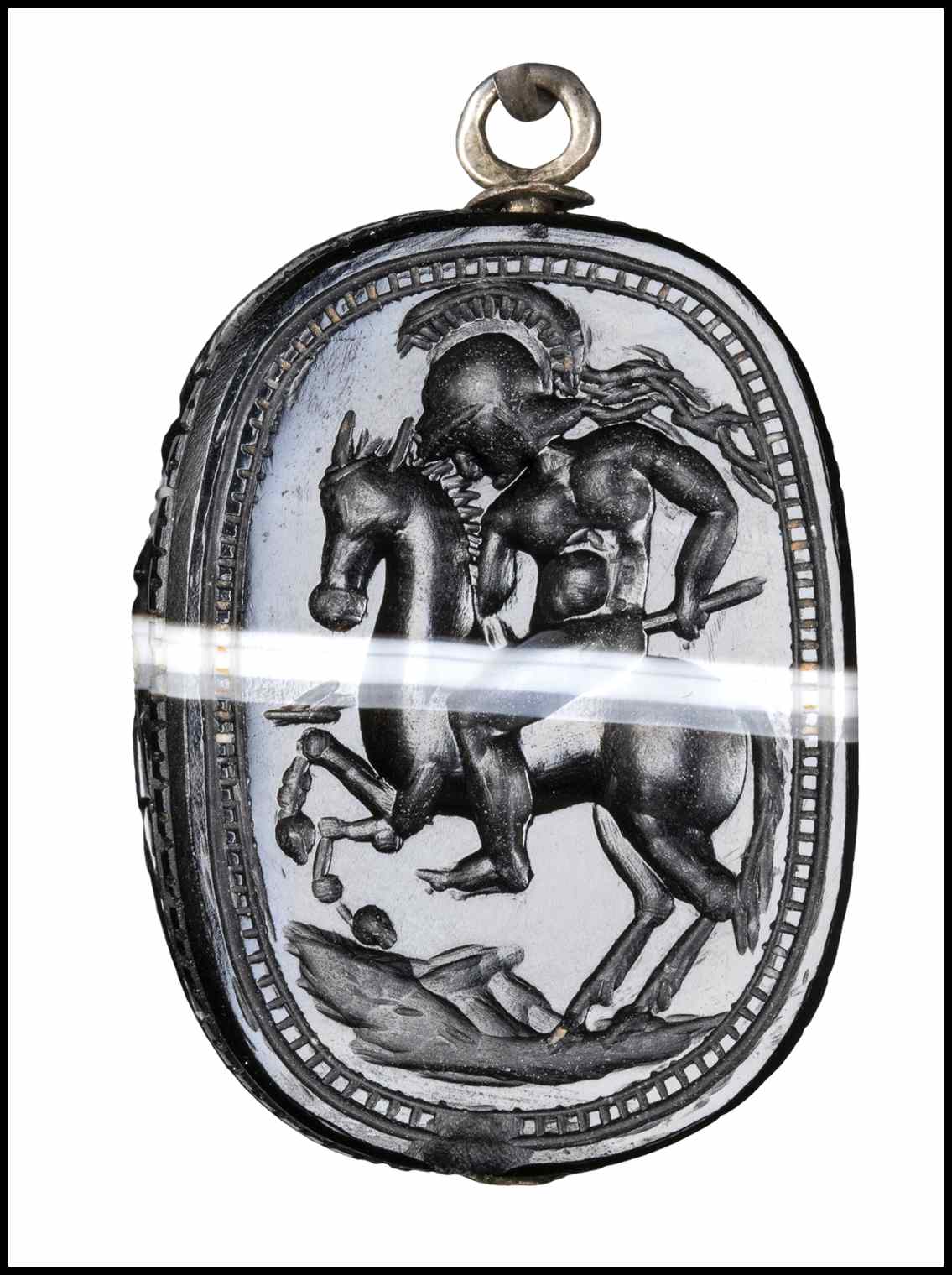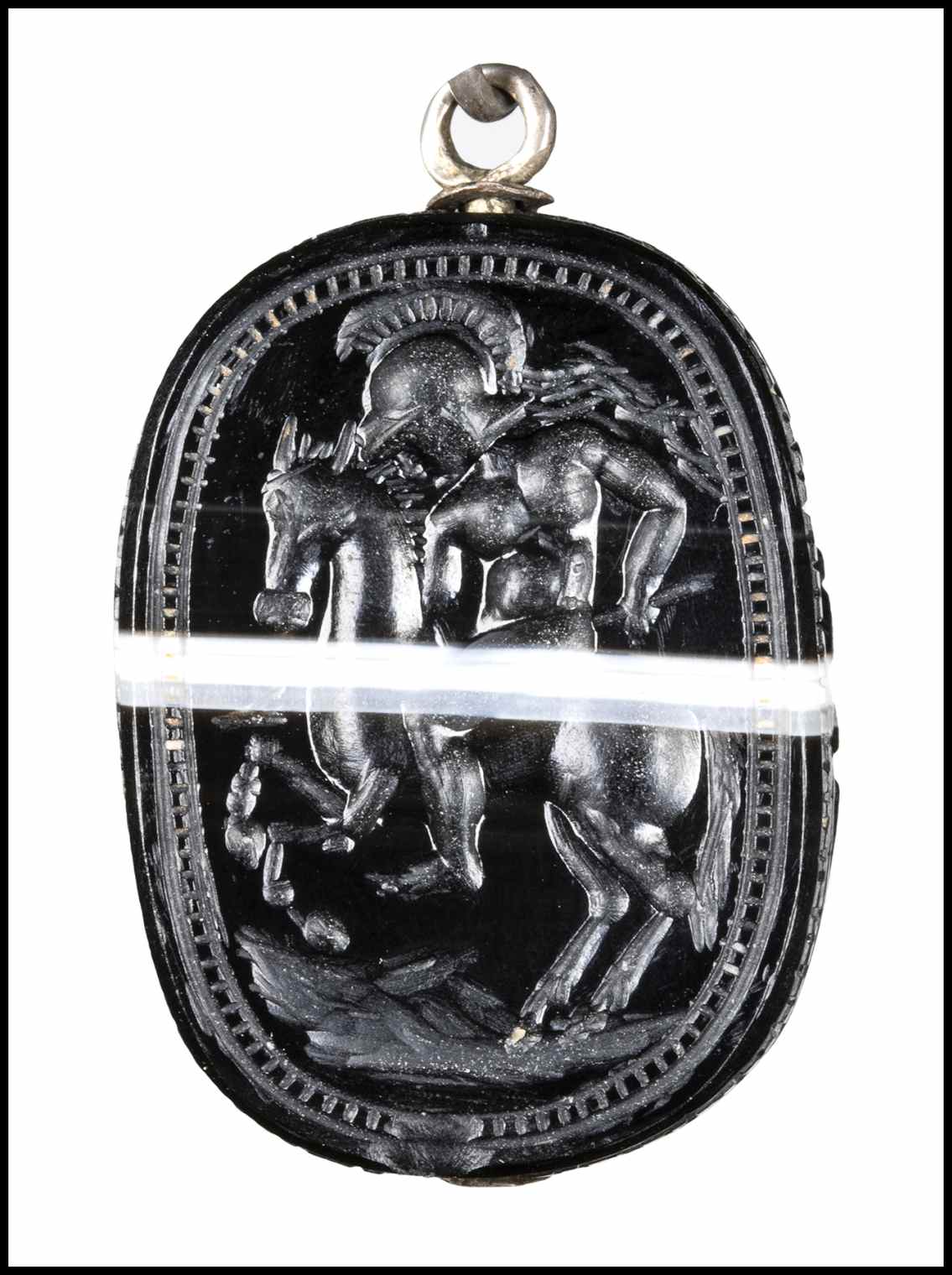 Pierced lenghtwise. The back is carved in a naturalistic way. The reverse is engraved with a naked warrior riding an horse to the left. Hatched border. Chips on the edge. Typical of the Etruscan Revivals scarabs production.