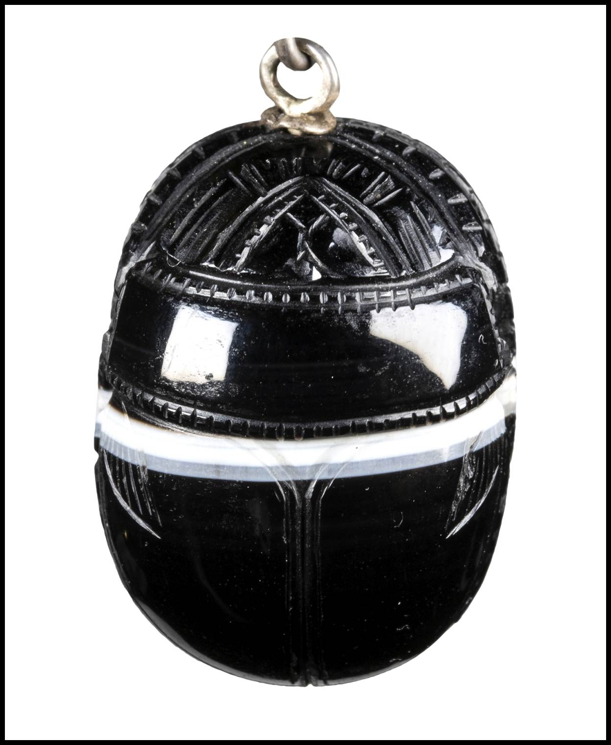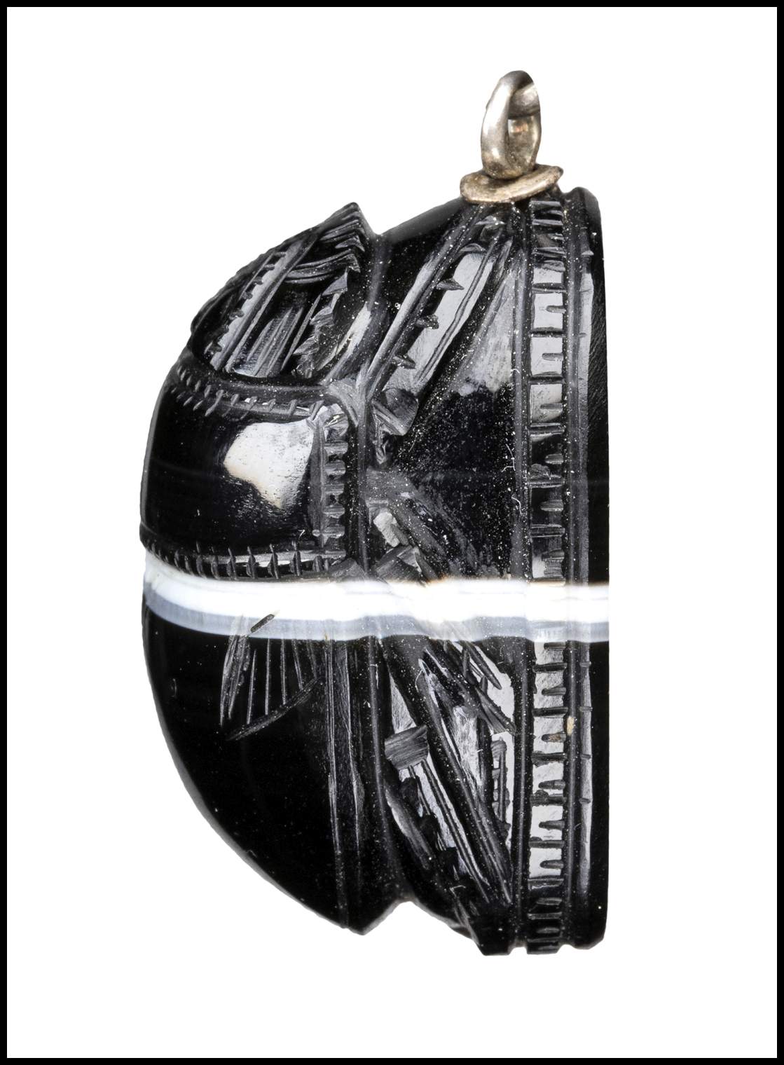 A LARGE REVIVAL ONYX ENGRAVED SCARAB. HELMETED WARRIOR ON A HORSE.