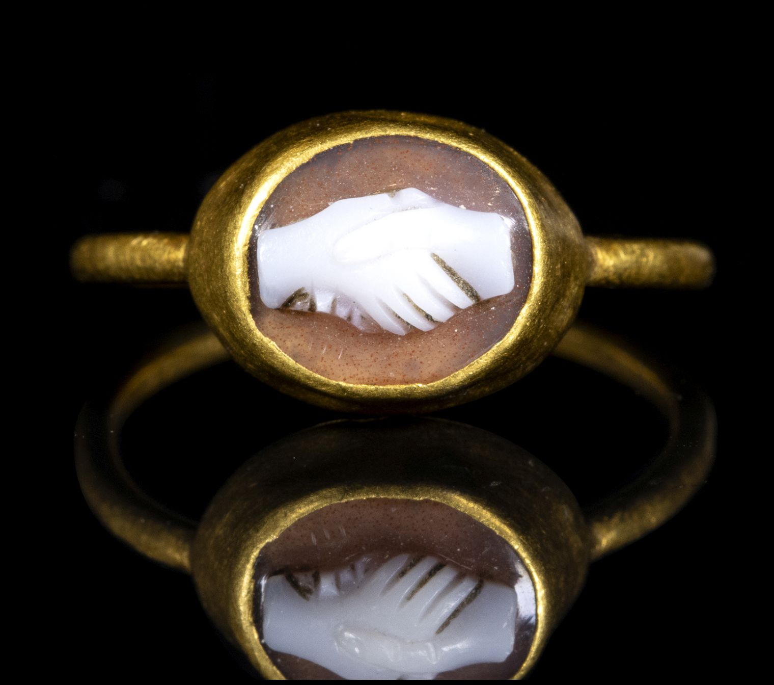 The thin rounded hoop is surmounted by a high oval box-setting with an agate cameo of Dextrarum Iunctio. Very popular subject during the Roman Age, this effigy represents the marriage union or political alliance.