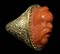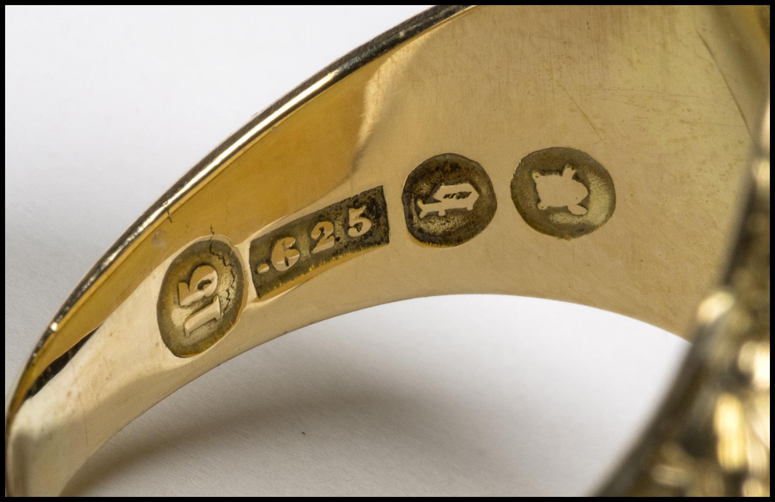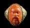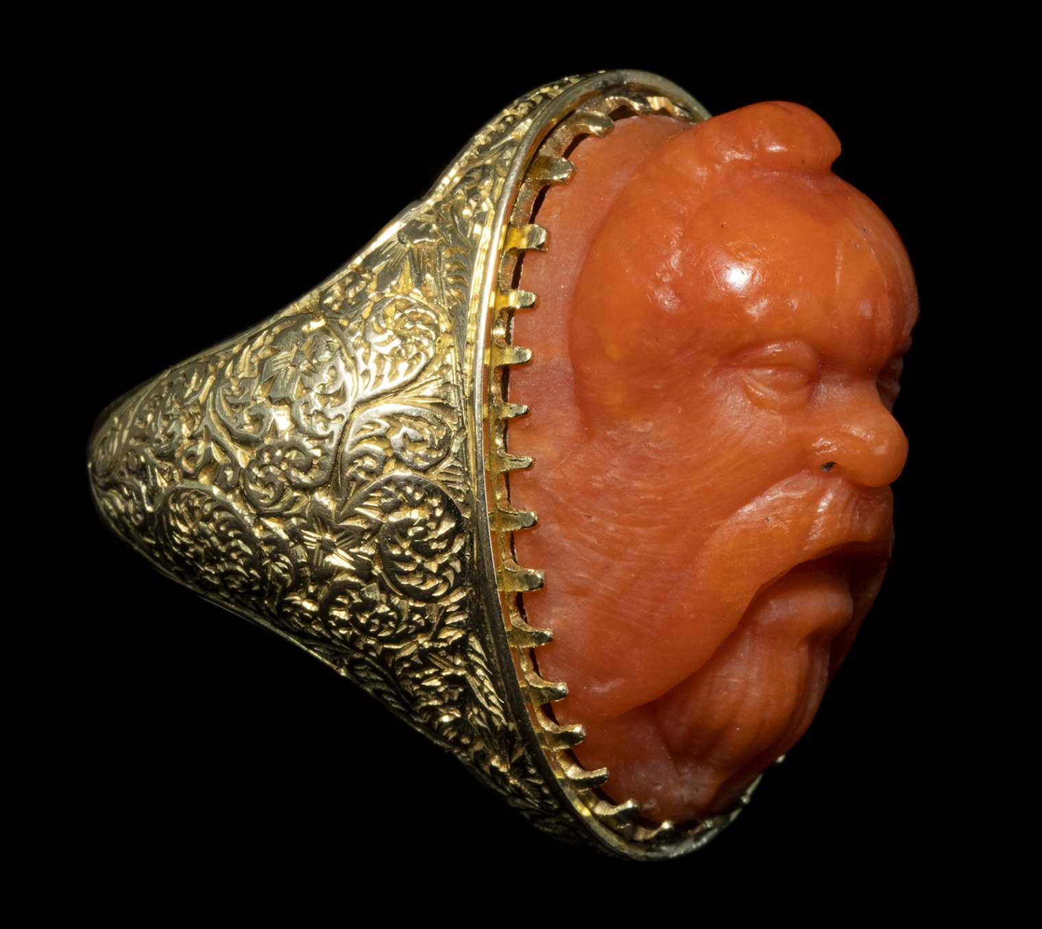 With a large chiseled hoop with floral patterns expanding upwards onto an oval bezel set with a large coral cameo; the frontal face is characterized by a thick long beard and moustache, a flat large nose, small globular eyes with heavy eyelids and a protruding front head. The frontality as well as the features reminds some Italian Renaissance masks depicting river gods. Hallmarks inside the bezel (15, 625, b, and stema).This unusual male bearded portrait can be identified with a river god even if, however, the face resembles a Silenus and the hair seems to recall the Asian art.