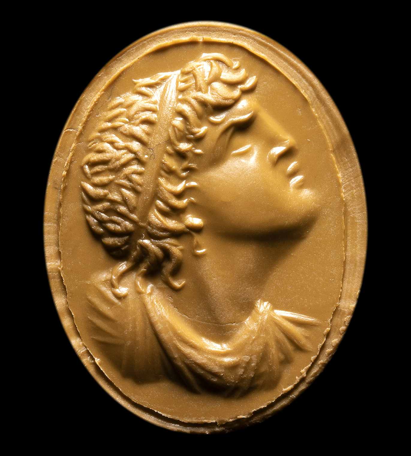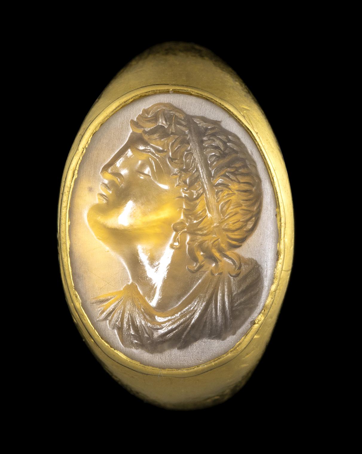 A POSTCLASSICAL CHALCEDONY INTAGLIO SET IN A GOLD RING. BUSTH OF A YOUTH.