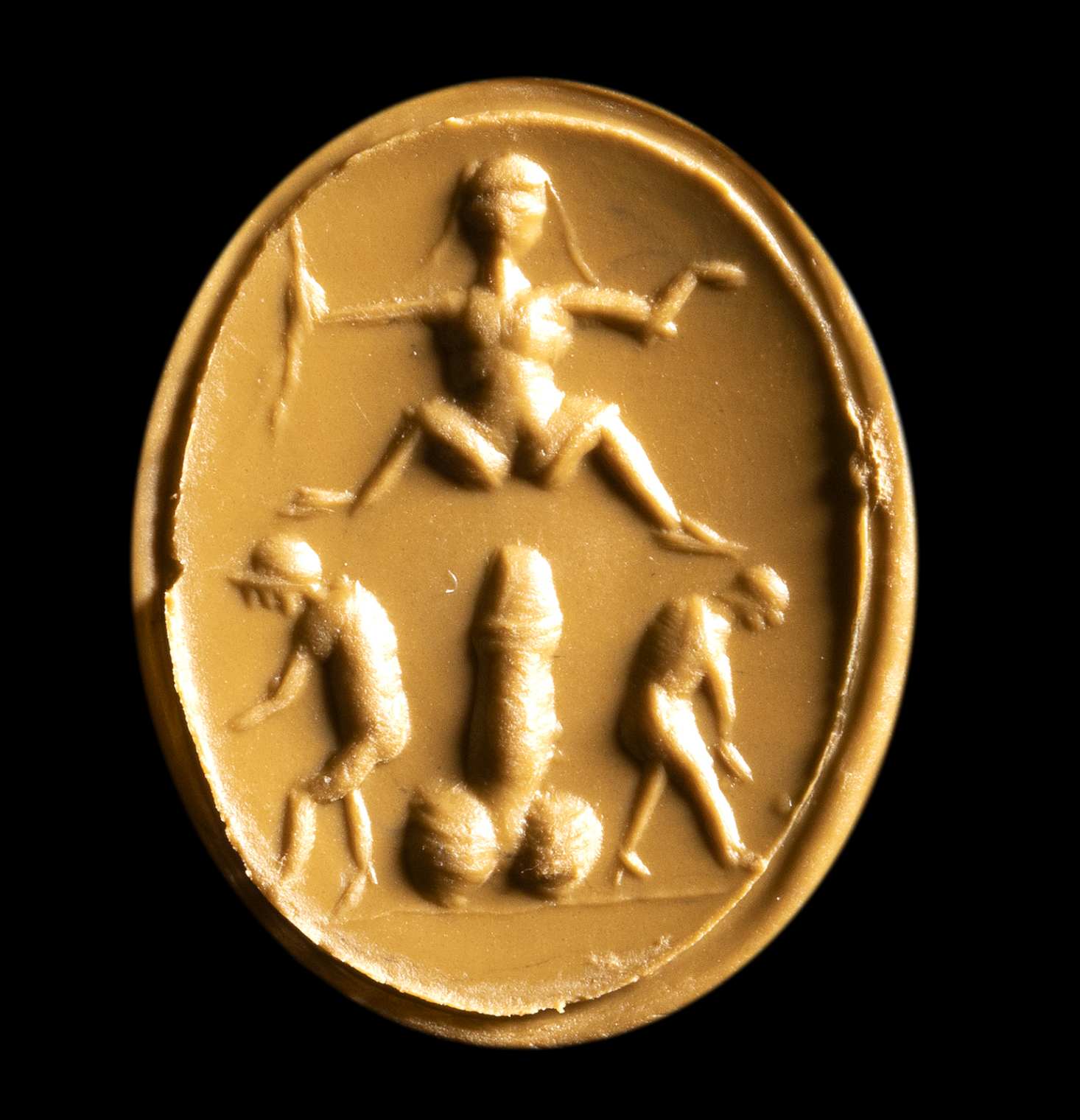A female figure is jumping with widespread legs on a huge phallic idole. On each side, a male figure facing down to the ground. Groundline. Wear marks.