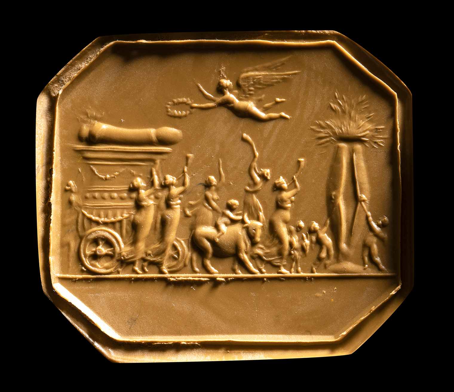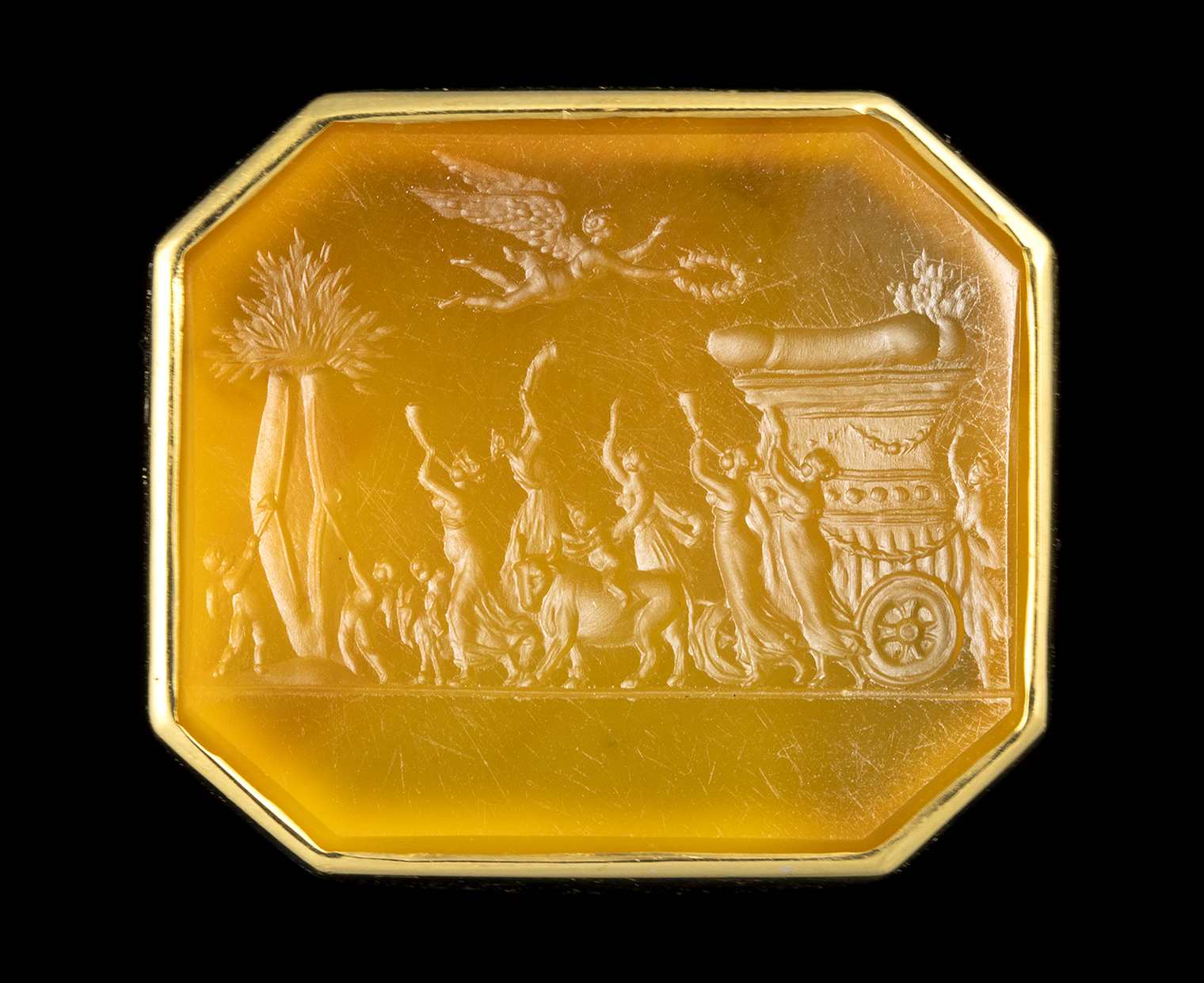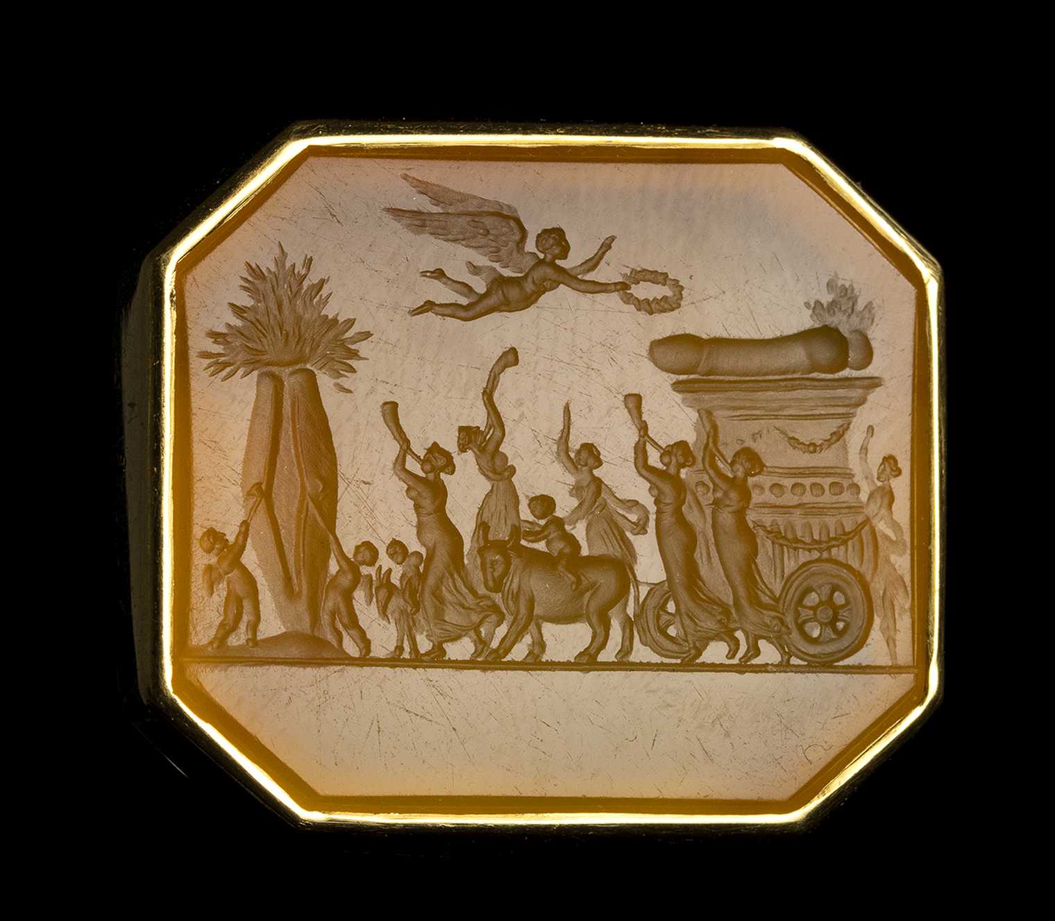 A NEOCLASSICAL LARGE CARNELIAN OCTAGONAL INTAGLIO SET IN A MODERN GOLD RING. EROTIC PROCESSION OF A PHALLUS.