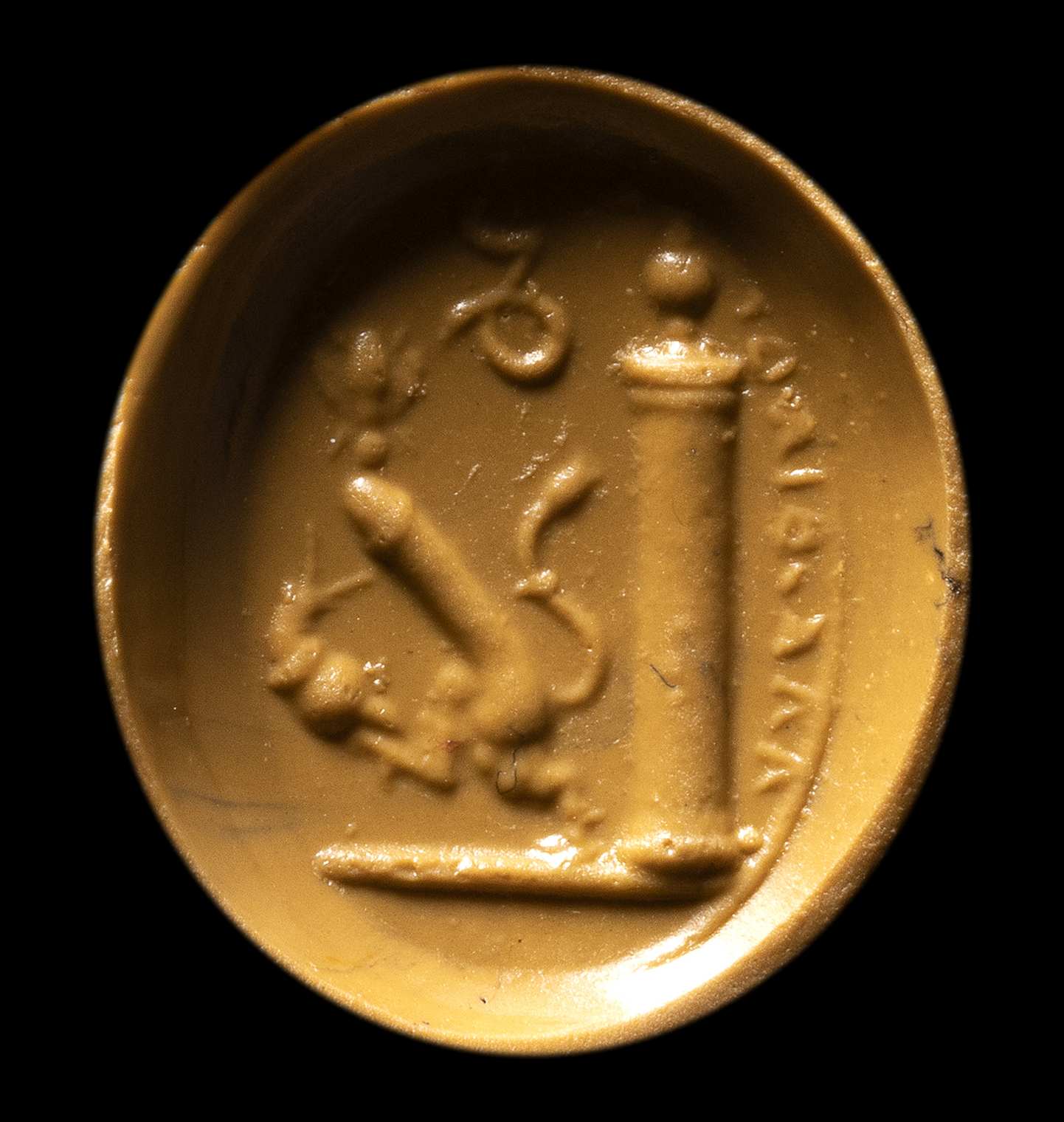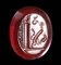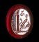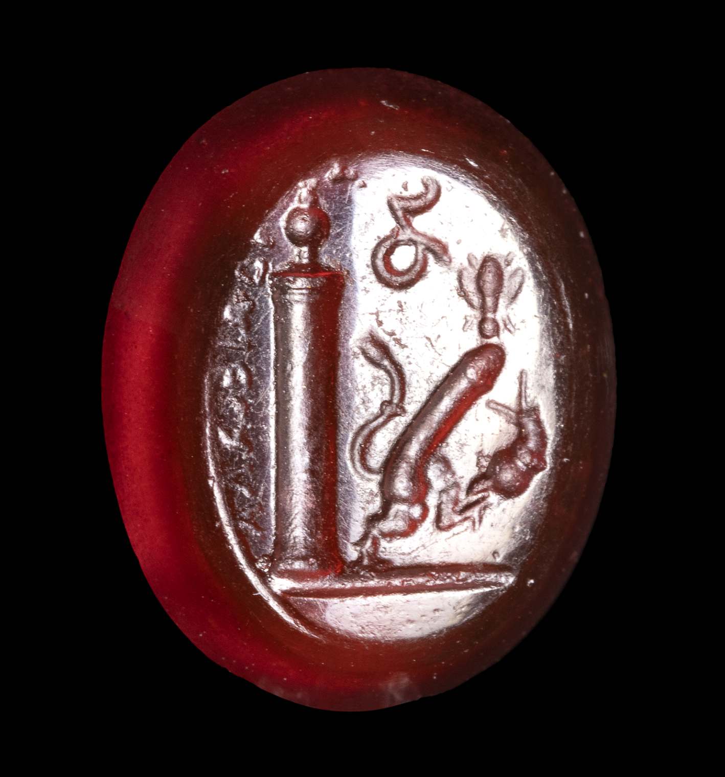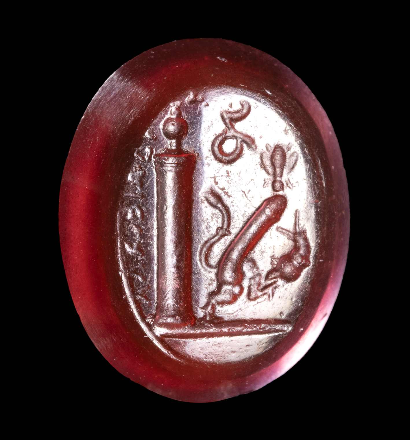 Interesting erotic allegory composed of an erect phallus with animal tail and legs advancing to the right; in front of him a snail (symbol of slowness and sexual endurance), above him a bee or fly (symbol of speed); behind, a column with an urn above it and inscriptions to be identified. Groundline. Wear marks. Impression cast in glass after an ancient intaglio.
