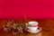 tesa decorata a motivi floreali e vegetali su fascia porpora, corredata di piattino