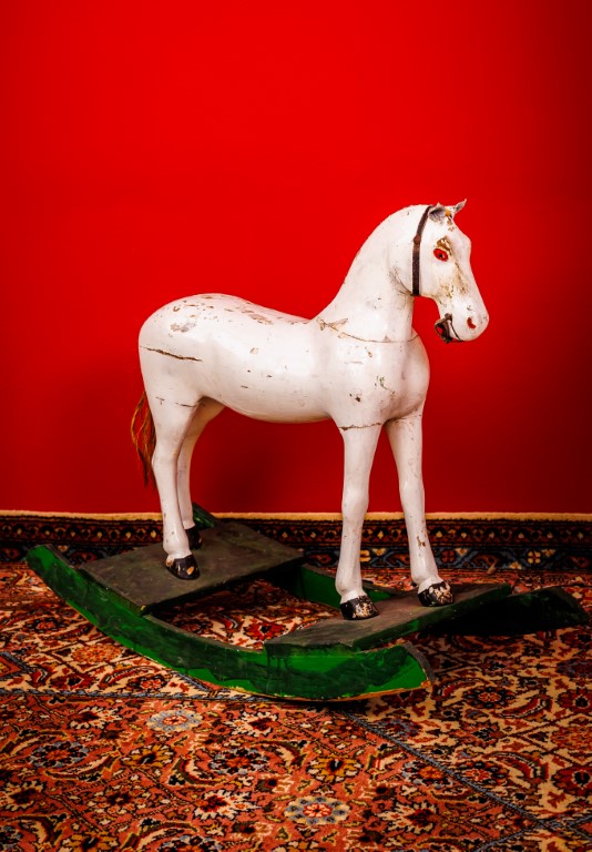 di colore bianco con dettagli in nero, base a dondolo dipinta in verde