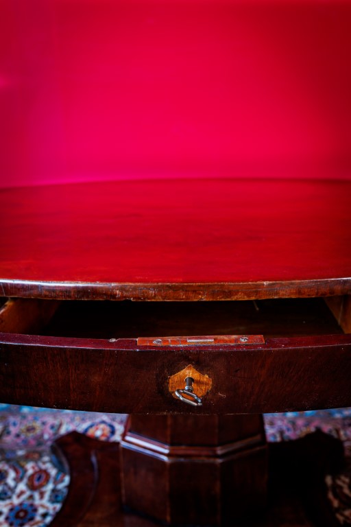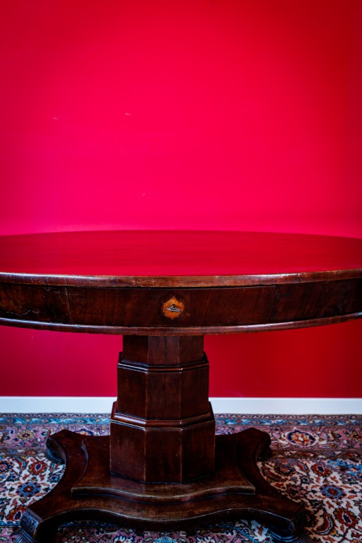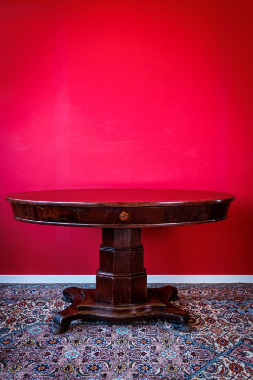 un cassetto nella fascia, fusto prismatico su base quadrangolare con piedi a conchiglia stilizzata