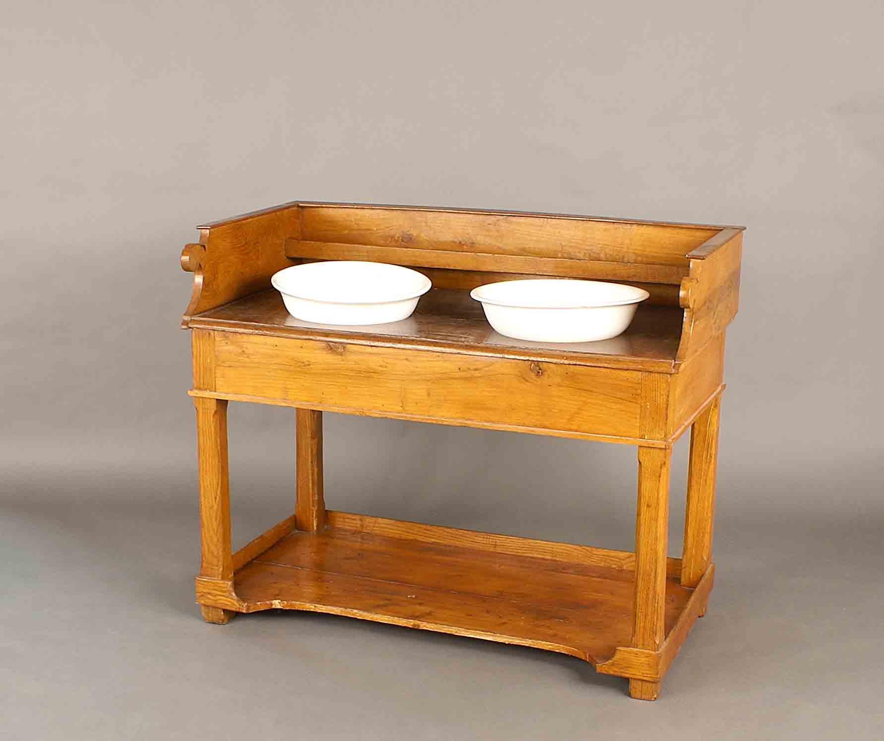 Mobile toletta in pioppo, piano rettangolare con due vasche in ceramica bianca, Provenza, vecchia manifattura, cm. 87x107x55.