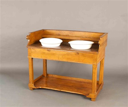 Mobile toletta in pioppo, piano rettangolare con due vasche in ceramica...