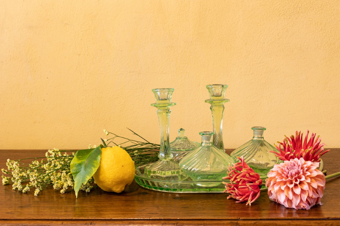realizzato nei toni del verde e decorato a nervature, composto da vassoio ovale, due candelieri, due flaconi ed una scatola portacipria