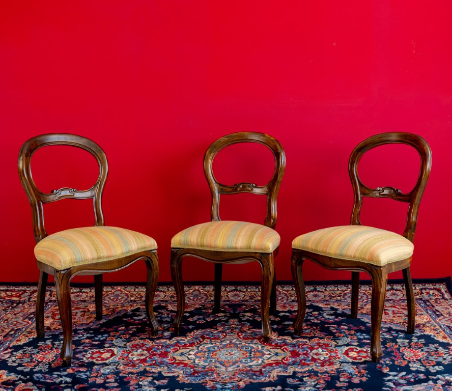 realizzate in stile inglese, cartella traforta, seduta imbottita e rivestita in tessuto a righe