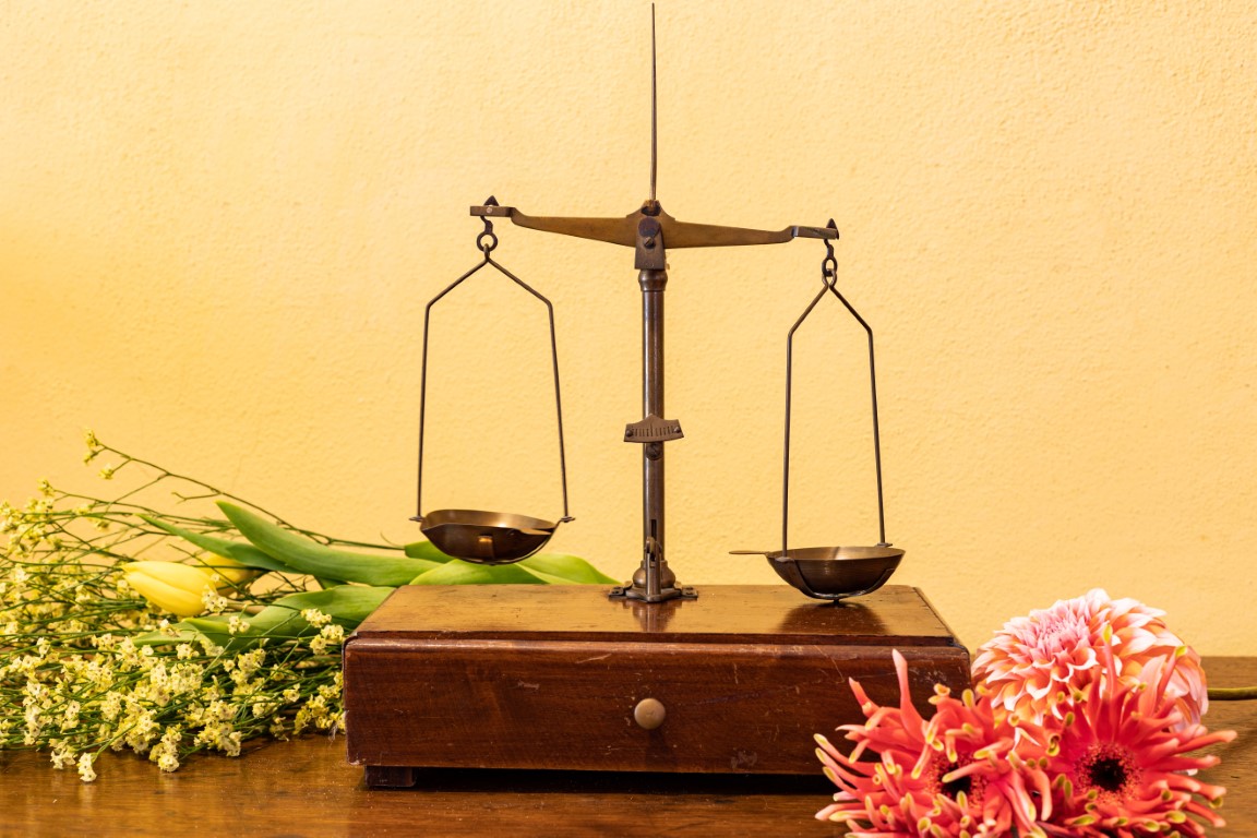 realizzata su base rettangolare ad un cassetto, completa di scatola in latta con pesi