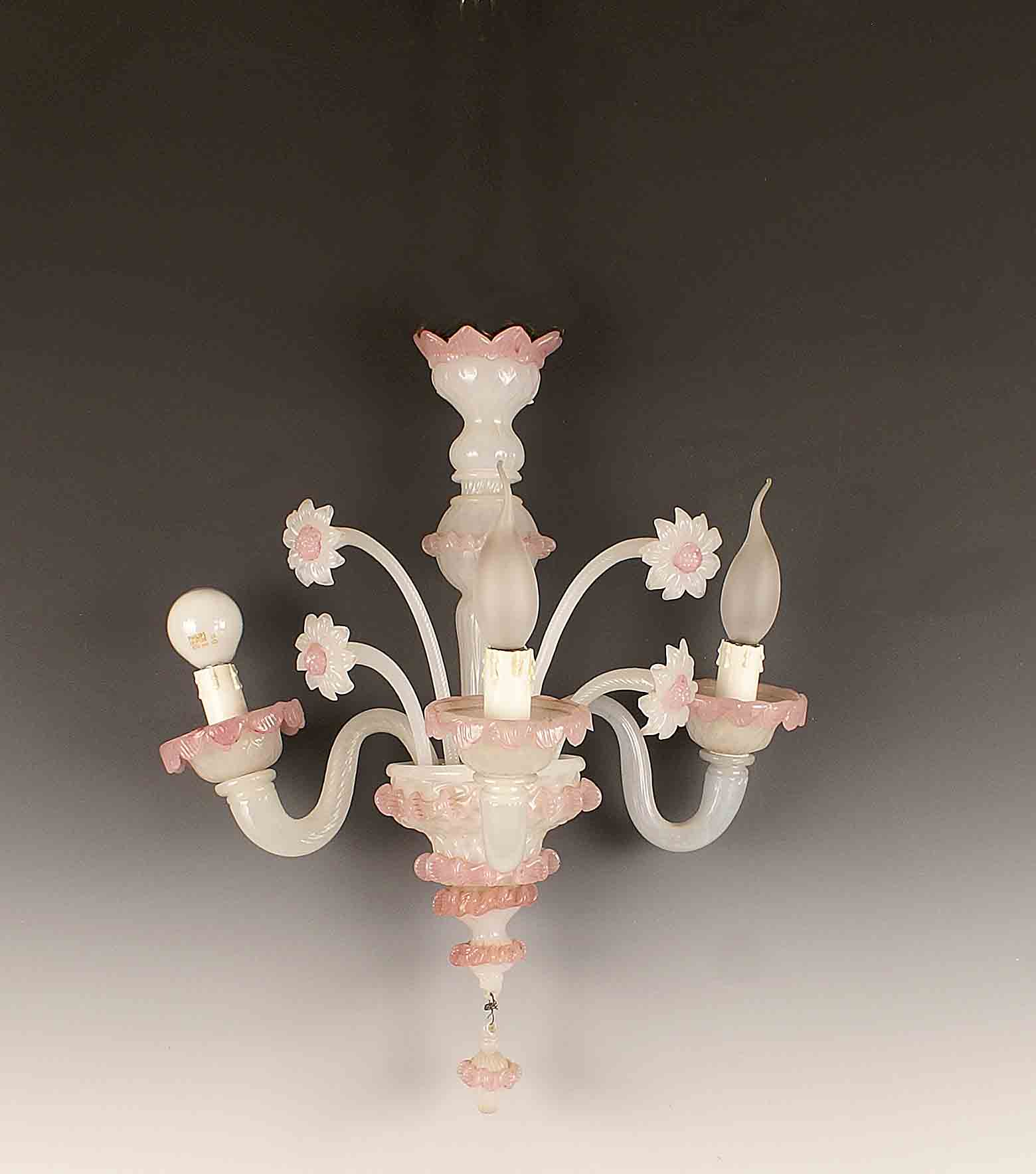 Lampadario in vetro bianco e rosa a tre luci, Murano, vecchia manifattura, cm. 45x40.