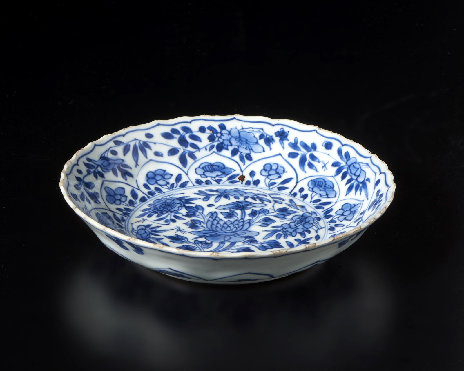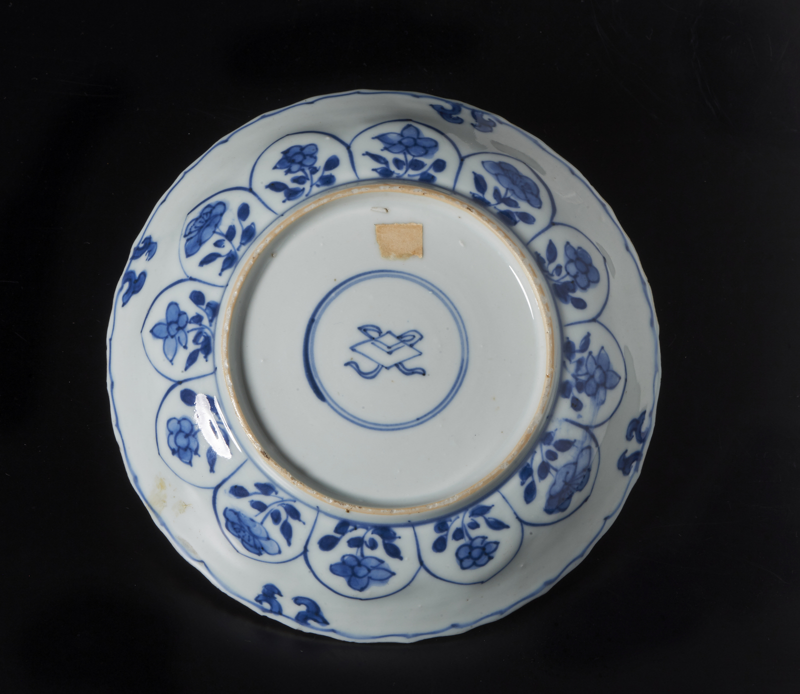 Cina, dinastia Qing, periodo Kangxi, XVII secolo . . Cm 17,00 x 3,50. piattino a bordo lobato in porcellana bianca decorata in blu sottocoperta con motivo floreale. Sul fondo marchio figurato di Kangxi entro doppio cerchio in blu sottocoperta.