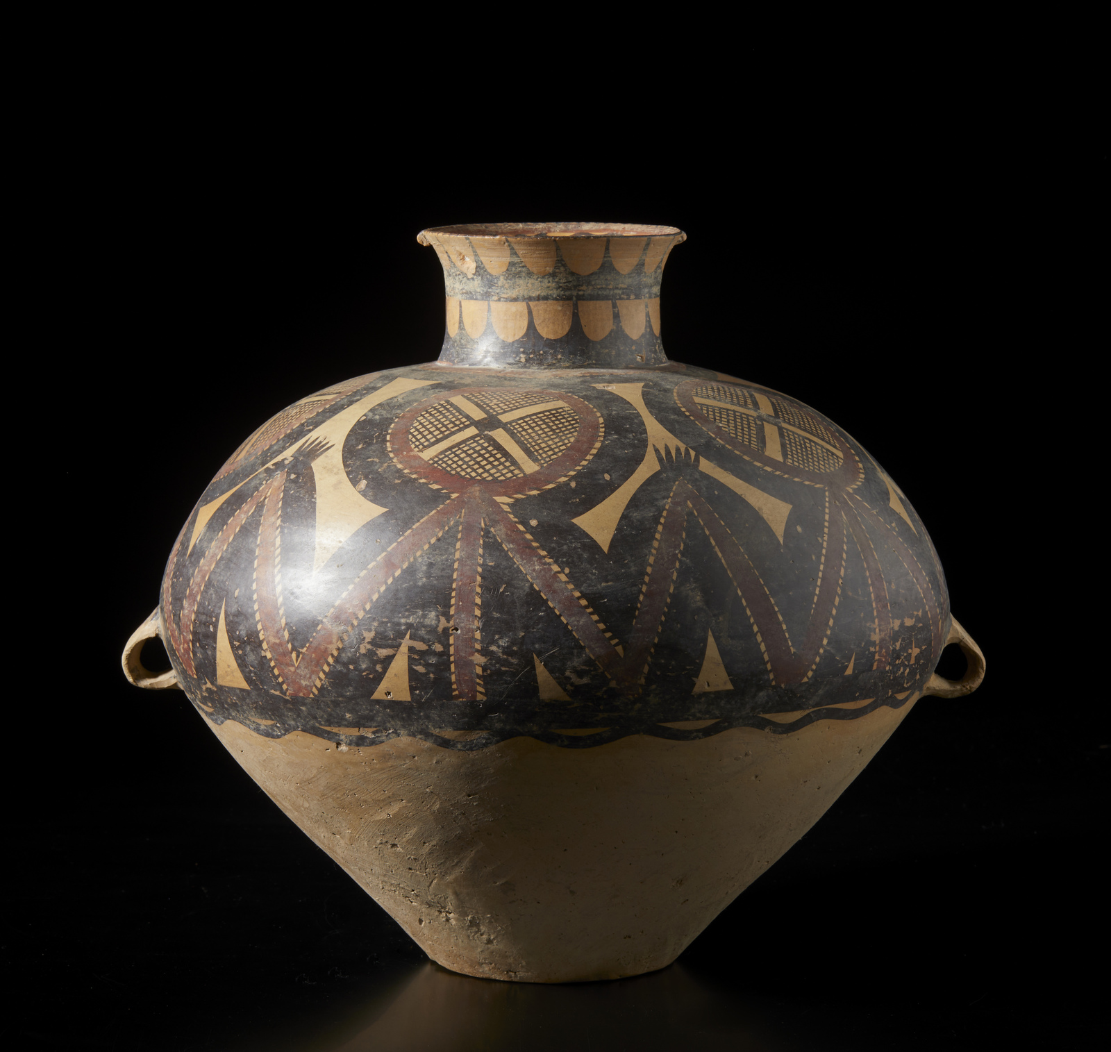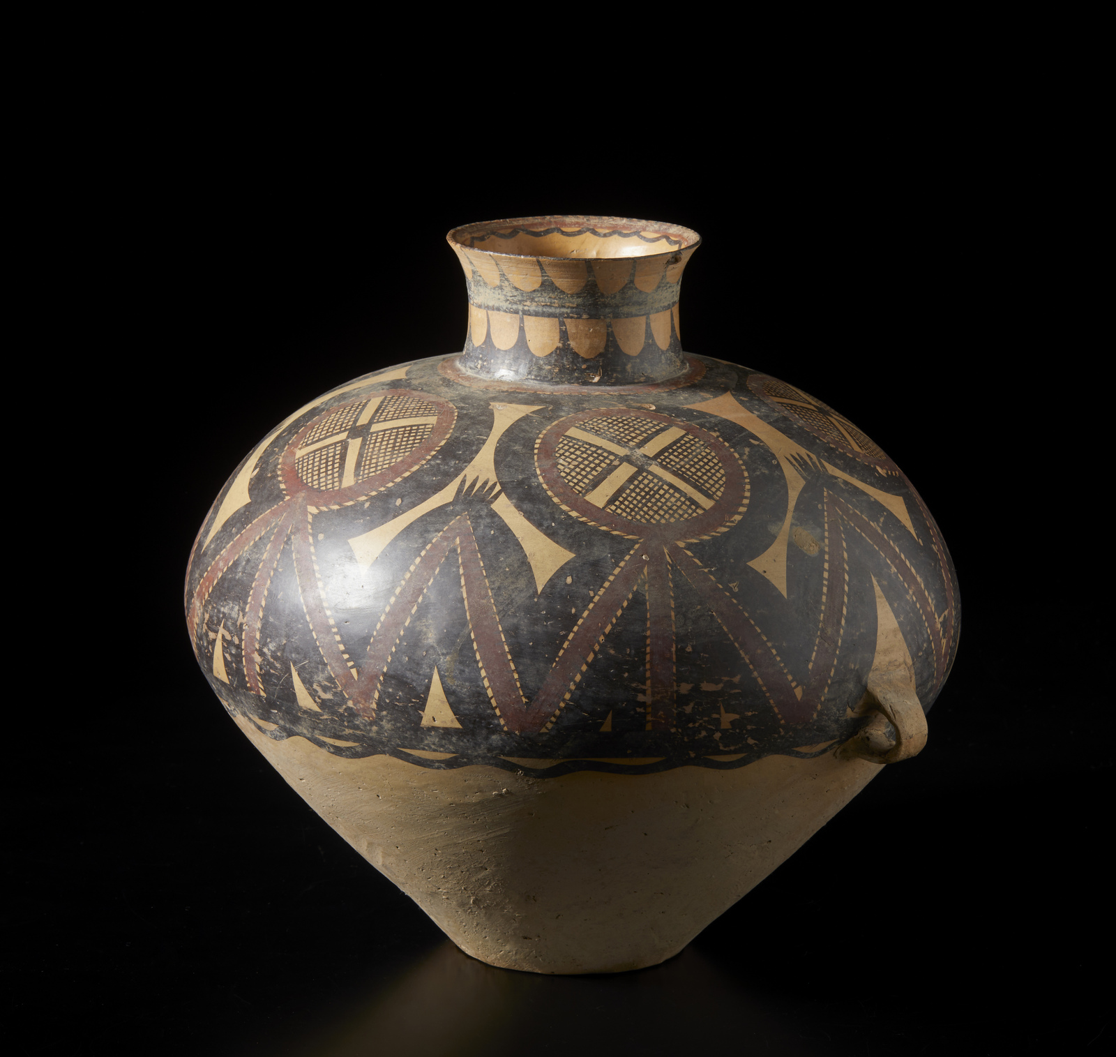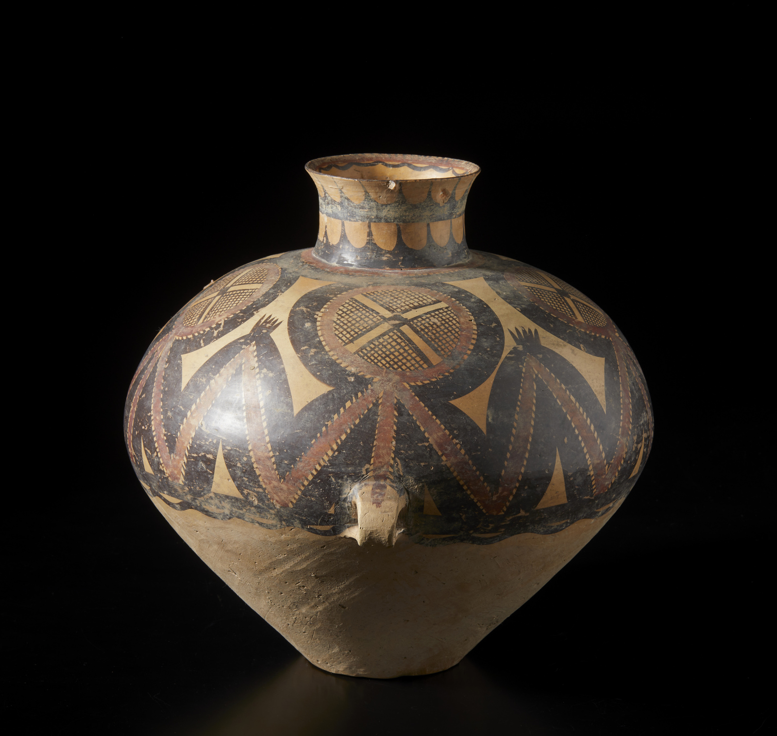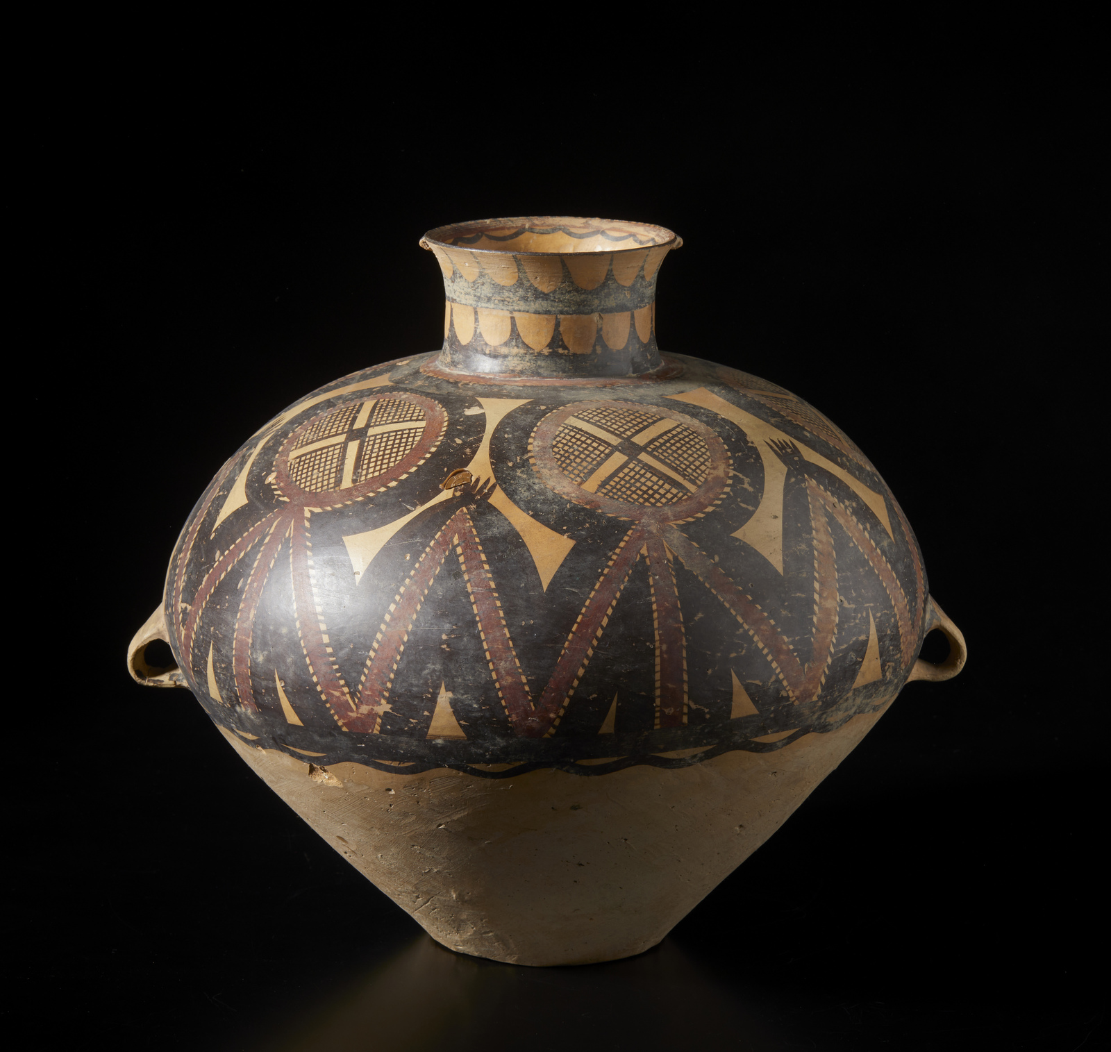 Cina, periodo Neolitico . . Cm 38,00 x 34,00. Vaso per lo stoccaggio in terracotta con spalla decorata con motivo astratto e geometrico ripetuto. Due piccoli occhielli ai lati.