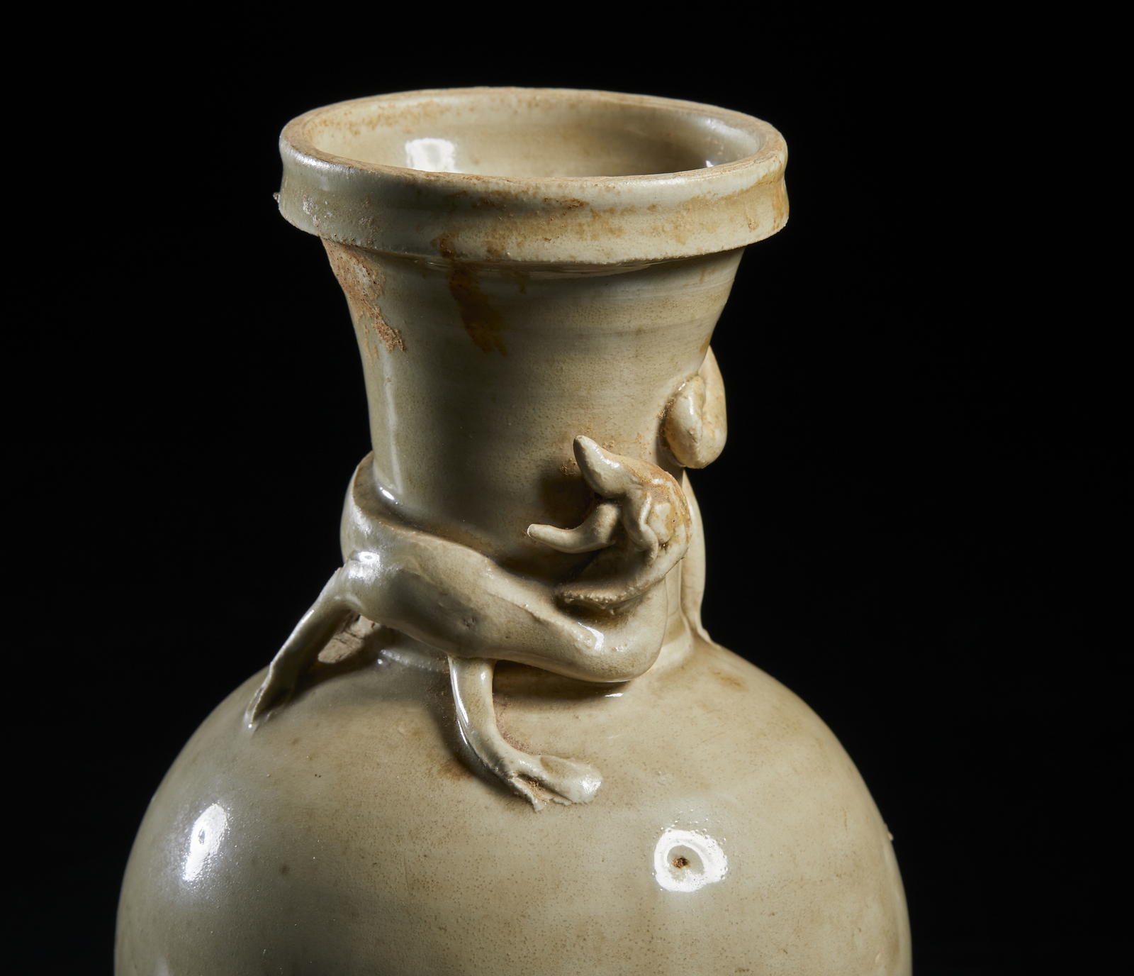 Cina, dinastia Song, XII secolo. . Cm 12,50 x 22,50. Vaso a balaustro in ceramica invetriata verde pallido con decoro a rilievo di Qilong.