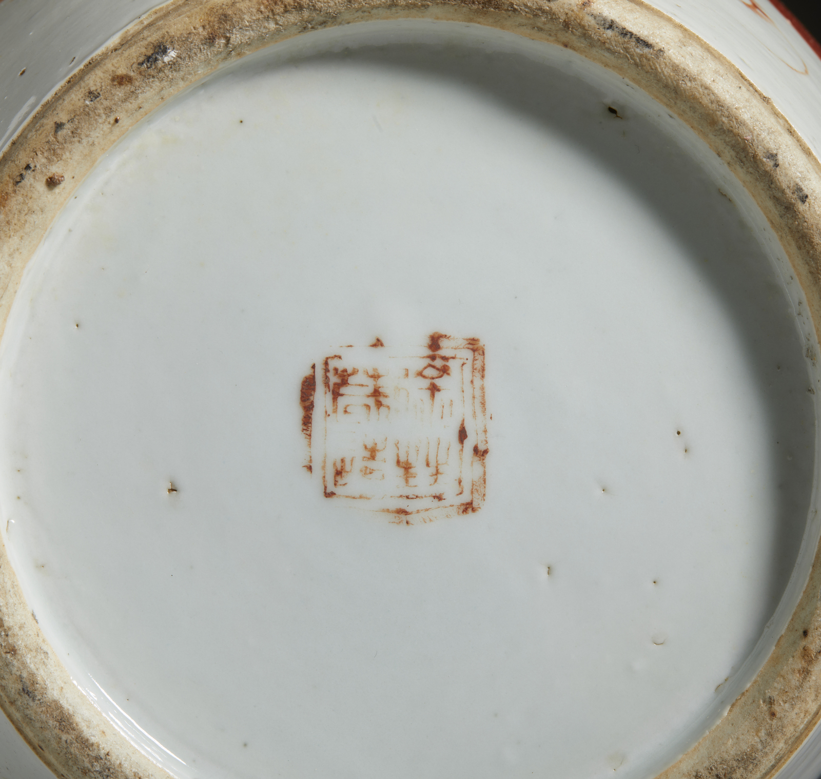 Cina, XIX secolo . . Cm 20,50 x 44,50. in porcellana a pasta spessa, l'esterno smaltato con cane di pho rosso e lunga iscrizione sul retro. Marchio a sigillo in rosso ferro sulla base.