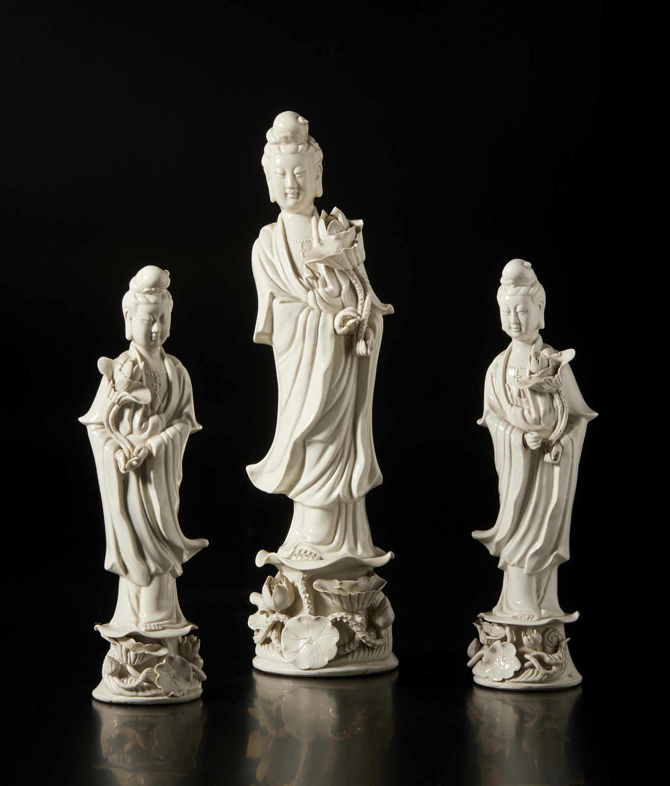 Cina, Qing, XIX secolo. . Cm 12,00 x 42,00. Lotto composto da cinque sculture in porcellana bianca raffiguranti la dea della compassione Guanyin che regge un tralcio fiorito di loto.