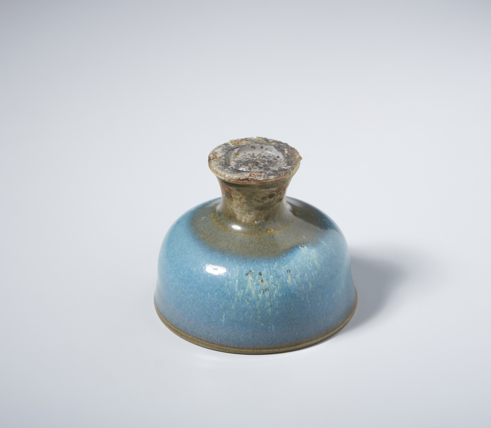 . . Cm 9,50 x 7,50. a corpo pesante con spessa invetriatura azzurrognola e macchia porpora sul fondo
