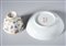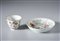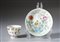 . . Cm 7,50 x 5,90. In porcellana bianca decorata a vivace policromia raffigurante sul piatto il soggetto ricorrente del gatto, peonie e rocce, mentre la tazza presenta un ornato sparso di fiori e farfalle. Entrambi i pezzi presentano sul fondo marchio sigillare in rosso sopracoperta a sei caratteri di Guangxu