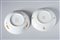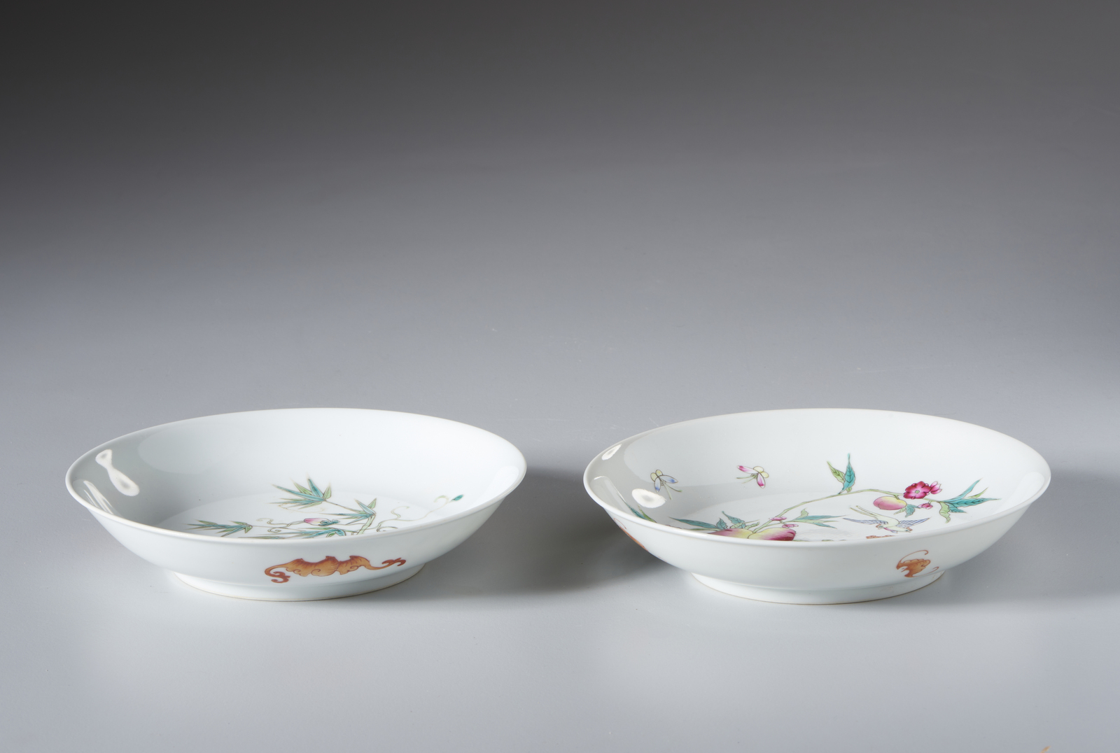 . . Cm 15,00 x 3,00. Due piattini in porcellana bianca con elegante decoro vegetale. Sul retro pipistrelli di buon augurio e marchio in rosso a quattro caratteri.
