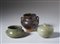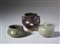 . . Cm 11,00 x 9,40. Lotto composto da un vaso parzialmente coperto da spessa invetriatura bruna (sec X), un contenitore per acqua celadon con decoro di pesci a rilievo (sec XV) ed un incensiere in porcellana ad invetriatura verde (sec XVII).