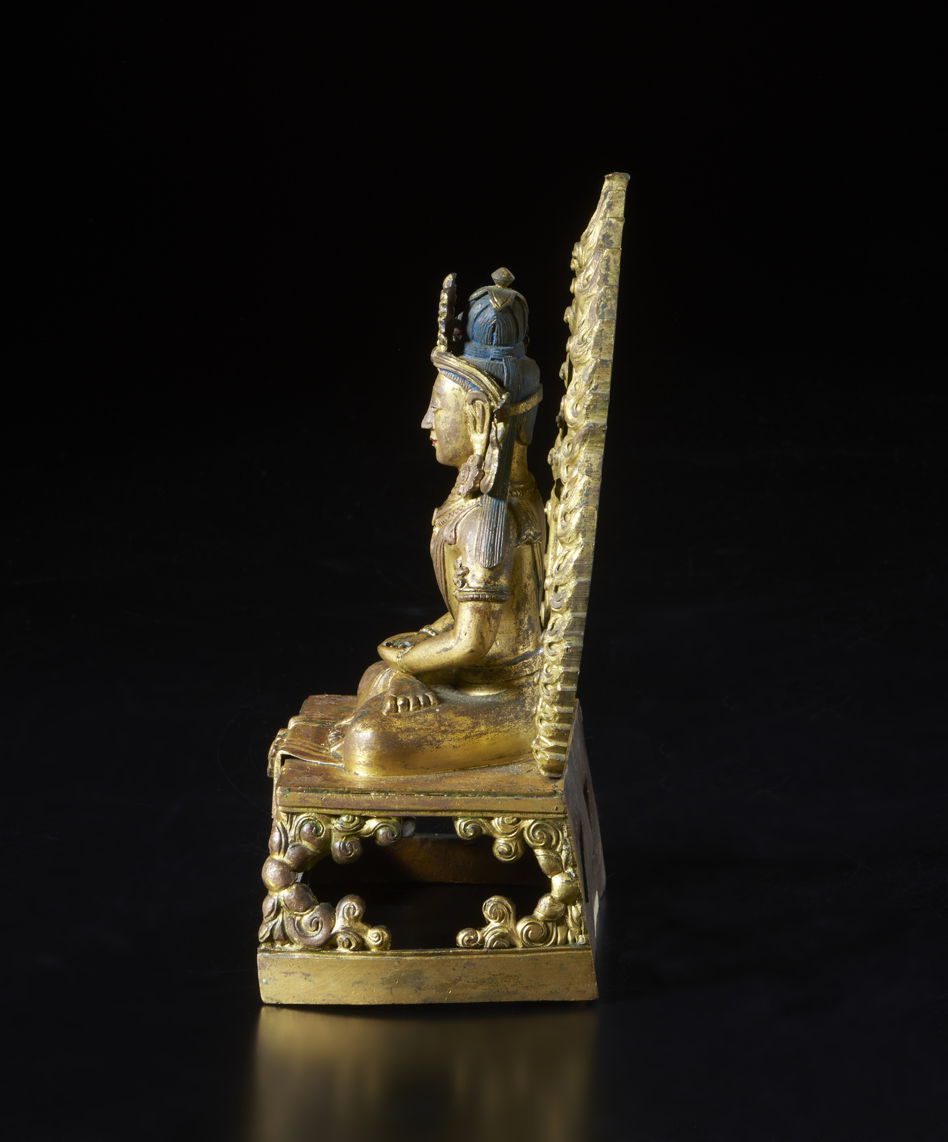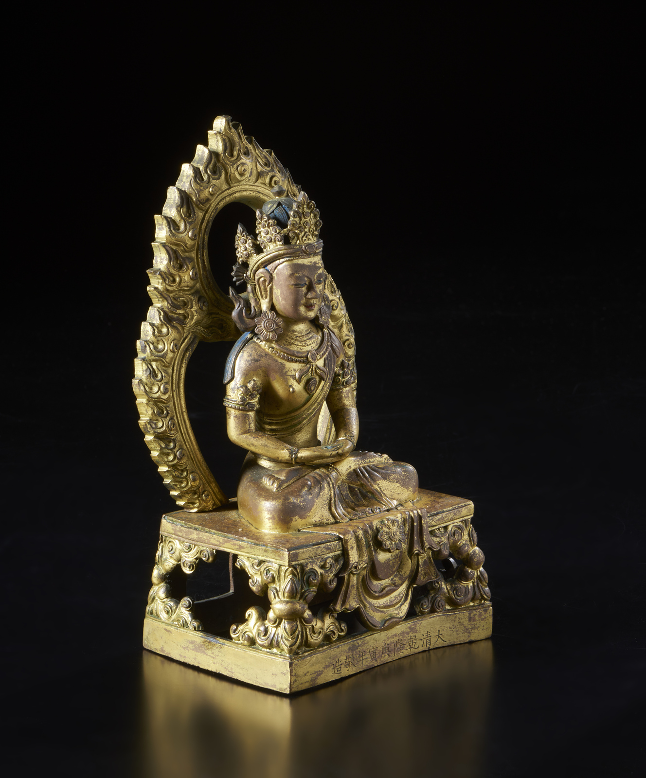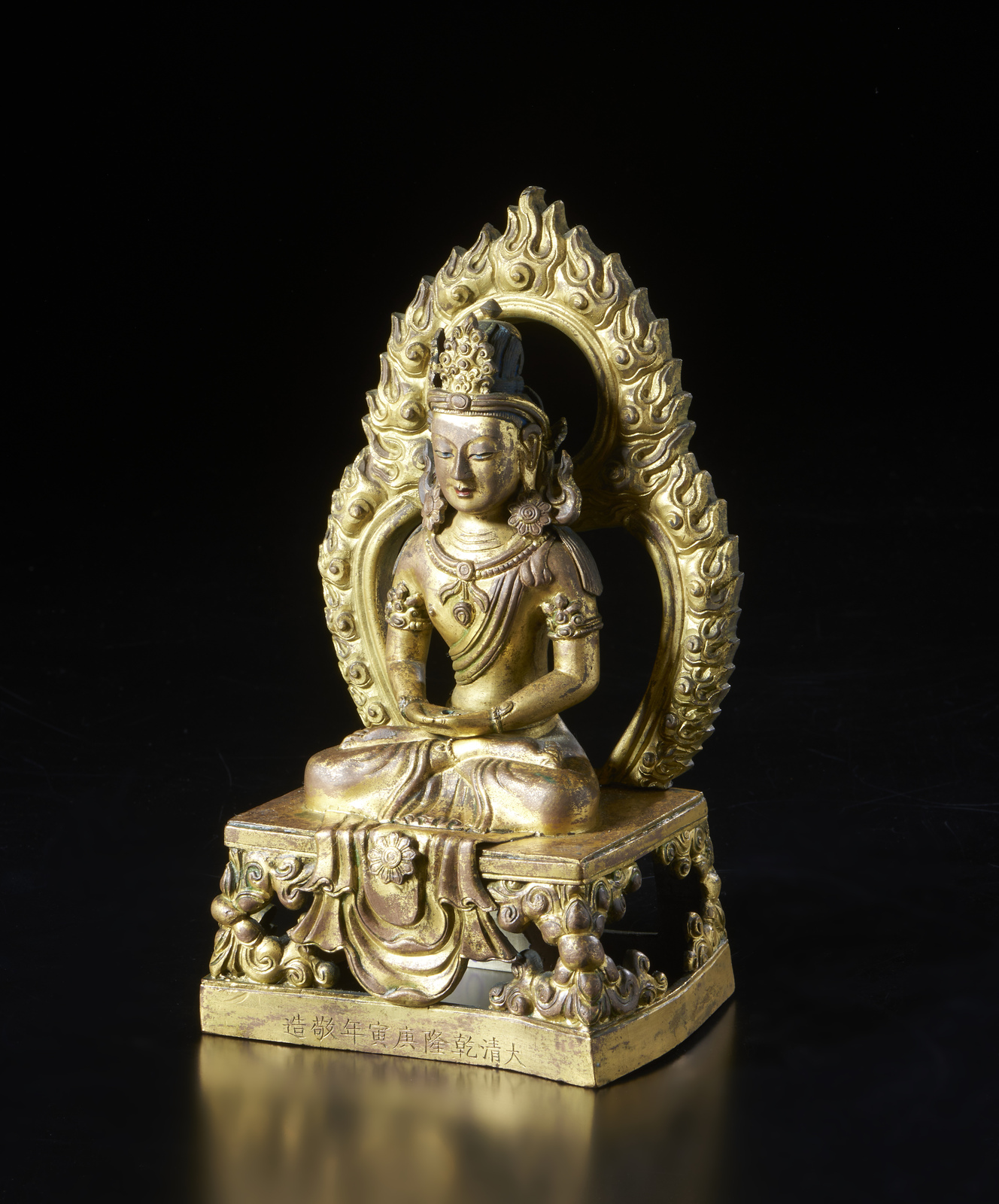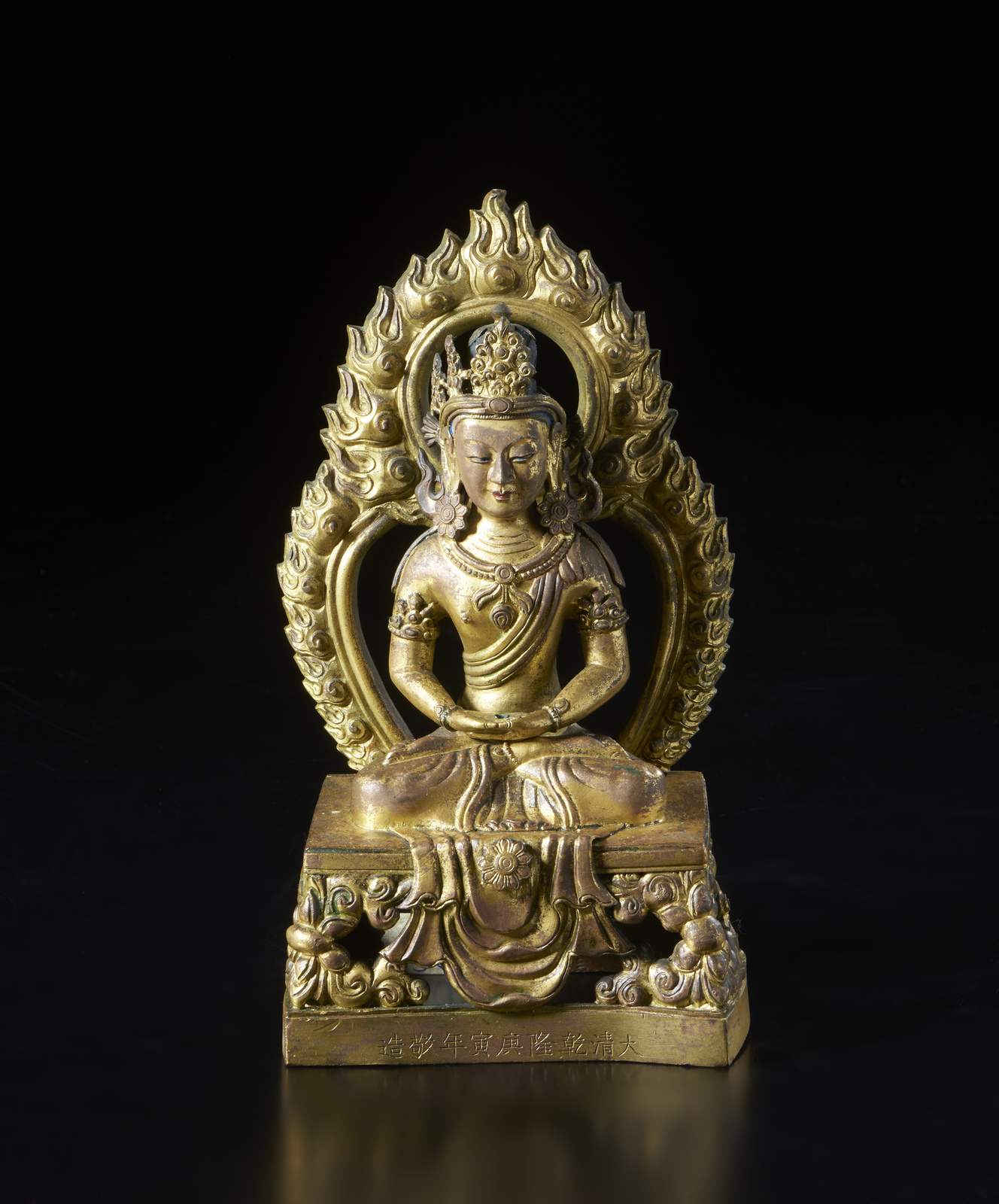 . . Cm 12,00 x 21,50. fusione in bronzo dorato raffigurante il Buddha della longevità assiso in trono con iscrizione dedicatoria e data. Questa immagine fa parte di un gruppo di immagini dello stesso soggetto prodotte intorno al 1770 per ordine di Qianlong in occasione del genetliaco materno.
