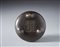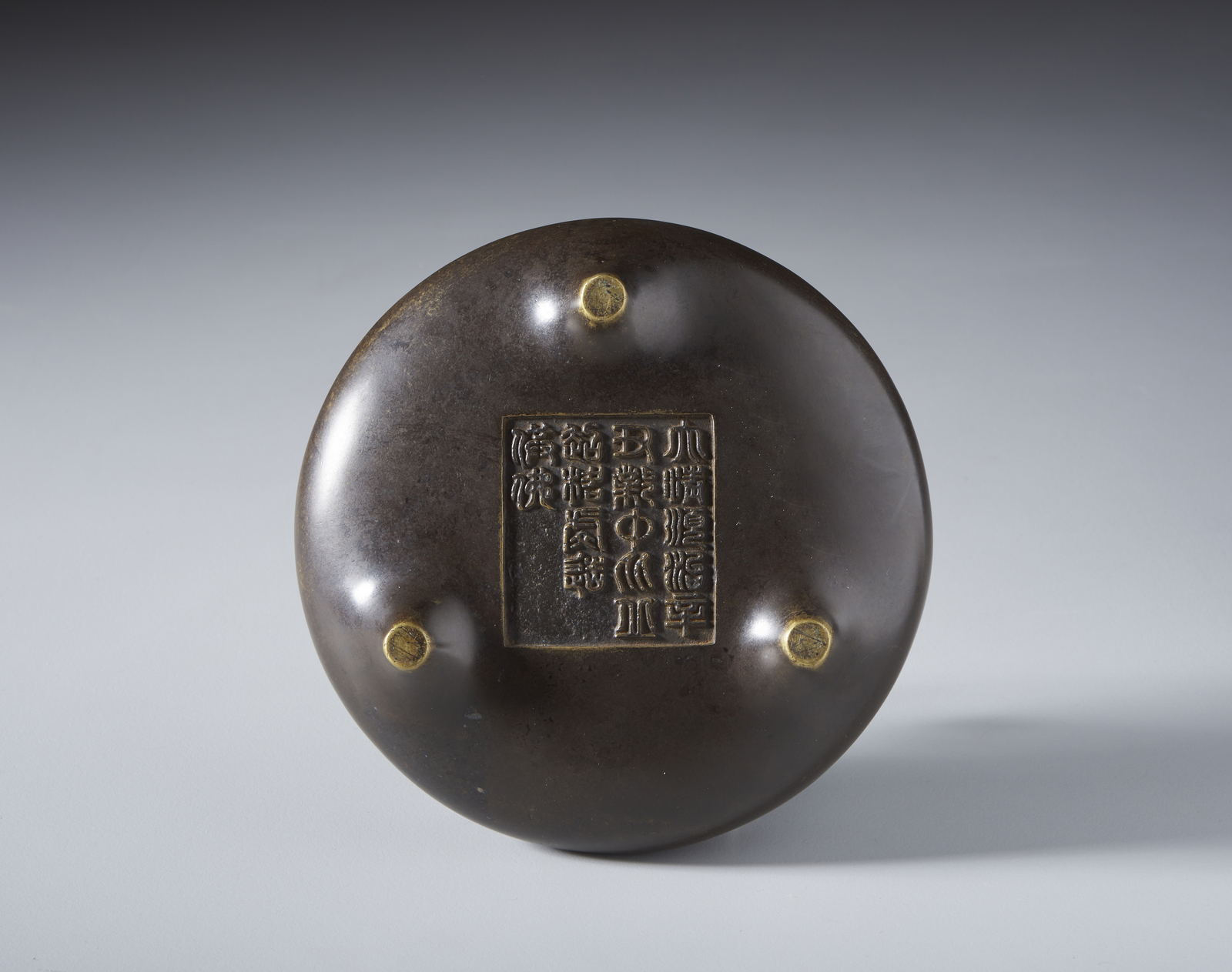 . . Cm 15,50 x 8,50. tripode ding in bronzo a patina scura con manici e marchio a caratteri arcaistici impresso sul fondo.