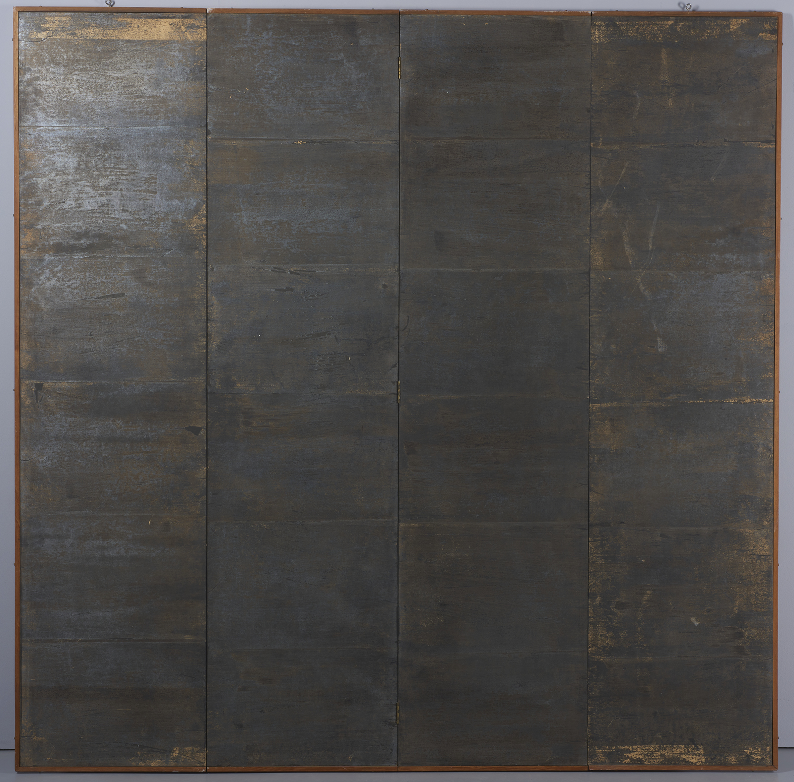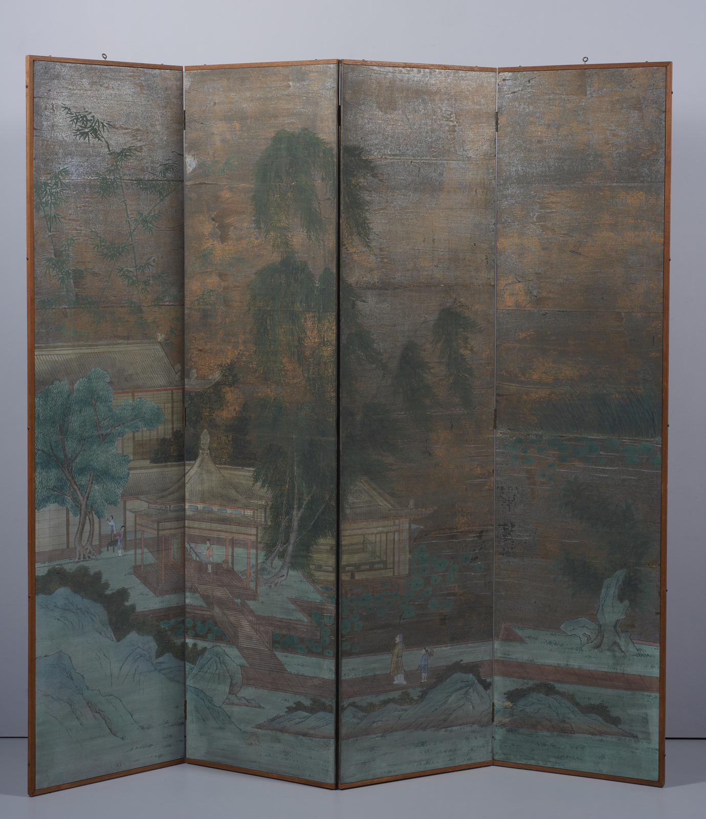 Cina, dinastia Qing, inizio XIX secolo . . Cm 183,00 x 183,00. Grande paravento pieghevole composto da 4 ante con disegno consecutivo raffigurante un padiglione lacustre sotto pini, su sfondo dorato.