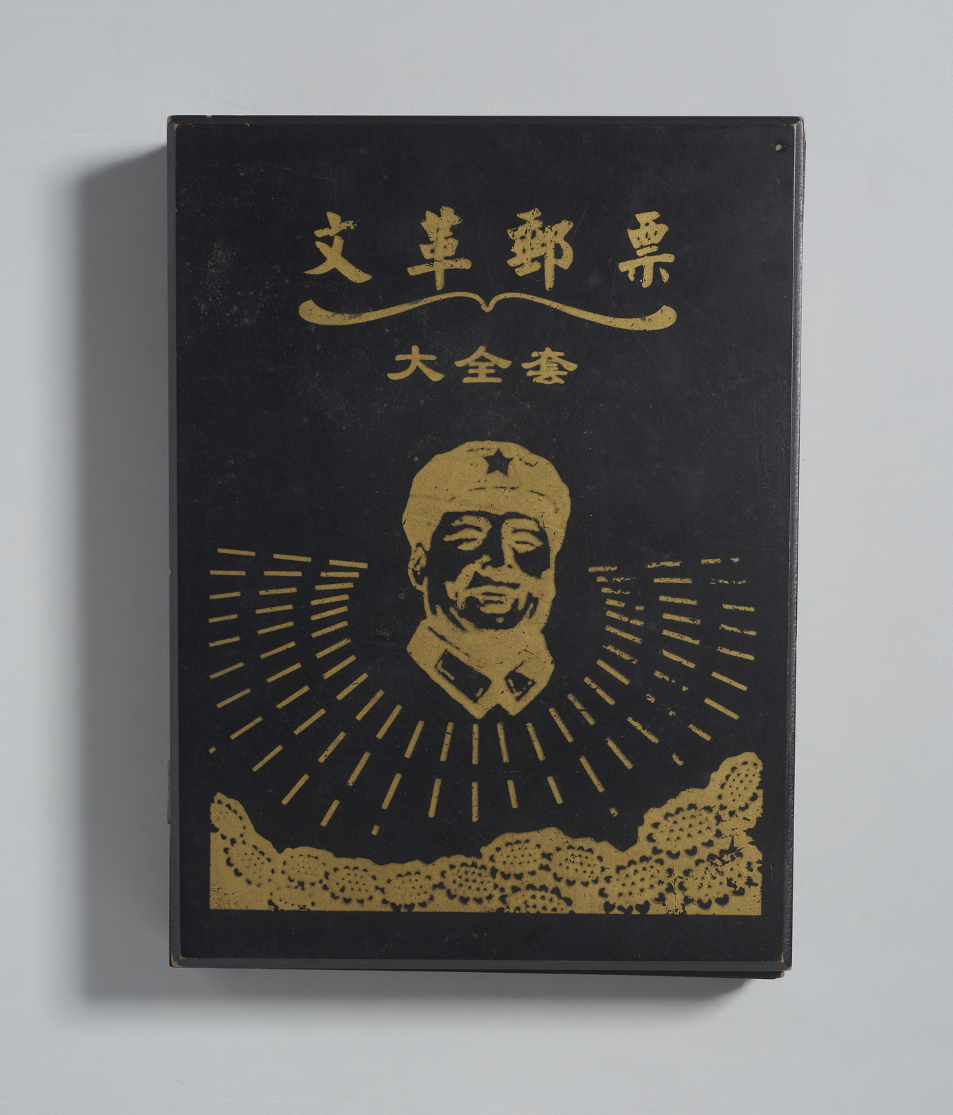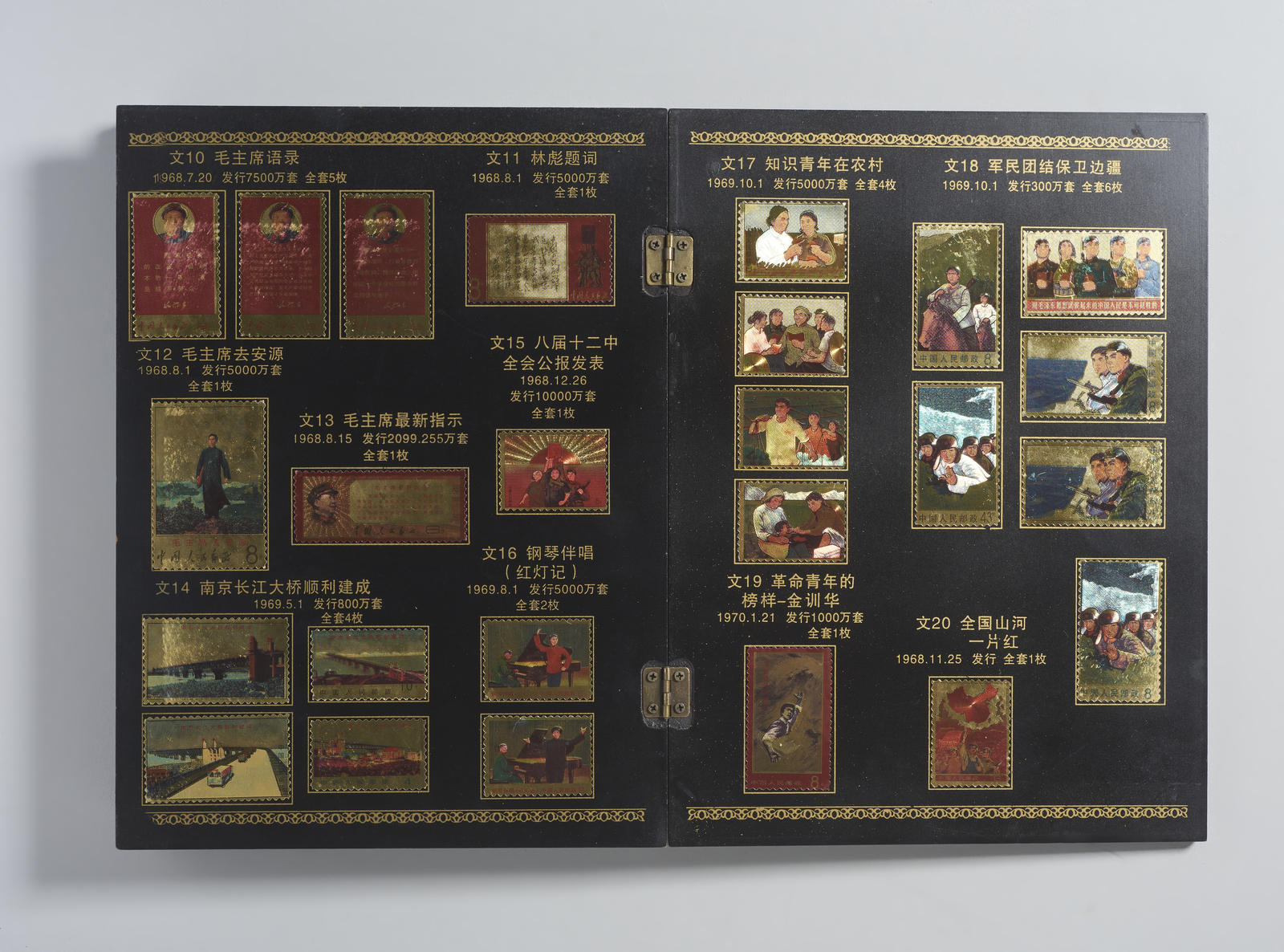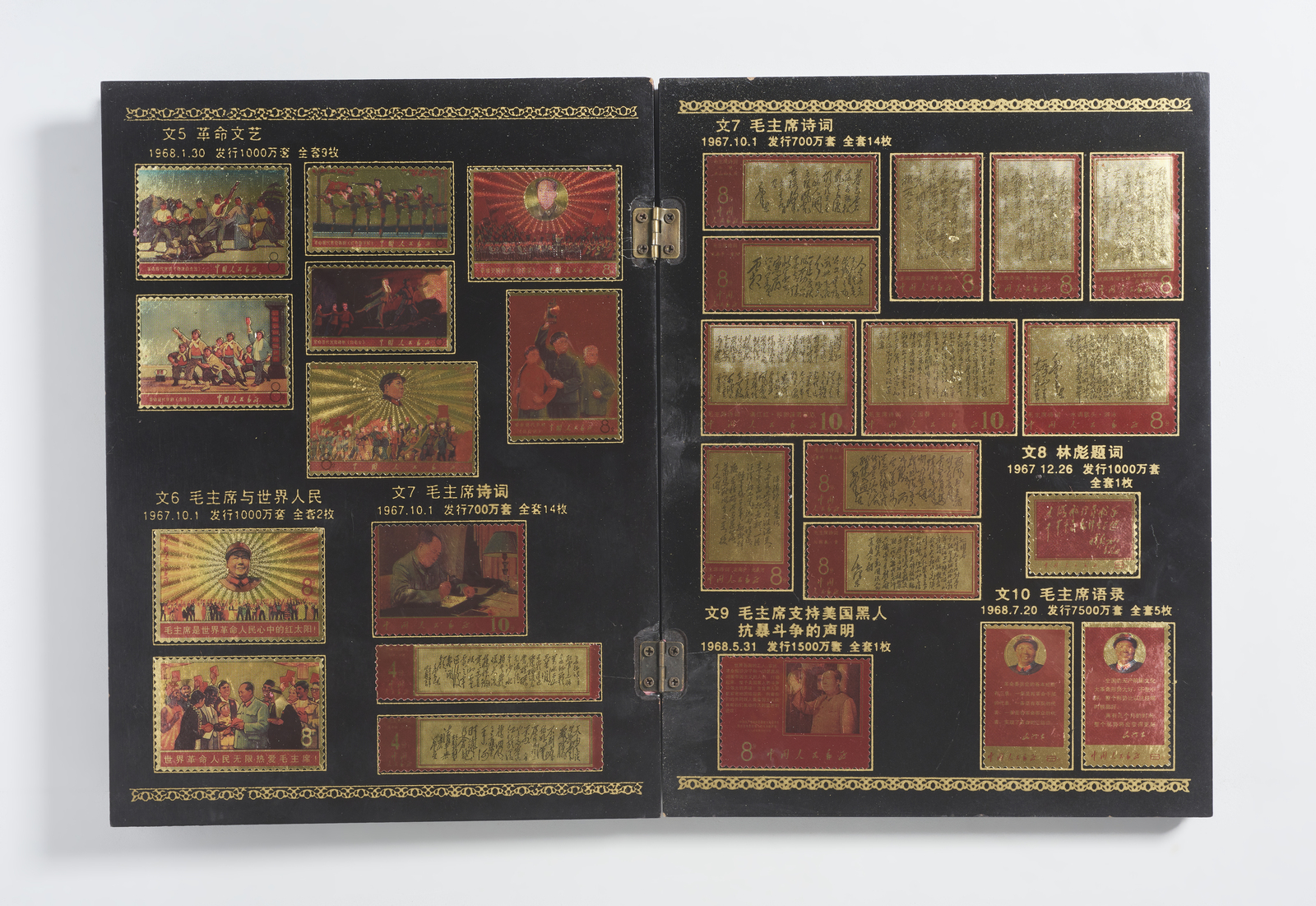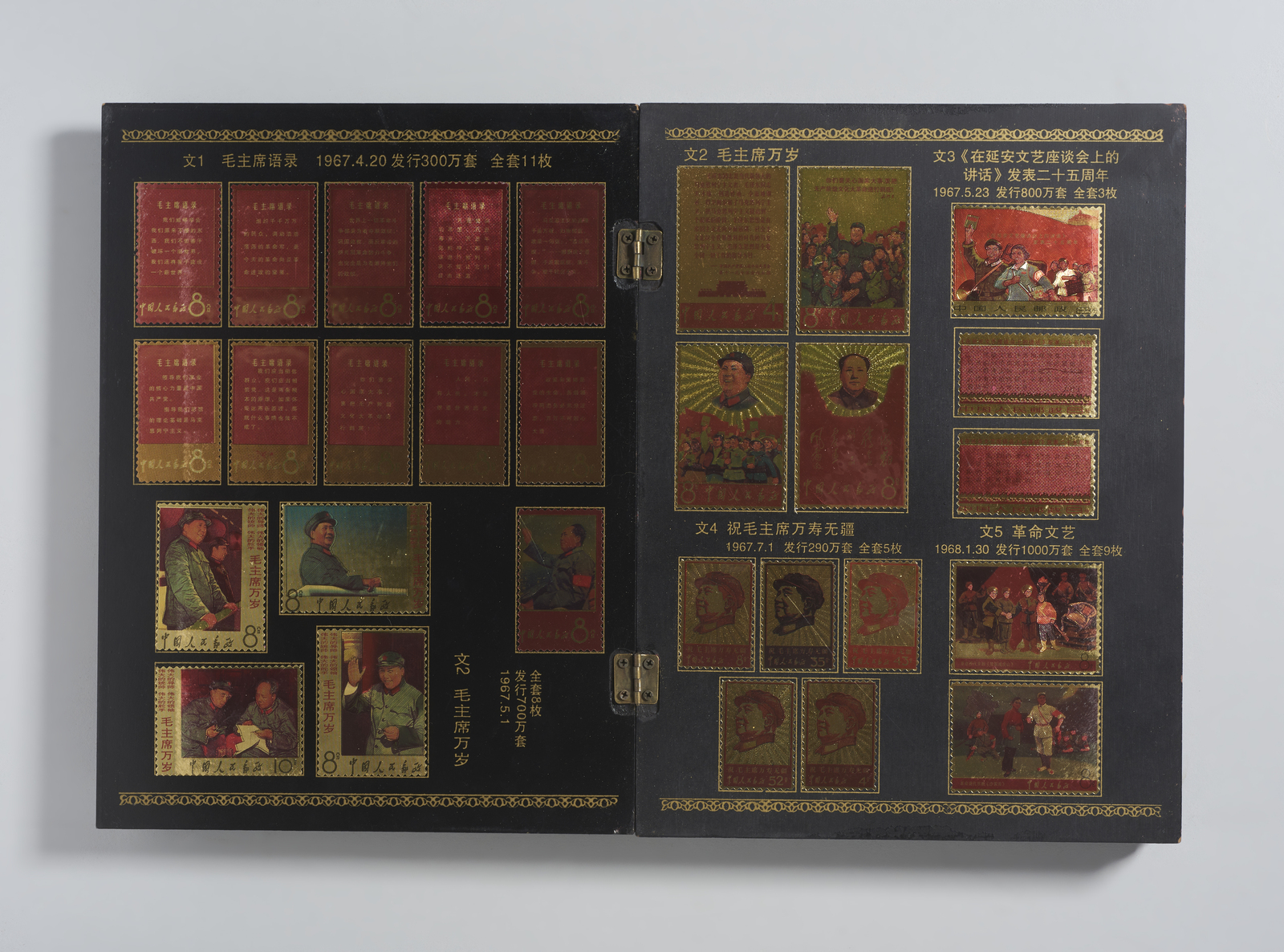 Cina, Repubblica Popolare Cinese, XX secolo. . Cm 20,00 x 27,00. Album celebrativo la figura politica di Mao Tze Dong, composto da quattro pagine in legno ebanizzato contenenti al loro interno una collezione di francobolli in edizione speciale.