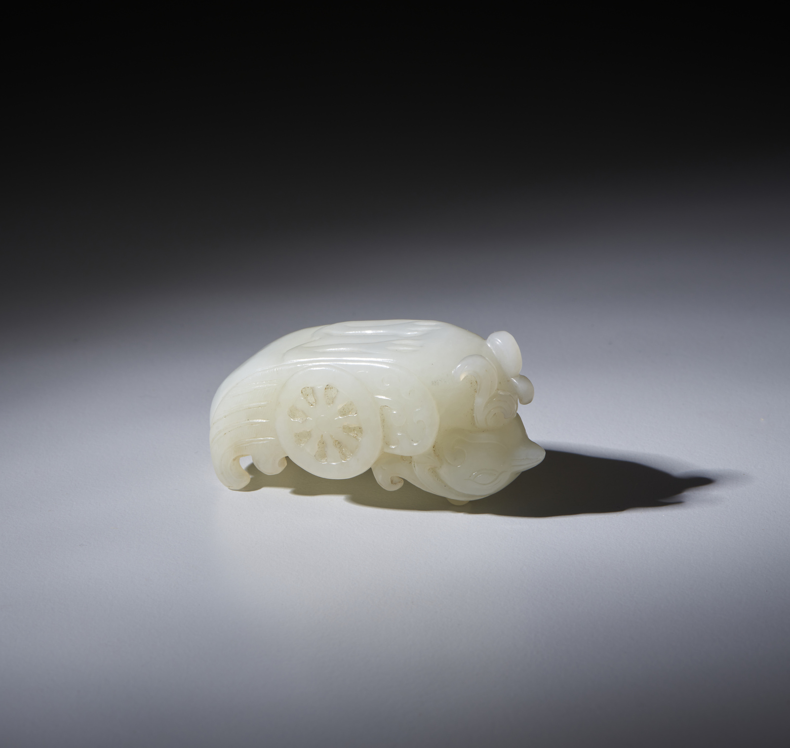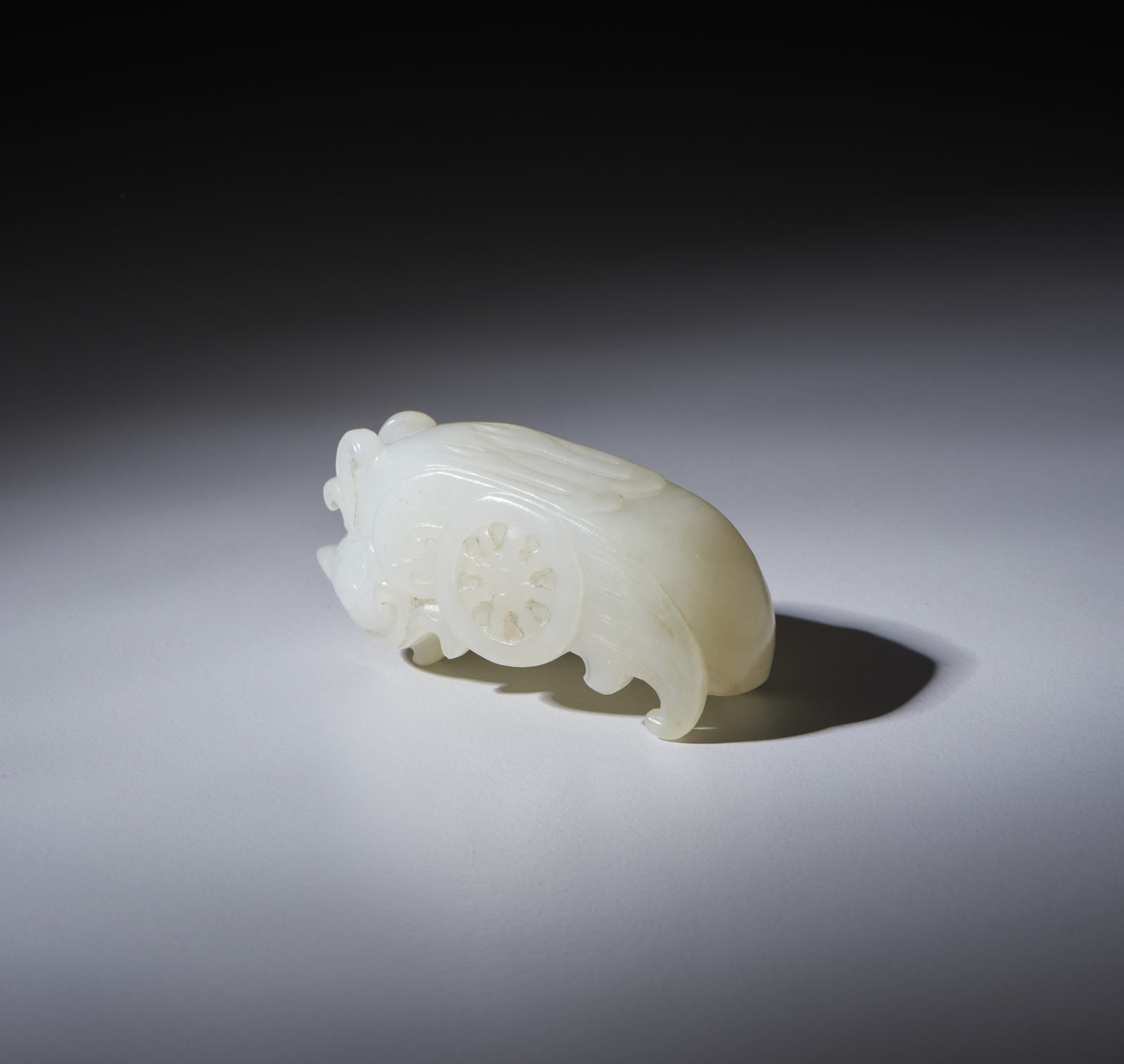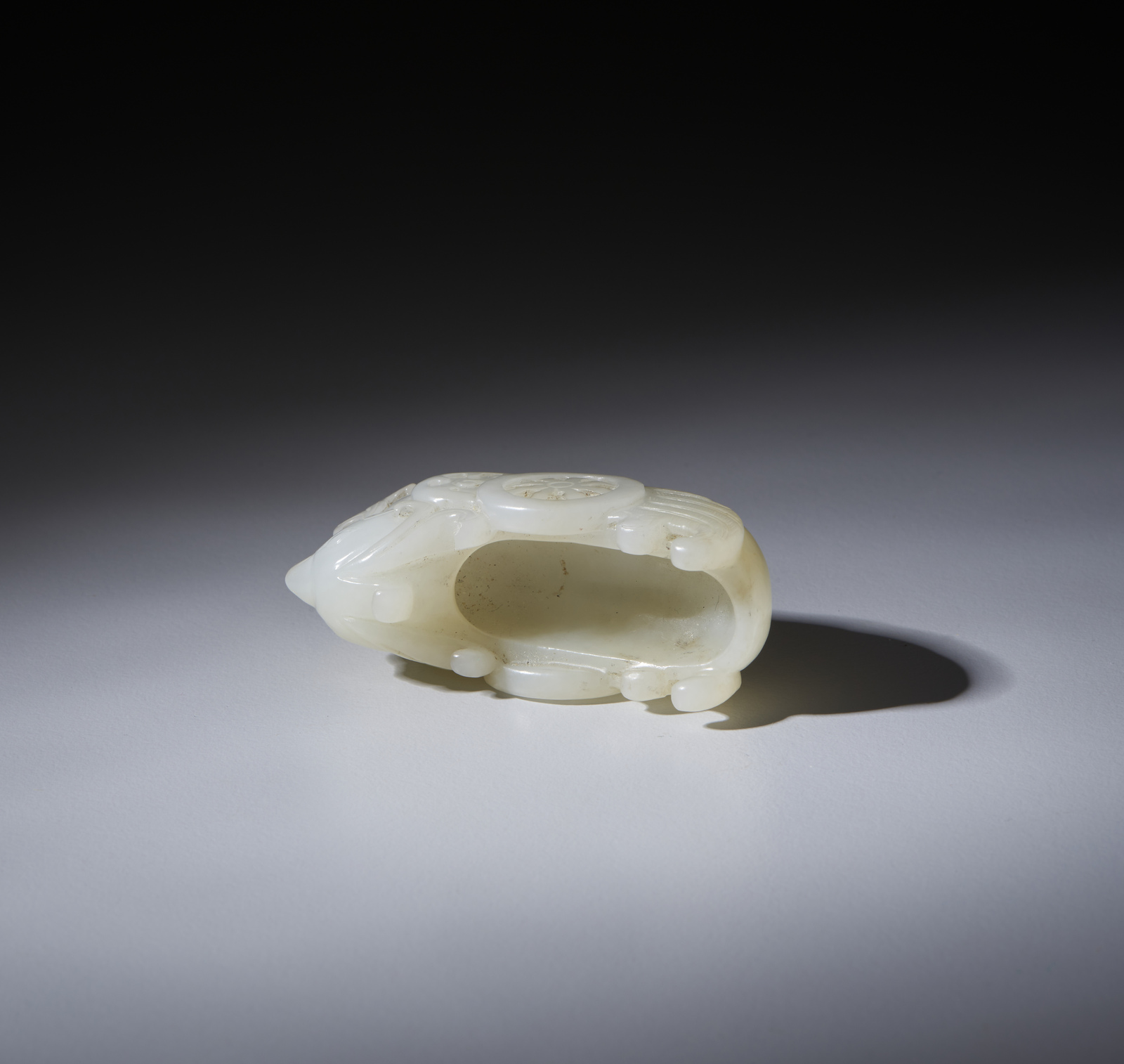 Cina, Qing, XIX secolo. . Cm 6,00 x 3,00. Raffinato intaglio zoomorfo in giada bianca.