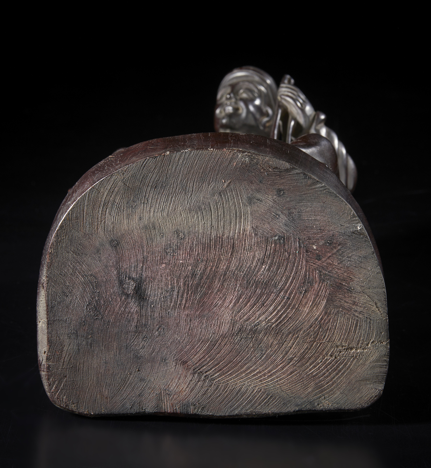 Cina, inizio XX secolo . . Cm 15,00 x 31,00. In legno duro intagliato a delineare una figura seduta con utensili in mano e vicina ad un tavolino. Lunga iscrizione incisa sul retro.
