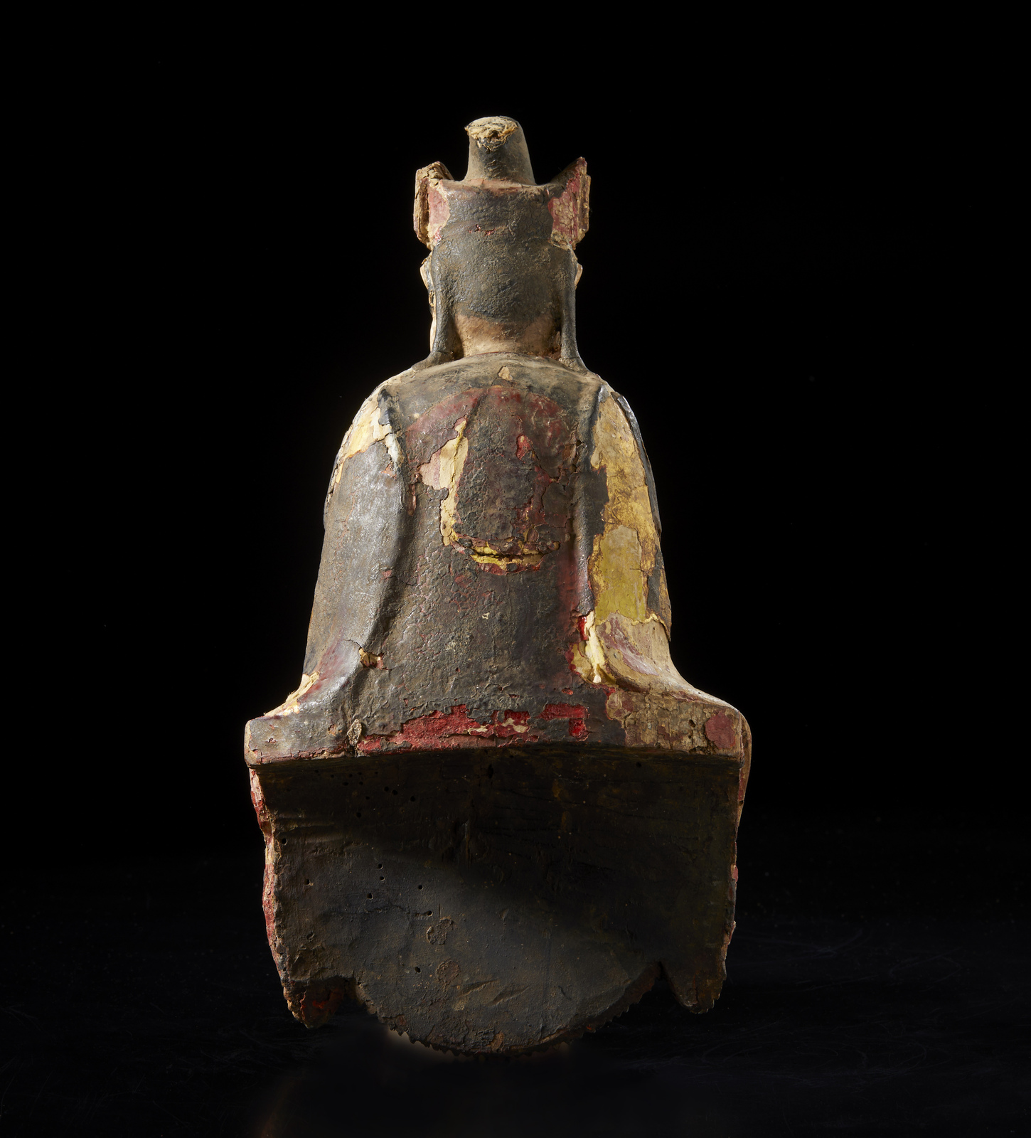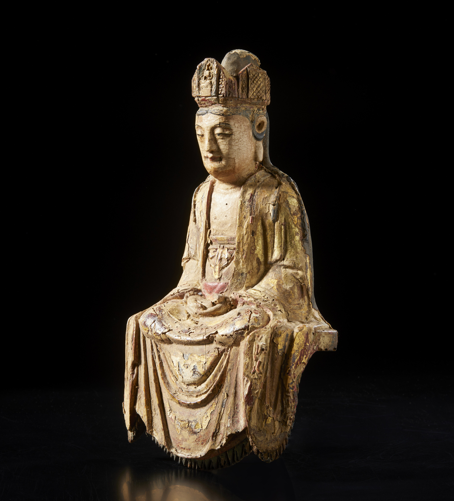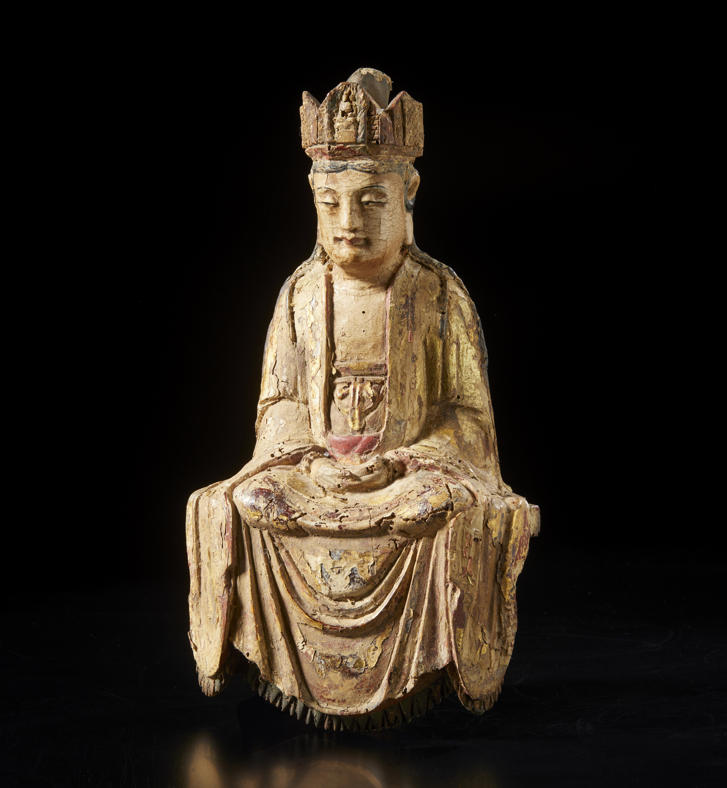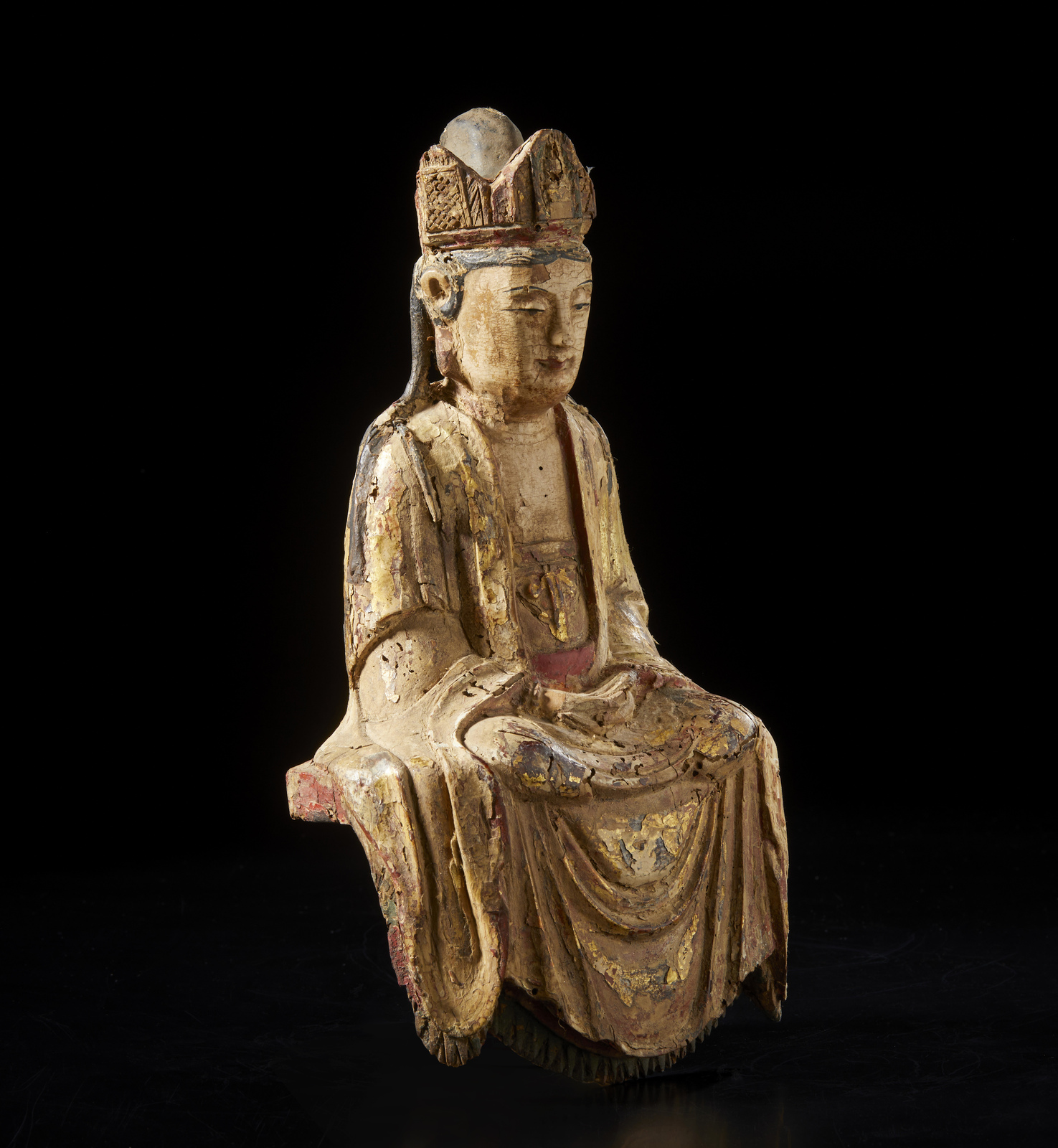 Cina, dinastia Ming, XVI secolo . . Cm 16,00 x 30,50. Raffigurante il Bodhisattva della compassione seduto in padmasana ed abbigliato con vesti regali drappeggiate. Le mani adagiate in grembo in dhyanamudra e la testa coronata.