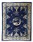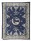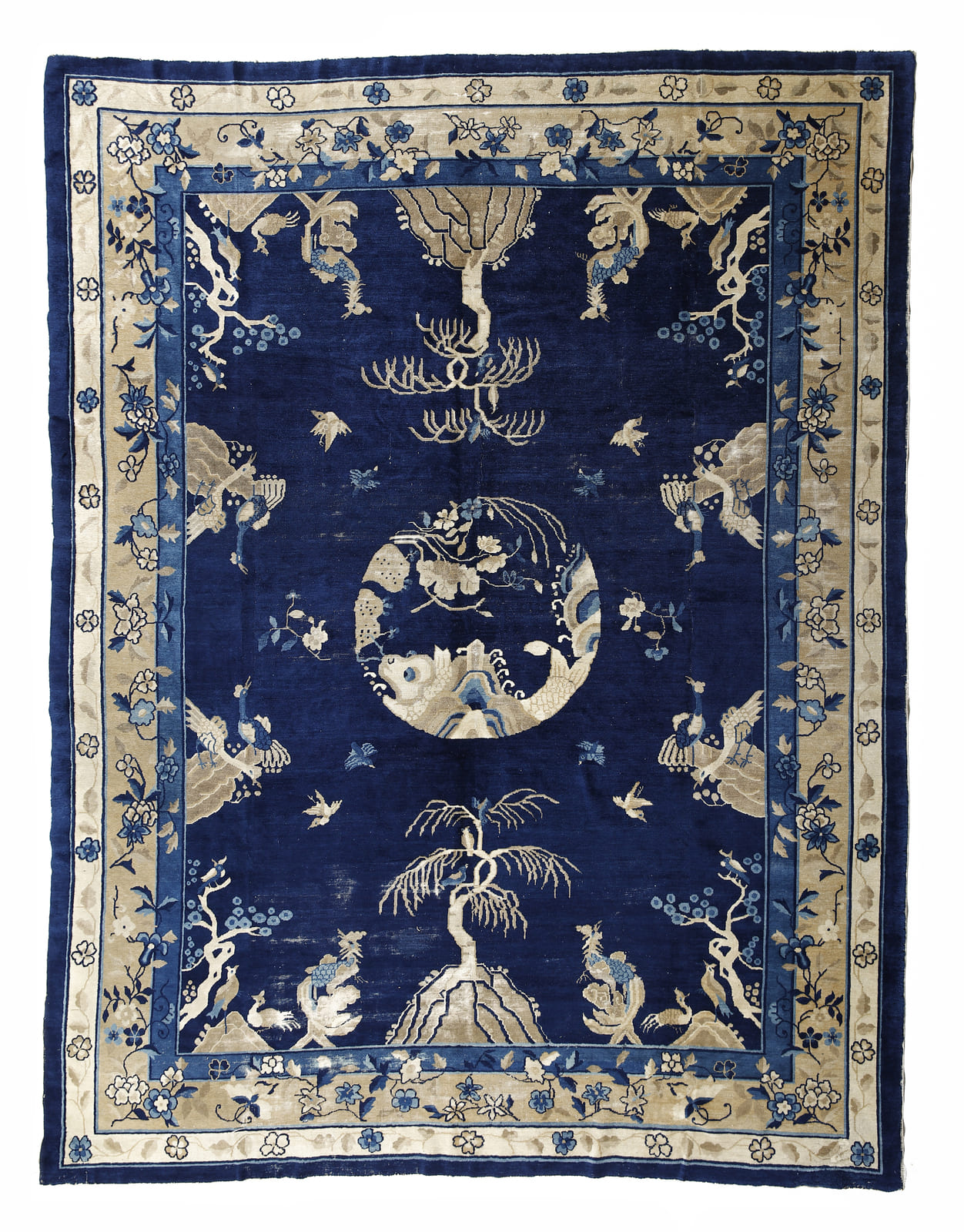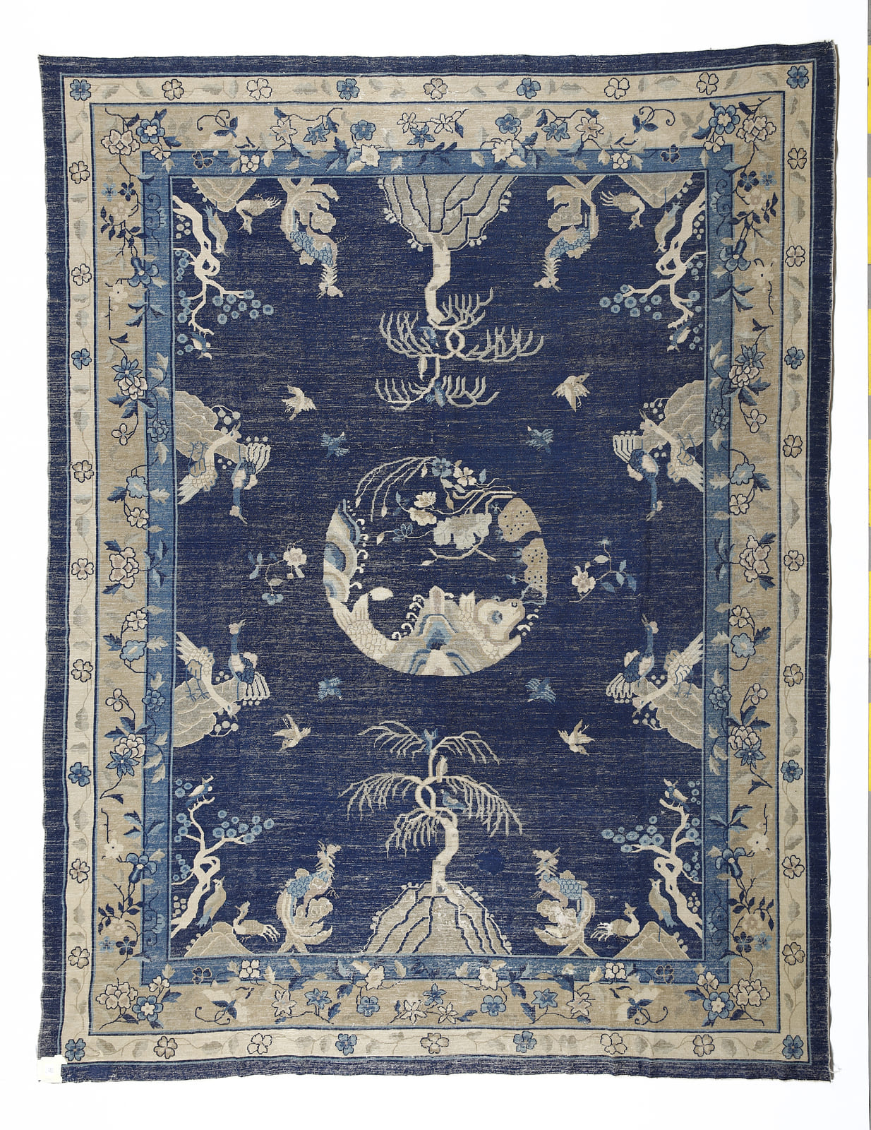 . . Cm 280,00 x 350,00. Vello in lana su cotone raffigurante fenici, gru, rocce, onde e rami fioriti su sfondo blu entro doppia bordura floreale. Nella tradizione cinese le gru simboleggiano longevità e le fenici armonia.