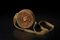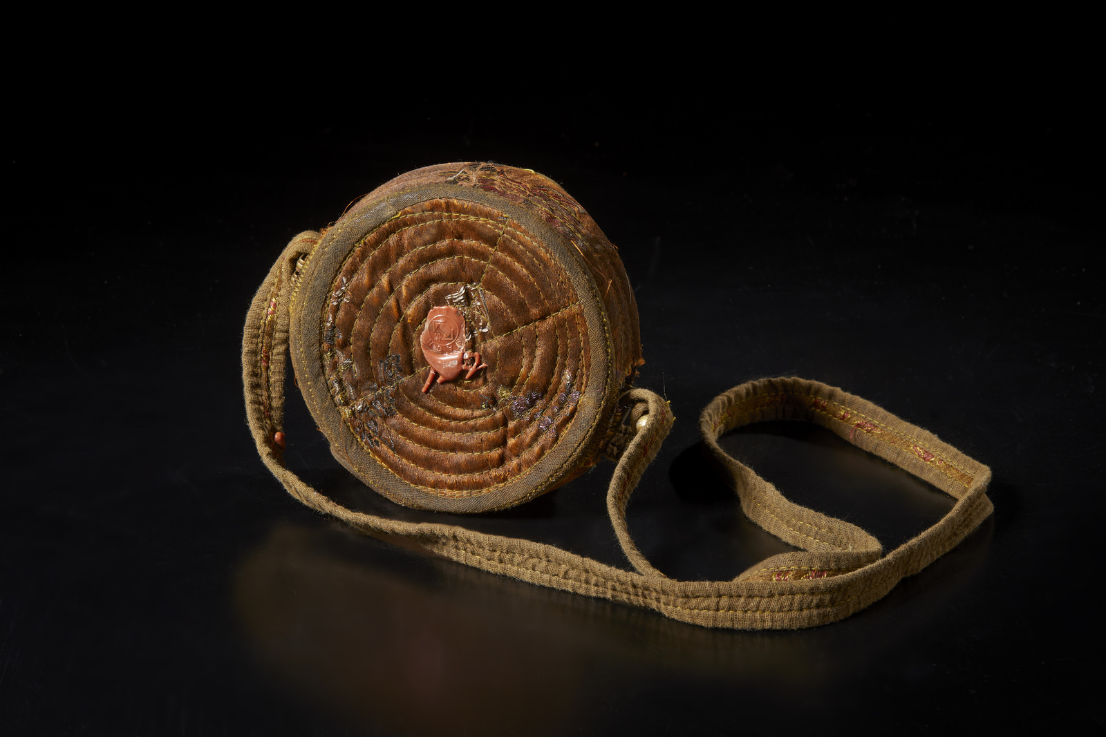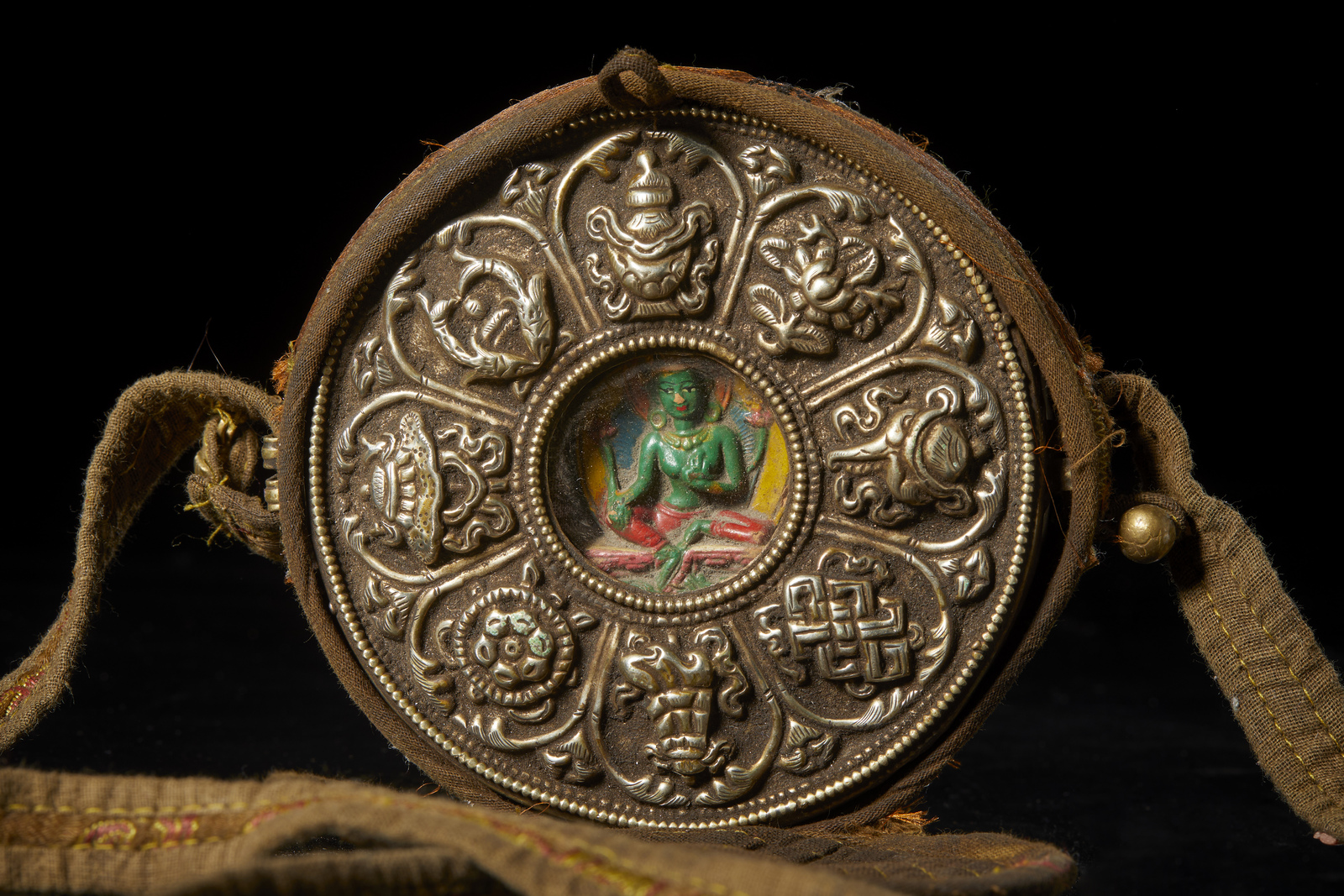 Tibet, XIX secolo . . Cm 13,00. Reliquiario buddista in forma circolare, coperchio incernierato e sbalzato con gli 8 emblemi buddisti disposti intorno alla piccola raffigurazione di Tara Verde.