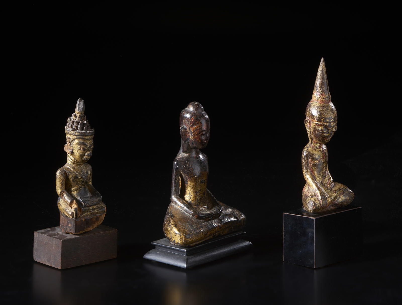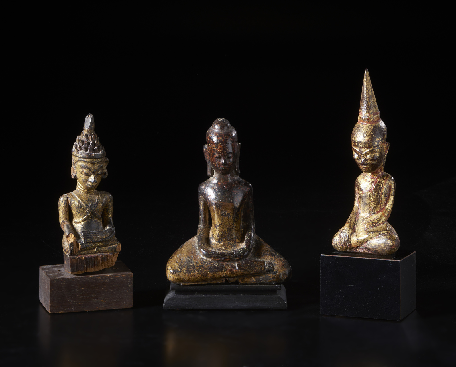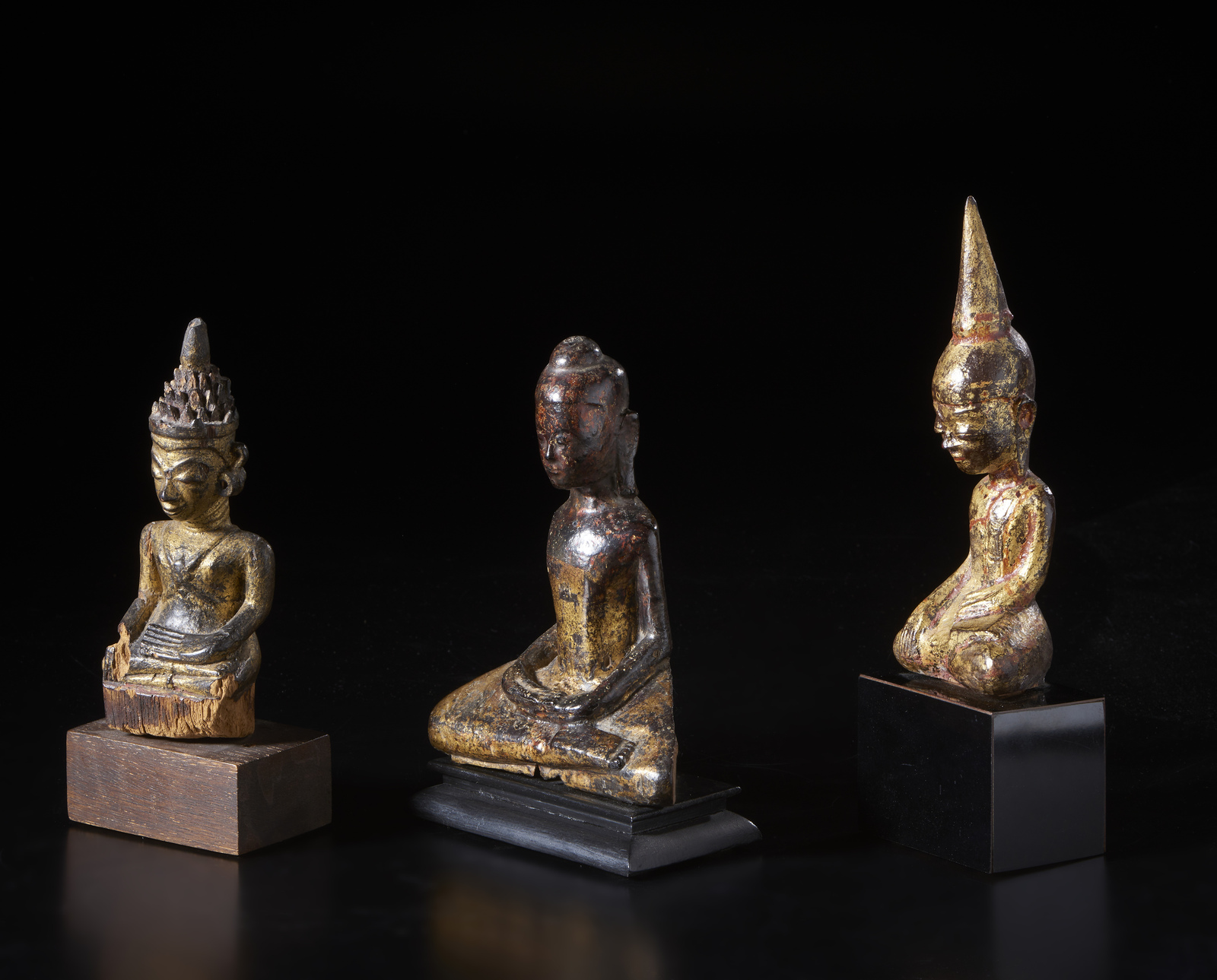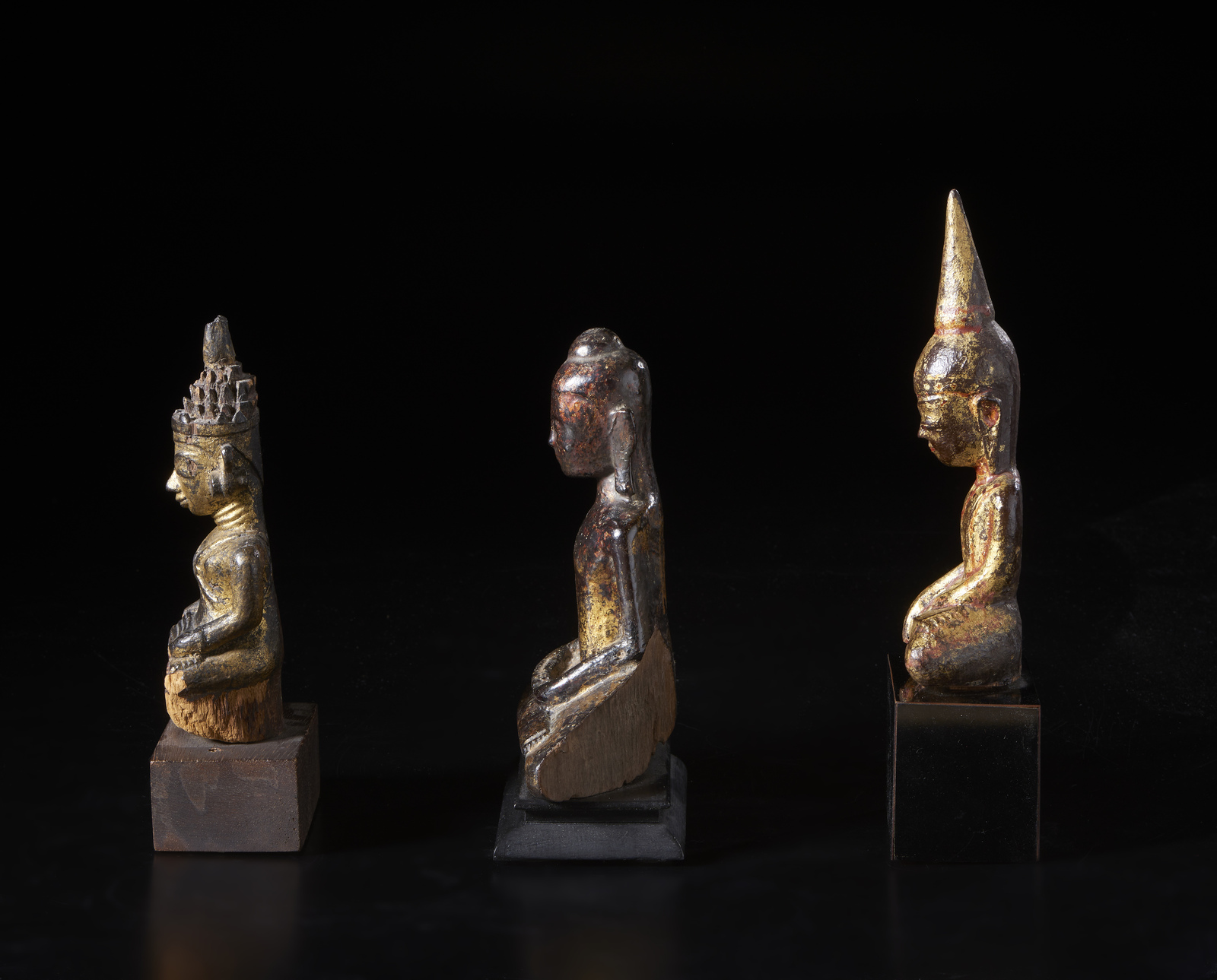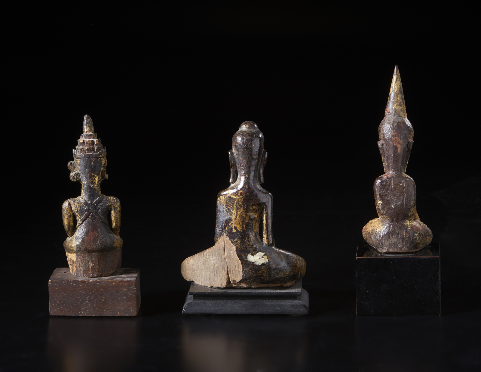 Arte Sud-Est Asiatico - Gruppo di 3 figure di Buddha in legno laccato Sud est asiatico, XIX secolo.