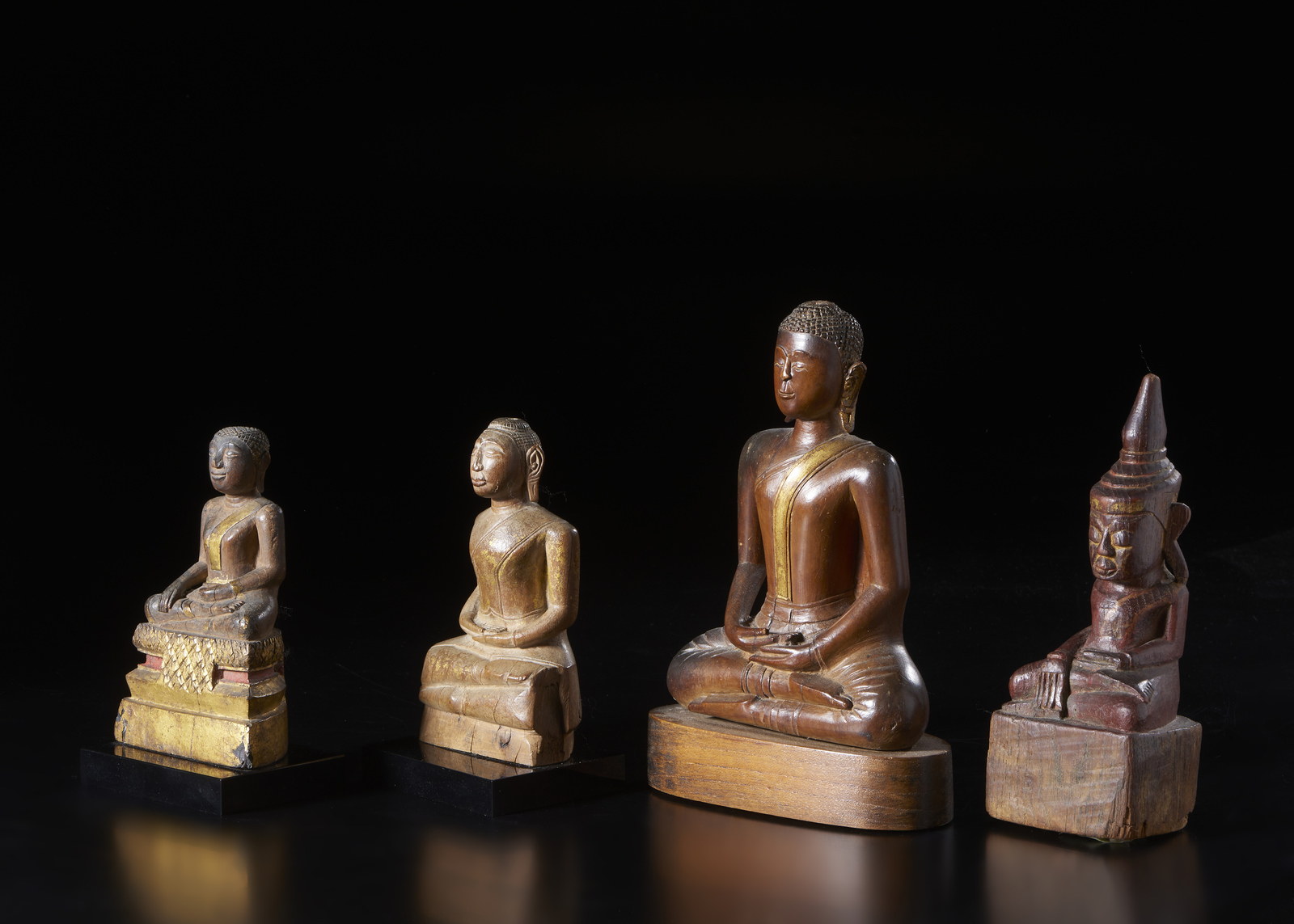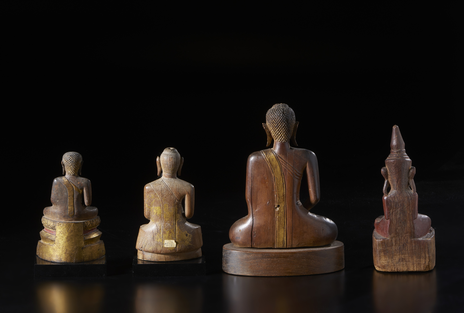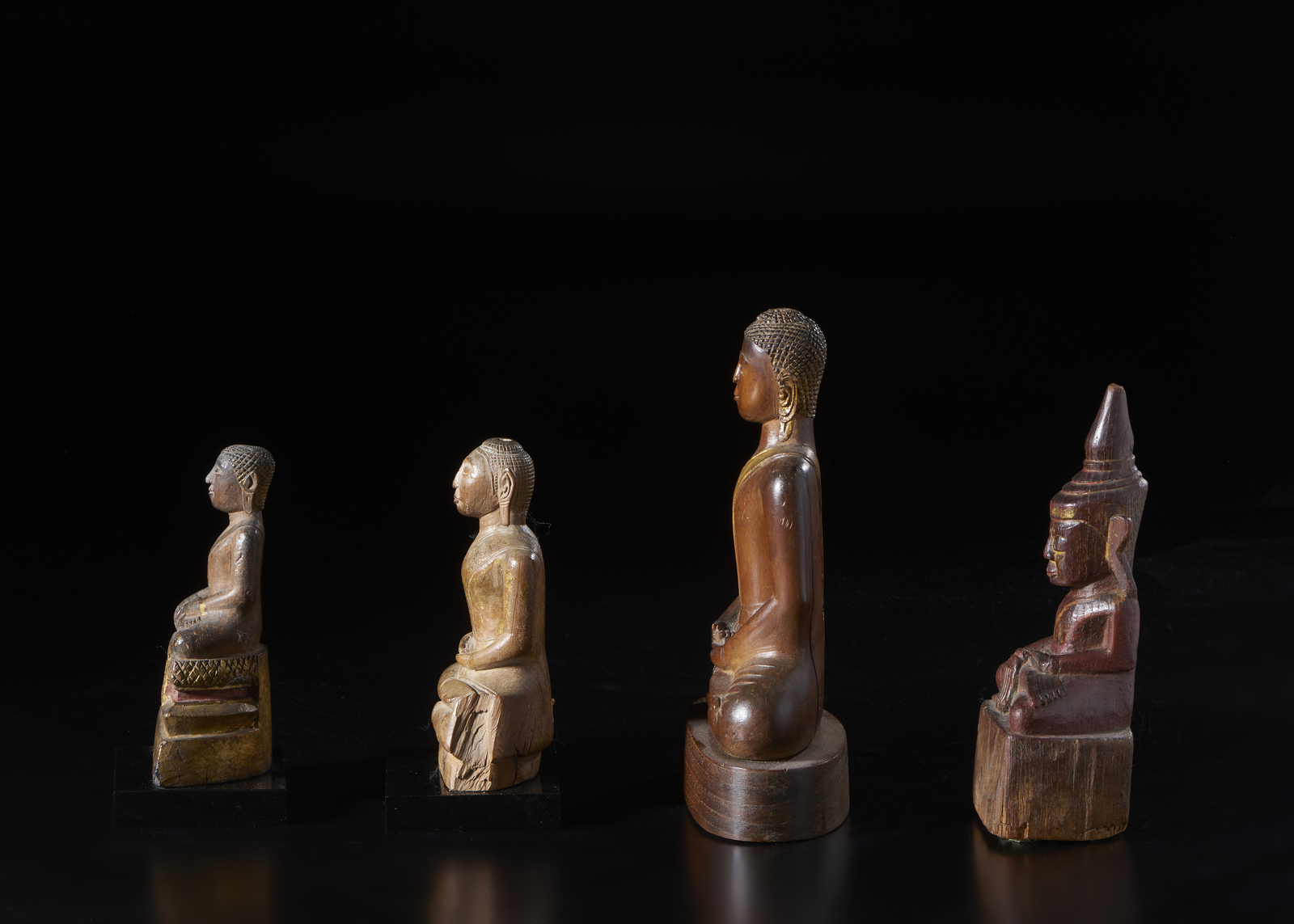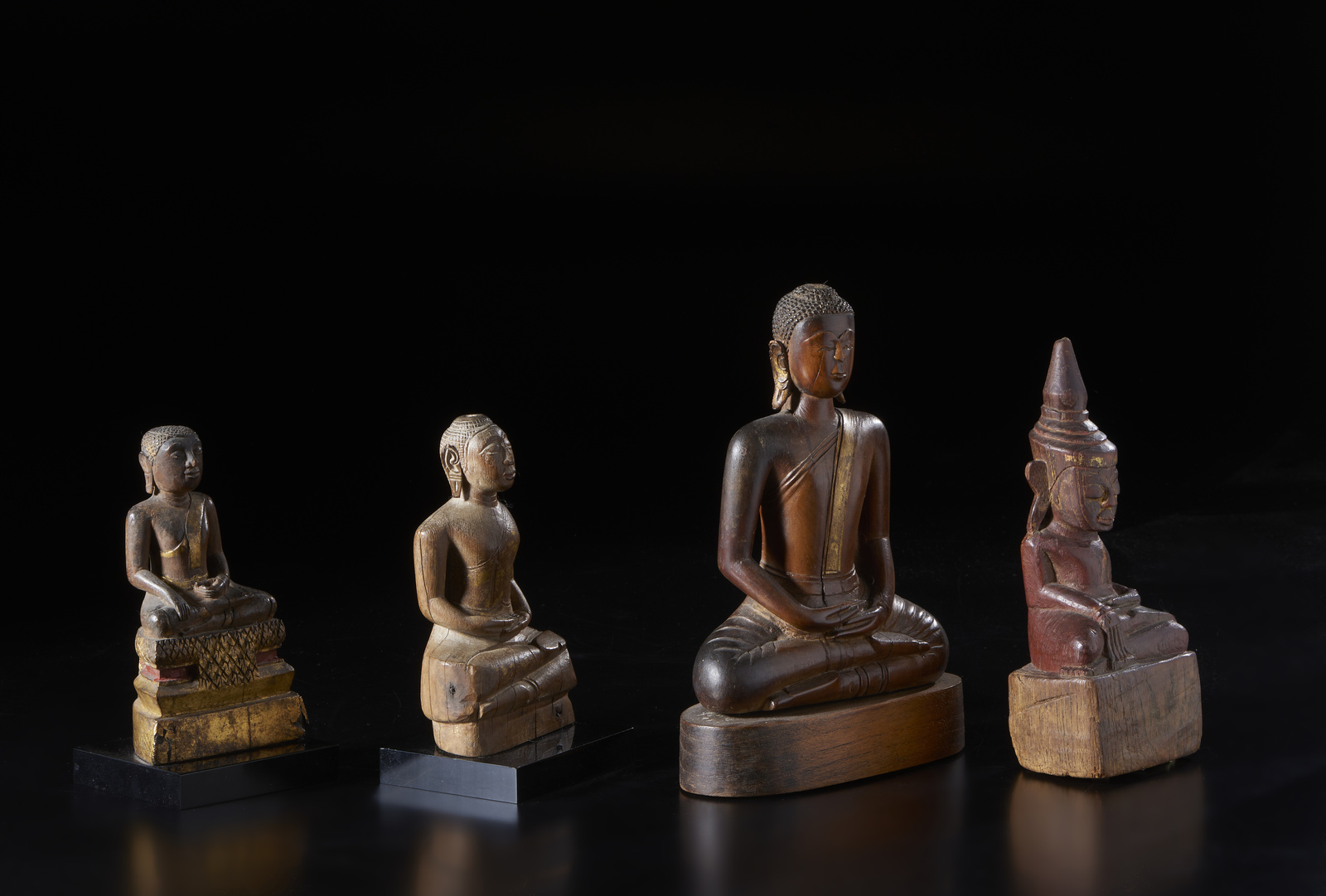 Arte Sud-Est Asiatico - Gruppo di 4 sculture in legno raffiguranti Buddha Sud-Est astiatico, XIX-XX secolo .