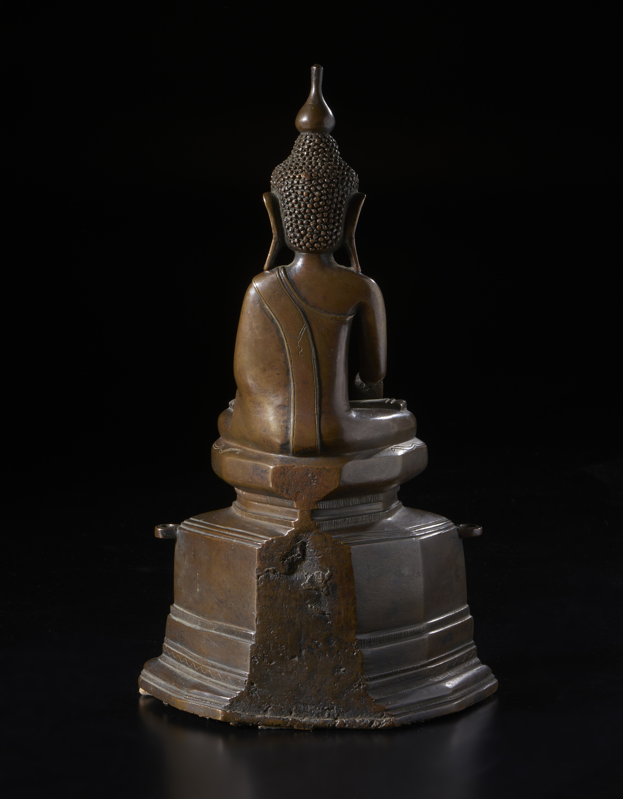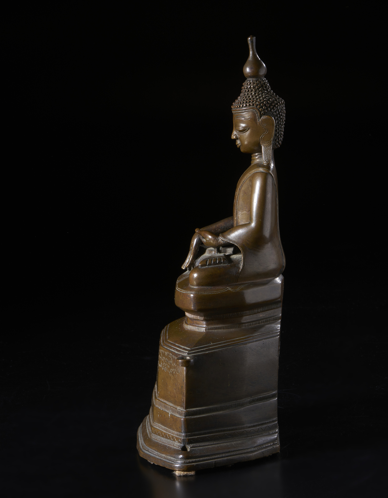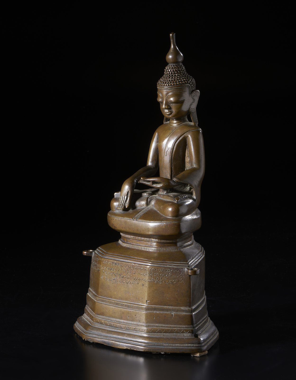 Birmania, XVIII secolo . . Cm 20,00 x 35,00. Fusione in bronzo raffigurante il Buddha storico seduto in padmasana su una base a più livelli, incisa con una lunga iscrizione, probabilmente dedicatoria. La figura indossa una veste monacale che gli lascia scoperta la spalla destra; la sua mano destra in bhumisparsamudra, la sinistra in dhyanamudra.