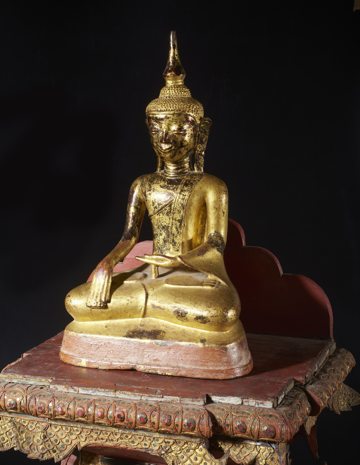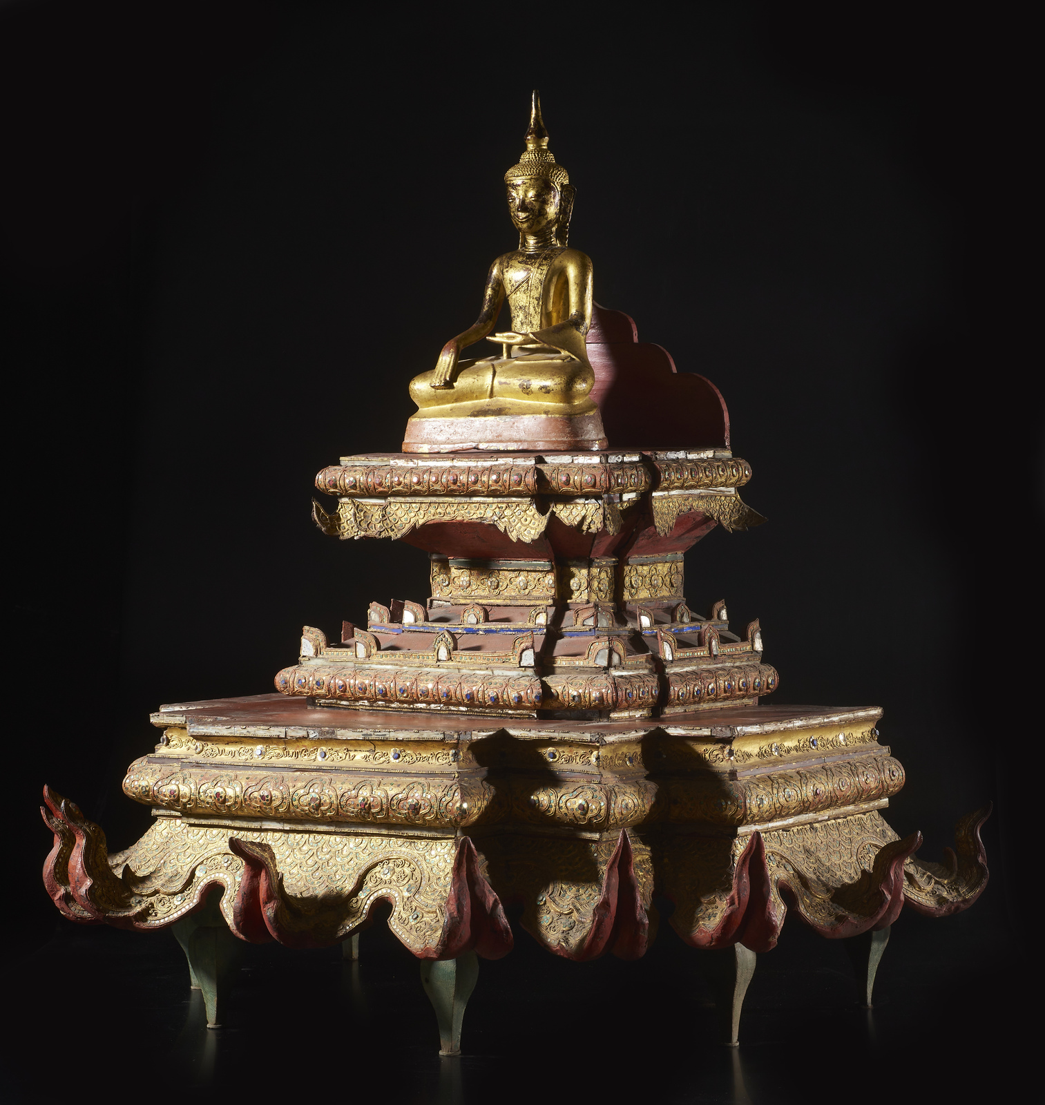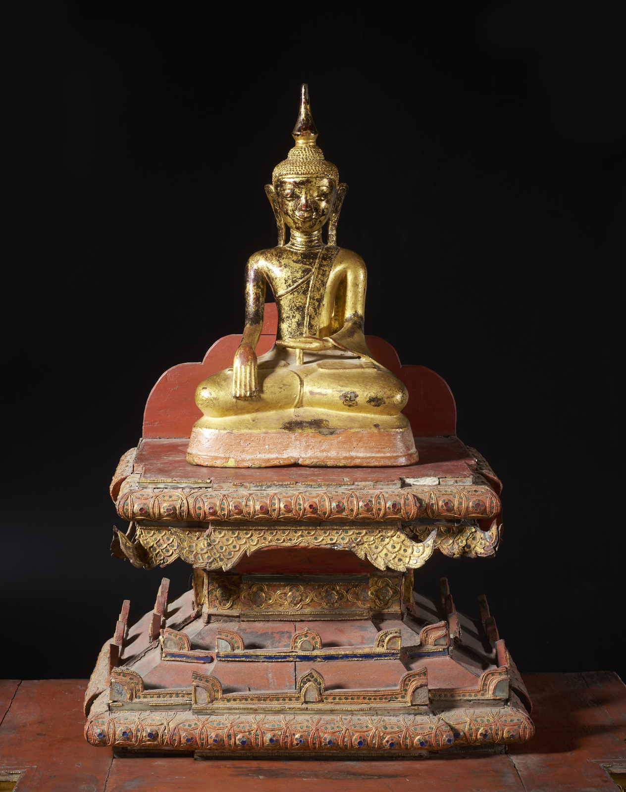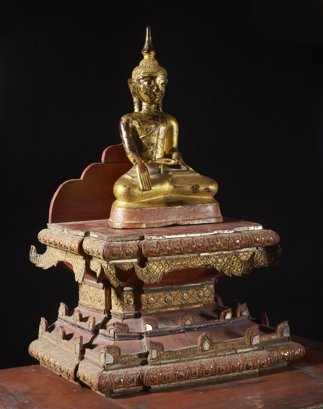 Arte Sud-Est Asiatico - Figura di Buddha su altare Birmania, XVIII - XIX secolo .