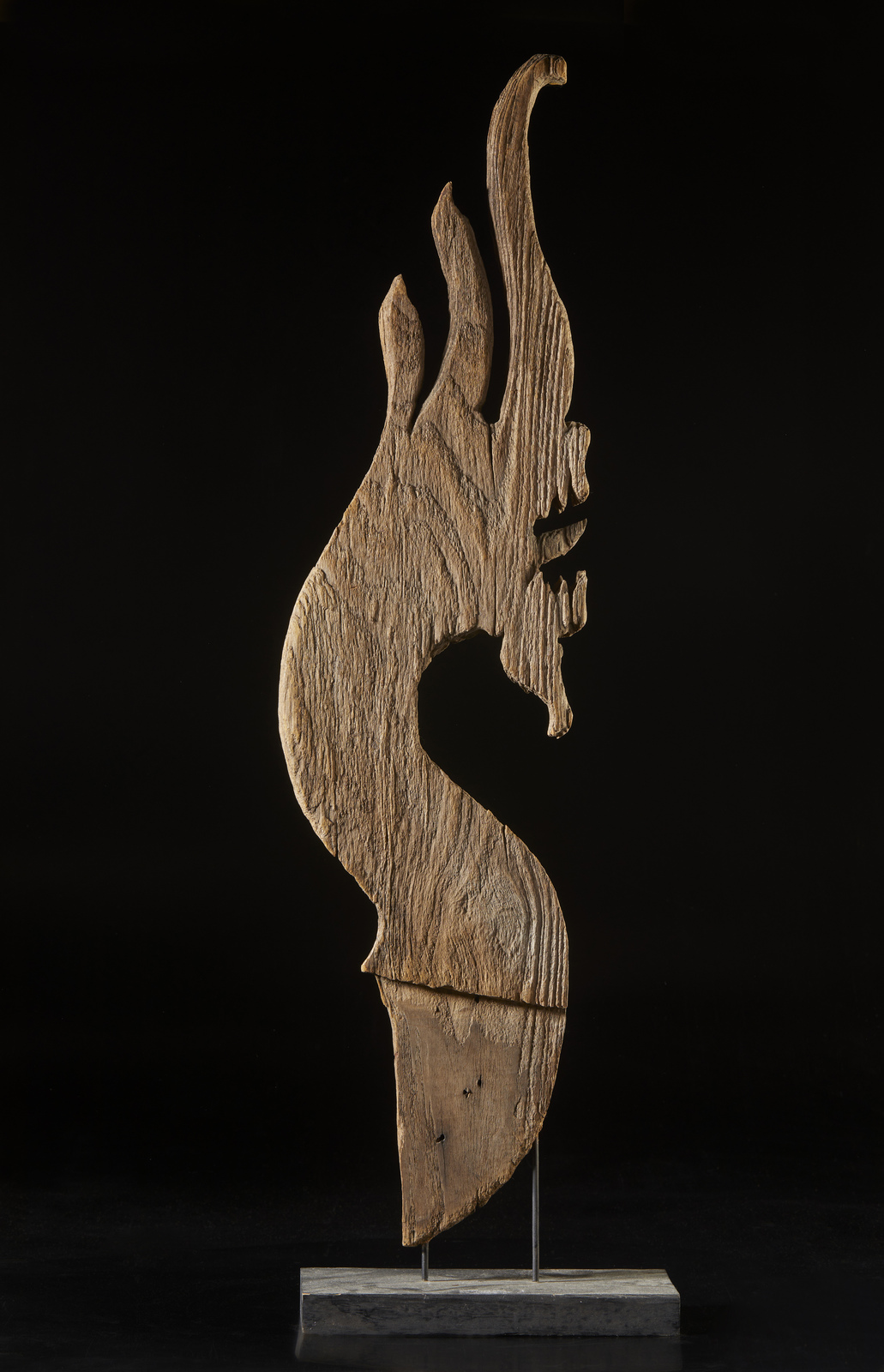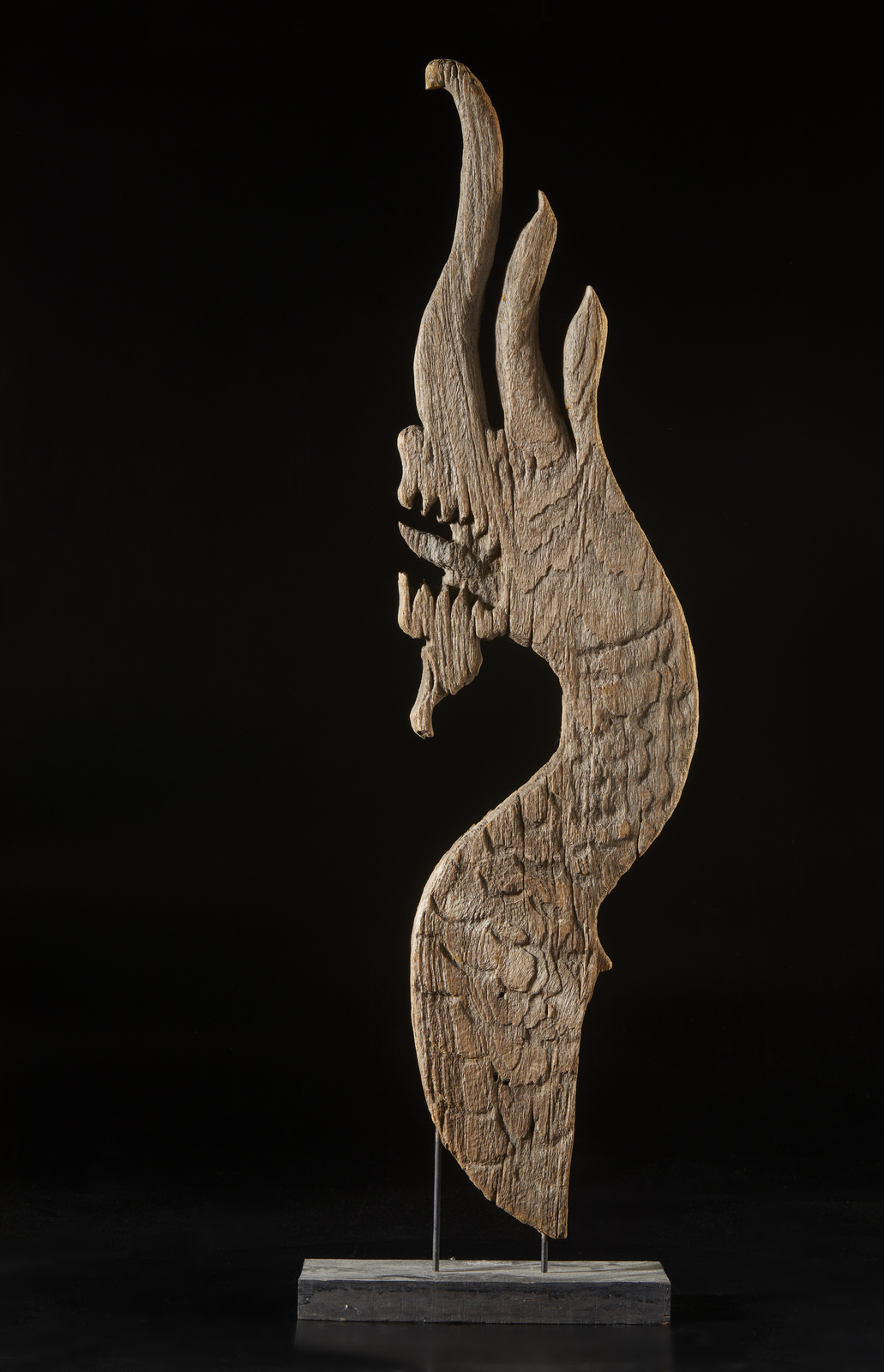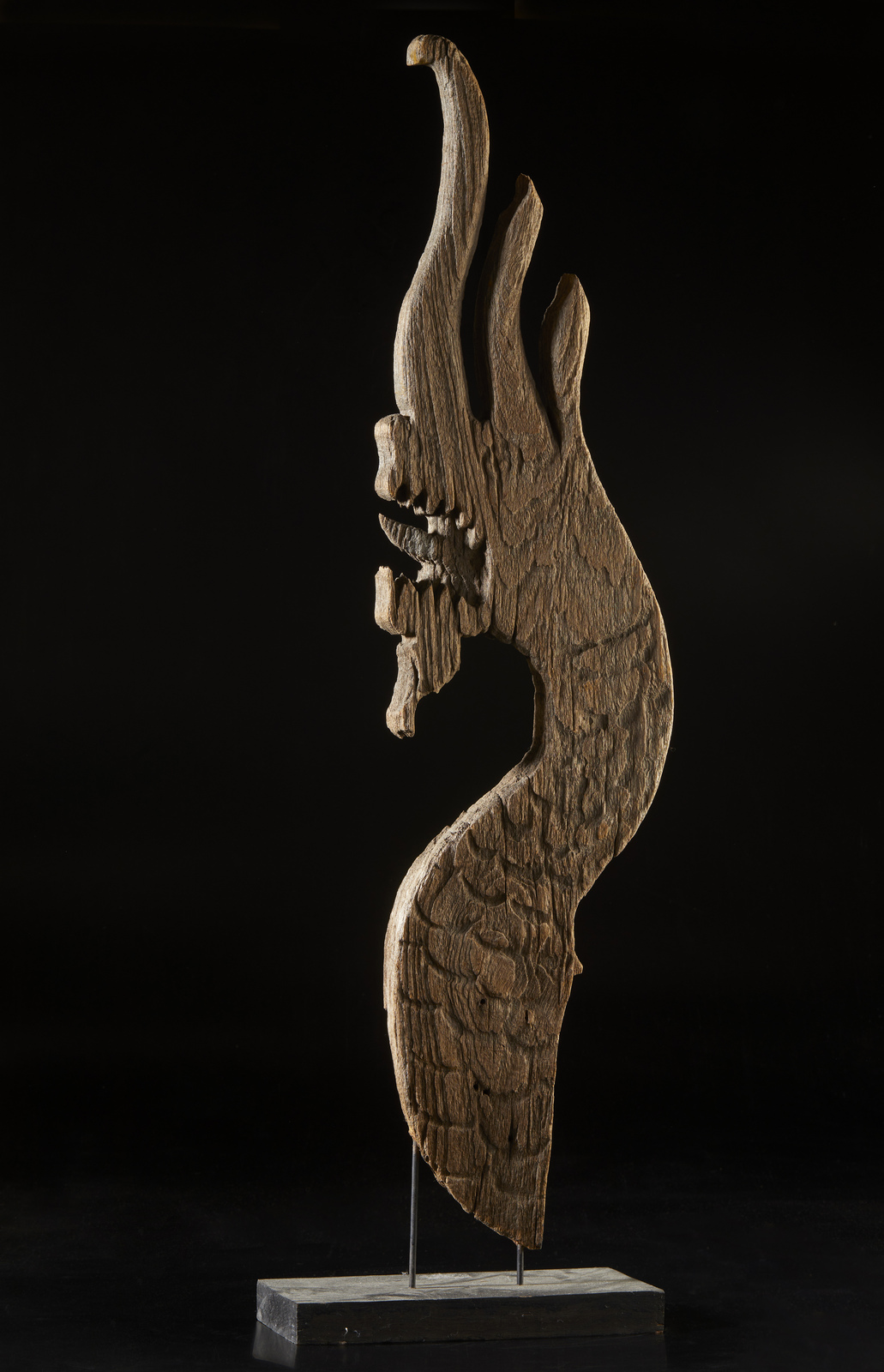 Arte Sud-Est Asiatico - Fragmento di acroterio in legno raffigurante serpente Naga Cambogia o Thailandia, impero Khmer, XIV secolo .