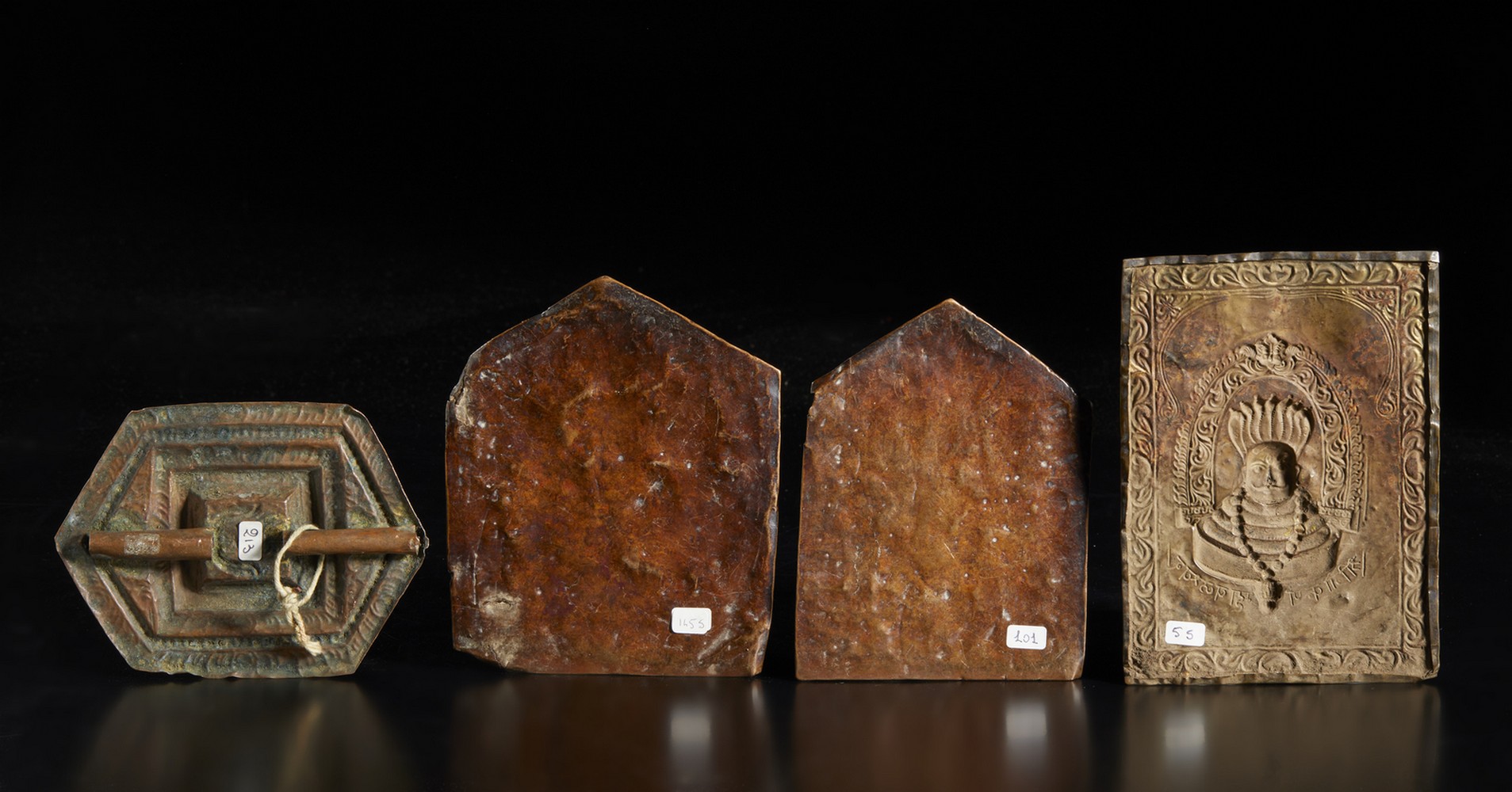 India Meridionale, XVIII-XIX secolo. . Cm 11,00 x 15,50. Include: una placca raffigurante Mukhalinga sormontato da serpenti naga e con iscrizione in devanagari; due placche tribali di cui una raffigurante Khandoba e Banai ed una placca con yoni (?).