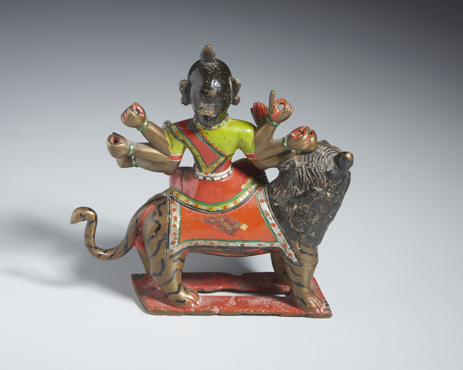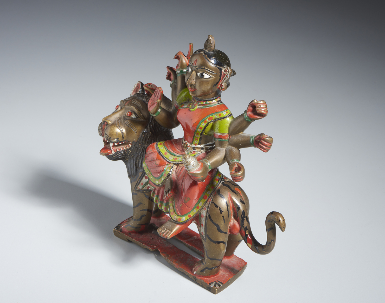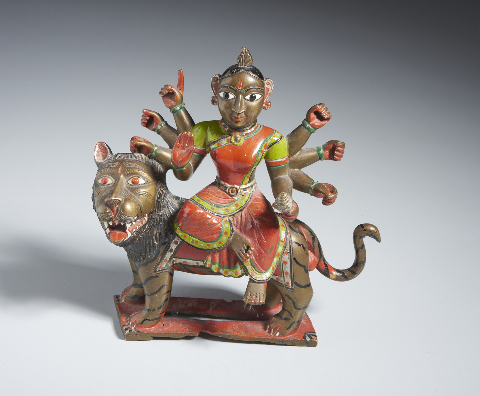 India, tardo XIX-XX secolo . . Cm 21,50 x 20,00. Solida fusione raffigurante la divinità seduta sulla sua cavalcatura, il leone. La figura è nella sua versione multibraccia ed ogni mano soleva impugnare un'arma, oggi mancante.