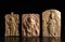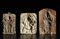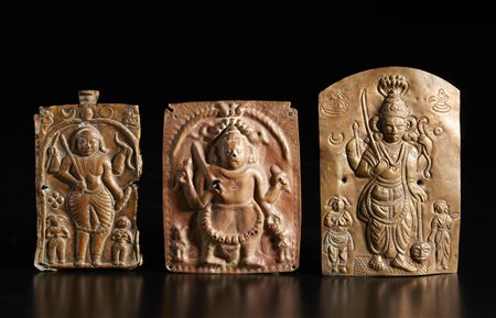 India, XIX secolo . . Cm 15,50 x 22,50. Tre placche sbalzate eseguite secondo l'iconografia classica che prevede la figura di Shiva nella sua versione di guerriero in posizione centrale, affiancanto da Daksha contraddistinto dalla testa d'ariete e da Bhadrakali. Completano la composizione i simboli di sole e luna, uno Shivalinga ed una piccola raffigurazione di Nandi.