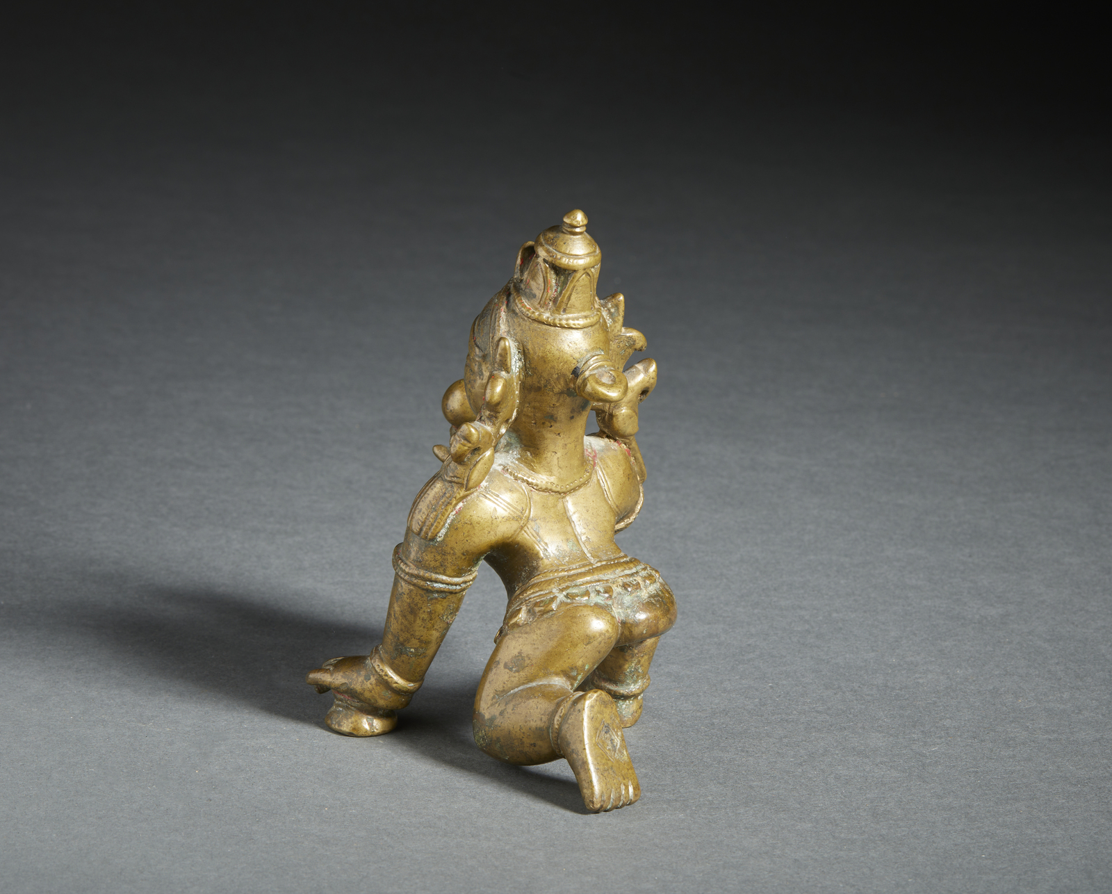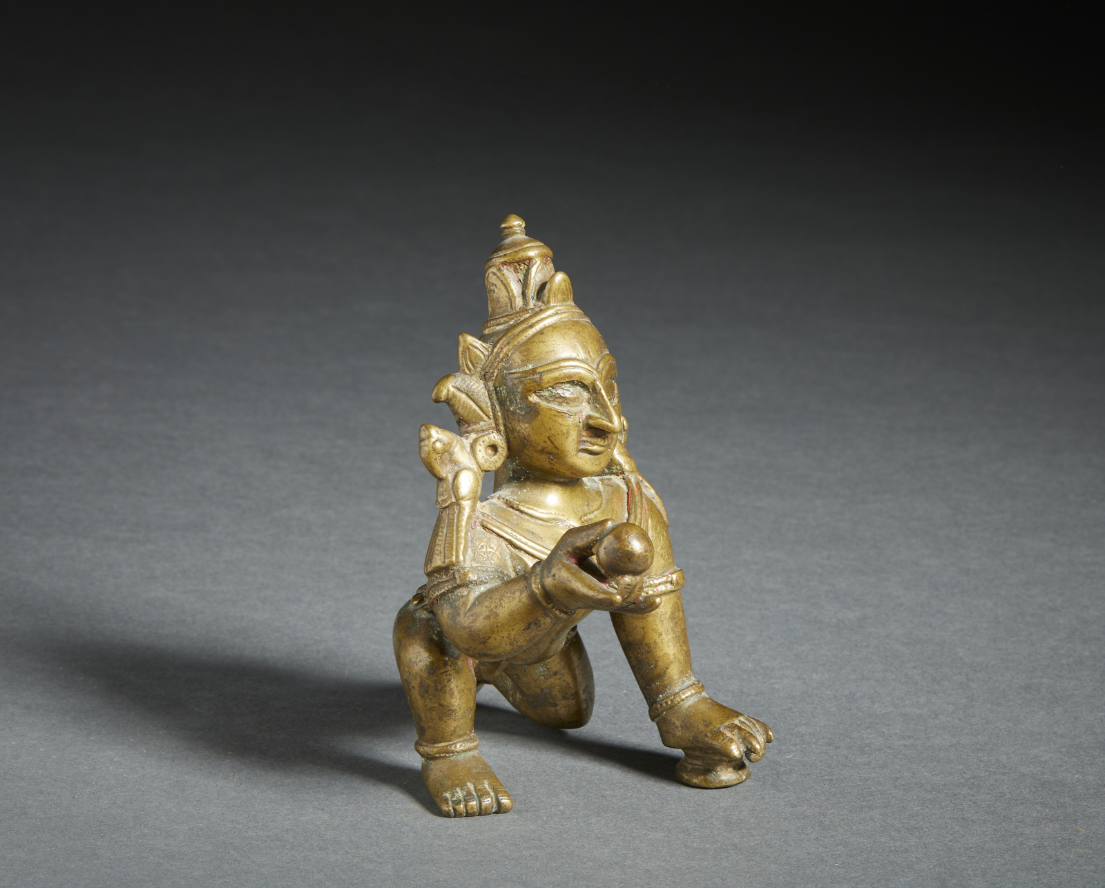 India, Orissa, XIX secolo . . Cm 8,50 x 15,00. Solida fusione raffigurante la divinità bambino a carponi con l'iconica palla di burro nella sua mano destra. Gli occhi erano originariamente intarsiati.