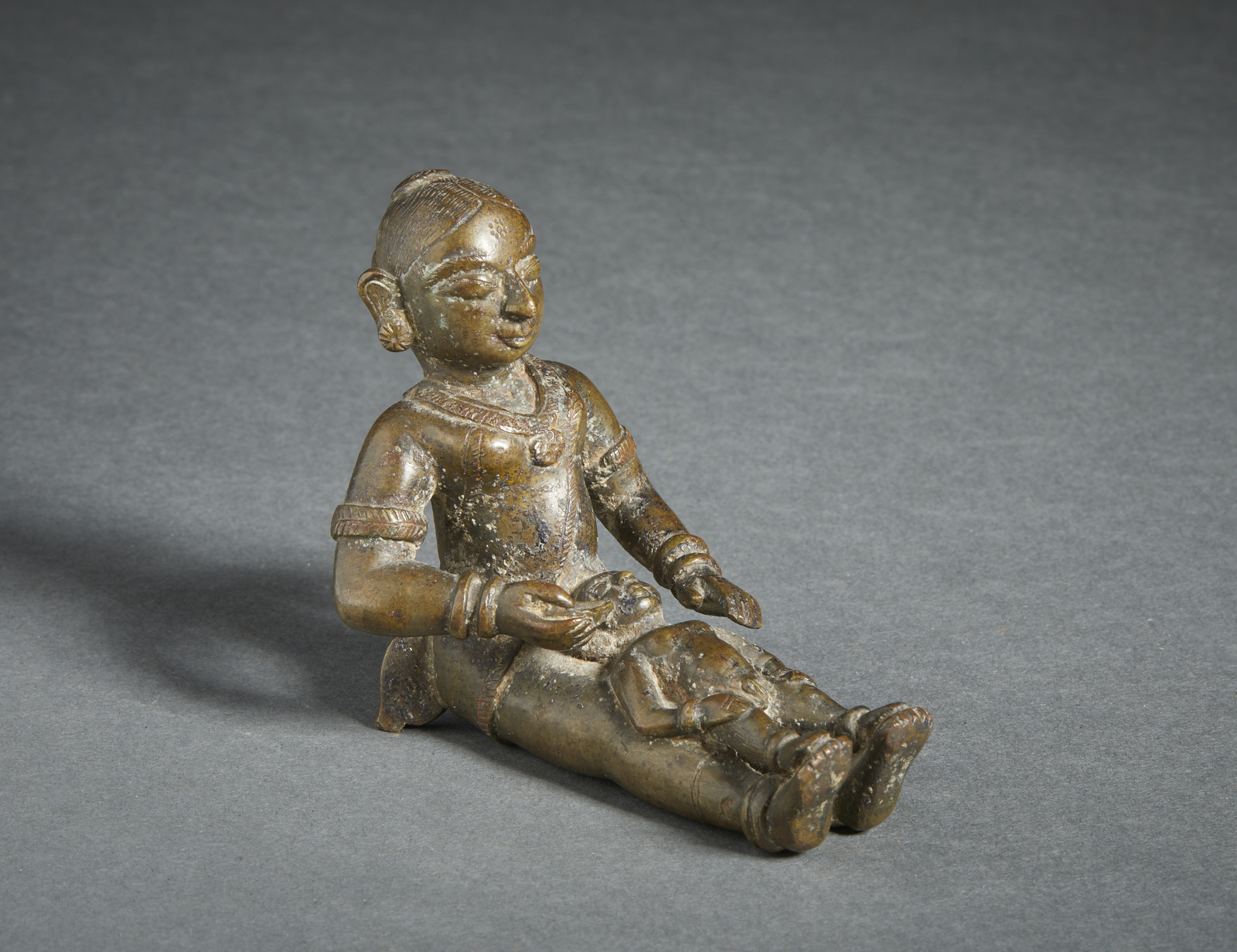 India, probabilmente Orissa, XVII-XVIII secolo . . Cm 6,00 x 8,00. Fusione in bronzo a patina scura raffigurante la divinità protettrice dei bambini seduta con un bambino sulle gambe tese.