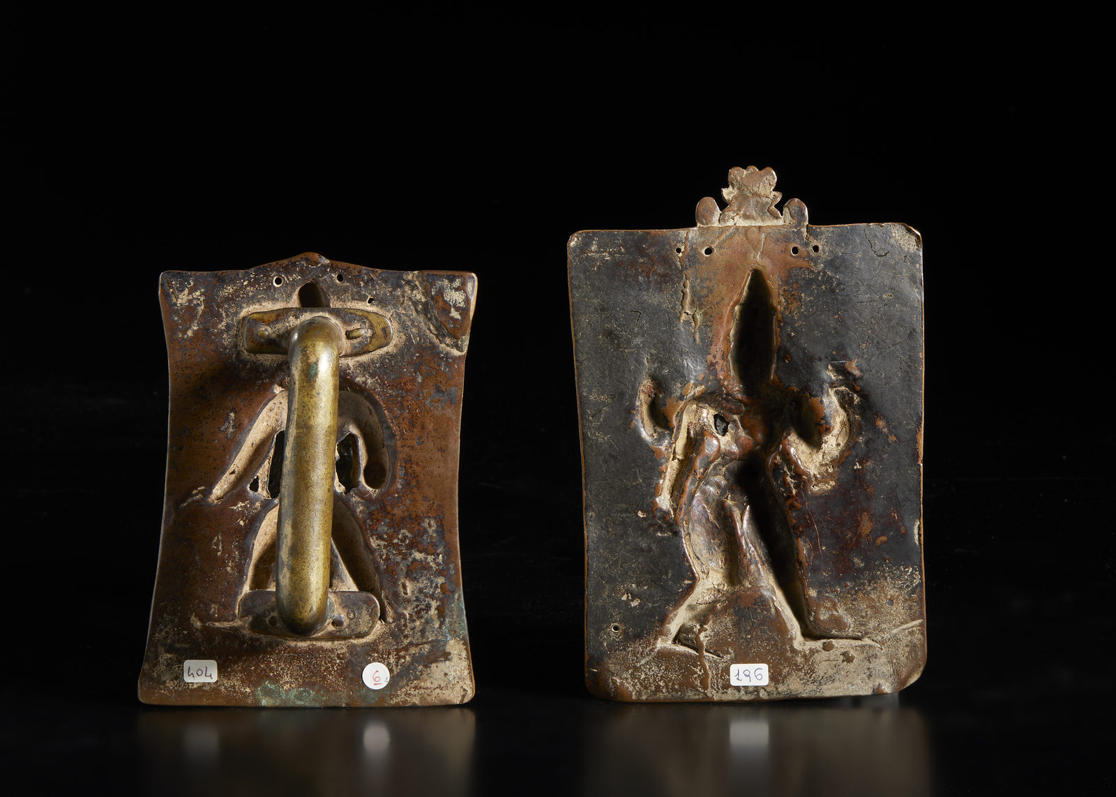 India Meridionale, XVIII secolo . . Cm 13,00 x 20,00. Due placche in fusione raffiguranti Shiva guerriero nella sua iconografia classica.