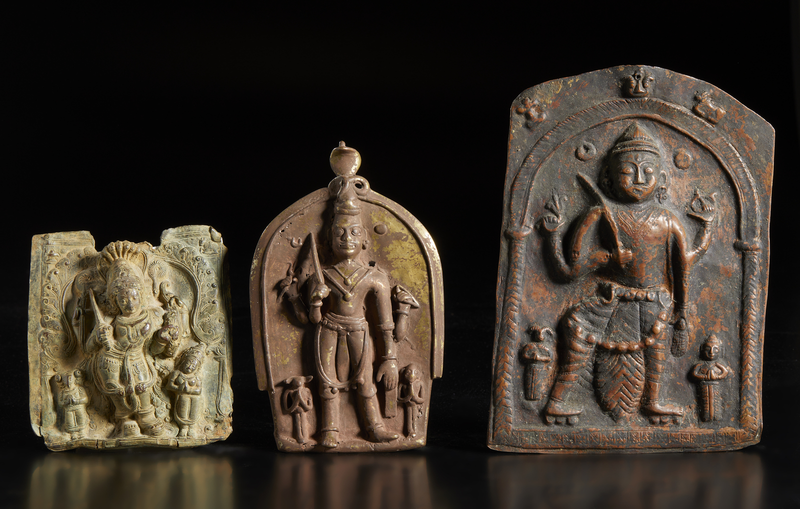 India Centrale e Meridionale, XVIII-XIX secolo . . Cm 17,00 x 25,00. Include: Una placca di manifattura tribale; una placca in fusione forse proveniente dalla zona del Deccan ed una placca Karnataka in metallo sbalzato. Le misure indicate si riferiscono alla placca più grande, le altre misurano: 20 x 12,5 cm e 14 x 13 cm.
