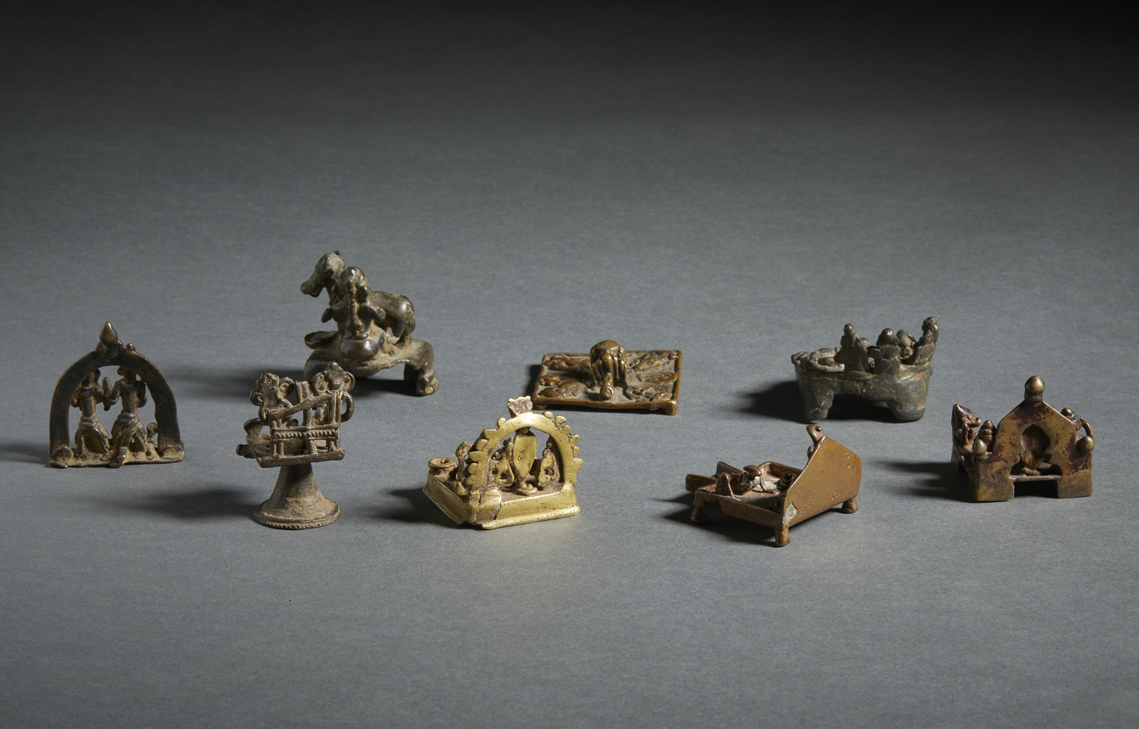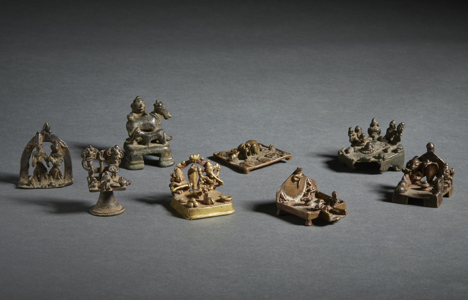 India e India popolare, XVIII - XIX secolo . . Cm 5,00 x 6,00. In fusione metallica, tutti raffiguranti la forma aniconica di Shiva con yoni, offerte ed offerenti.