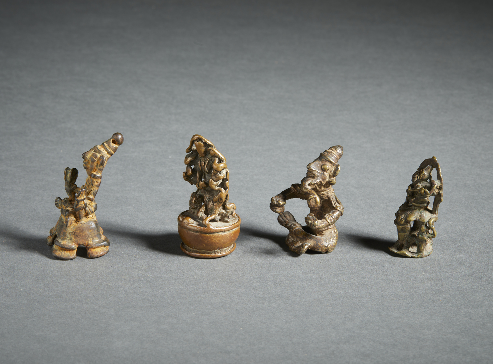 India, XVIII-XIX secolo . . Cm 3,50 x 6,50. Include: 2 raffigurazioni di Durga, di cui una Mahishasura; una fusione in bronzo raffigurante Ganesh ed un uomo in armi seduto.