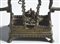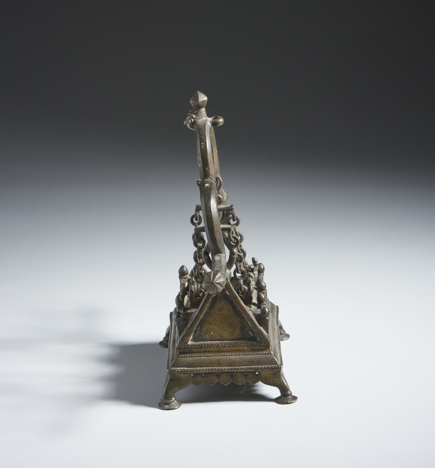 India, XIX - inizio XX secolo . . Cm 30,00 x 24,00. Bronzo devozionale strutturato in forma di altalena con altare centrale, sospeso con catena. Manca la divinità principale.